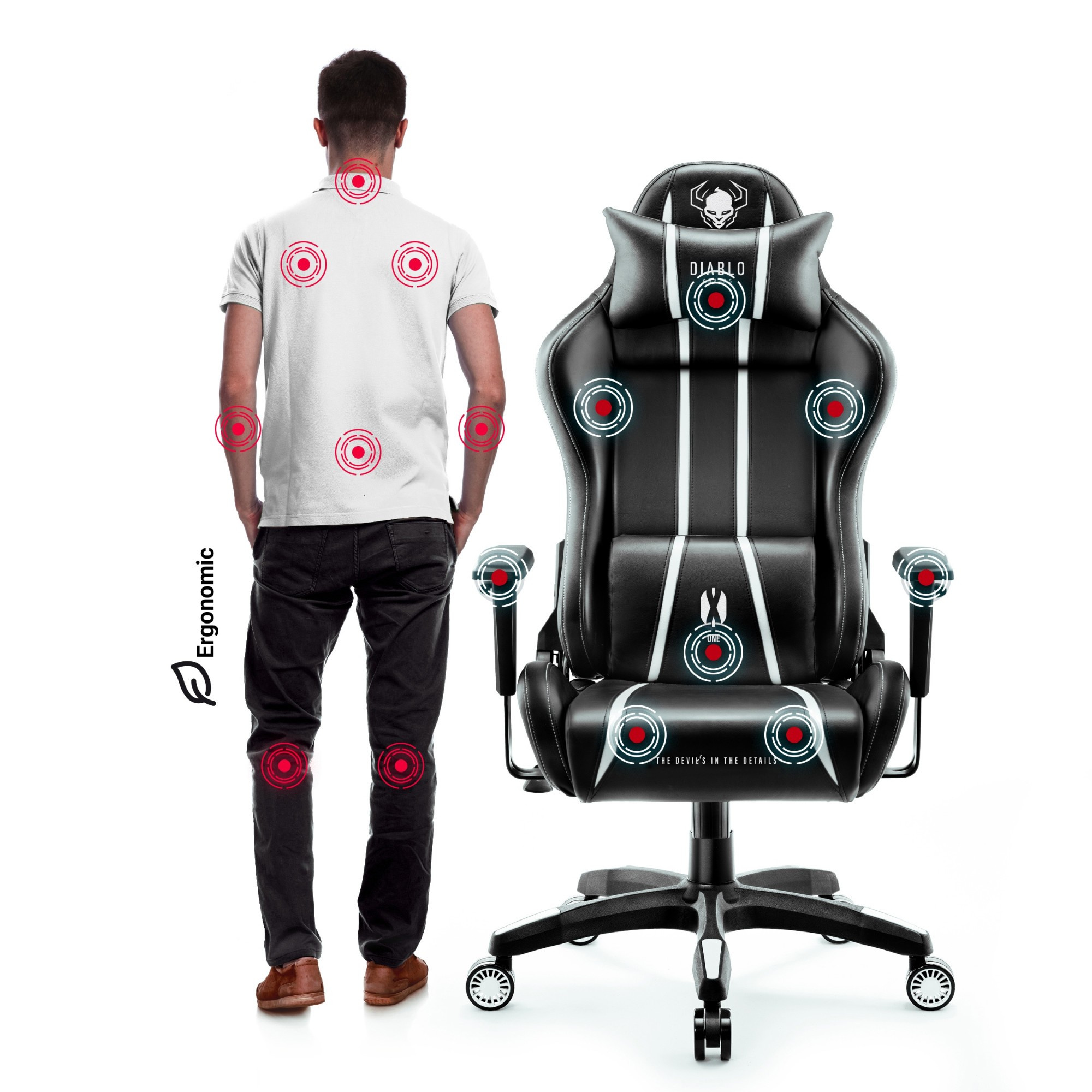 Vlastnosti: Bestsellerový model křesel Diablo Chairs Velké a pohodlné křeslo, vhodné pro vysoké hráče Tvar podporující vaši páteř Pohodlné polštáře s možností nastavení Výplň z měkké HR pěny Vysoce kvalitní, odolná ekokůže Područky nastavitelné nahoru-dolů Maximální zatížení do 160 kg Herní křeslo ČERNO-BÍLÉ NOVÉ GENERACE - X-ONE 2.0 Před tebou je inovativní herní křeslo. Model Diablo X-One 2.0 ve verzi KING SIZE zajišťuje individuální komfort a dokonale spolupracuje se siluetou, takže pokud potřebujete ergonomická řešení ve zvětšené podobě, určitě se blíže seznamte s naším průlomovým herním křeslem.PŘIZPŮSOBENÝ TVÝM POTŘEBÁM Herní křeslo černobílé v rozměru KING je ideální pro vysoké osoby, které potřebují větší oporu pro optimální fungování po dlouhé hodiny.Diablo X-One 2.0 KING zaručuje jednoduché a přesné nastavení nahoru-dolů. Díky tomu přizpůsobíš křeslo výšce a výšce stolu.Spolehlivý systém Tilttech™ Swing umožňuje bezpečné a relaxační houpání.Černobílá herní židle Diablo X-One 2.0 umožňuje naklonění opěradla do 140° a zablokování v zvolené poloze. Získáváš komfort na nejvyšší úrovni.DYNAMICKÝ A VÝRAZNÝ Kbelíková konstrukce a úchvatná kombinace hluboké černé s výraznou bílou dodá každé místnosti neobyčejný, herní charakter. Sportovní, dynamická silueta ti zajistí další zážitky z každé hry. Výrazné emblémy Diablo způsobují, že masky a čalounění vypadají mimořádně originálně a zaujmou na první pohled.ČALOUNĚNÍ NEJVYŠŠÍ KVALITY Před tebou je mnoho let používání bez viditelných známek opotřebení. Čalounění z ekokůže HDS™ je spolehlivý materiál, který vás překvapí neobvyklou odolností proti oděru. Díky pevným nitím je ekokůže správně napnutá, což zajišťuje její vynikající vzhled po dlouhá léta.SPOLEHLIVÉ VYPLNĚNÍ Celé čalounění jsme podšili maximálním množstvím měkké pěny HR, díky čemuž je černo-bílá herní židle Diablo X-One 2.0 je mimořádně pohodlný a poskytuje dosud nevídaný komfort. Můžeš si být jistý, že tvoje nová herní židle, i po mnoha letech používání, zůstane bez promáčklin a deformací.ERGONOMICKÁ OPĚRKA HLAVY Dobře víme, že správná poloha při práci, studiu nebo zábavě u stolu je zárukou zdravé páteře. Postarali jsme se o tvou postavu a vybavili černobílou herní židli Diablo X-One 2.0 v jedinečné čelo postele, které aktivně podporuje krční páteř při udržování bezpečné a zároveň pohodlné polohy. Díky pohodlné opěrce hlavy vyplněné měkkou pěnou HR se vyhneš přijetí škodlivé polohy, což dlouhodobě ochrání tvůj krk a podpoří záda v horní části.PODUŠKA BEDERNÍ Teď bude dolní část páteře aktivně podporována inovativní bederní poduškou, se kterou záda automaticky zaujmou správnou, bezpečnou polohu. Regulovatelný polštář vyplněný HR pěnou zajišťuje, že páteř v bederní oblasti je dokonale chráněna před vznikem nebo prohlubováním vad držení těla, a sedící pozice je přitom přirozená a mimořádně pohodlná.STABILIZACE SILUETY Moderní područky Armtech™ Vertical SoftTouch s nastavením ve svislé rovině nahoru-dolů poskytují nezbytnou podporu pro ramena, předloktí a zápěstí. Správně přizpůsobená výška stabilizuje celou postavu, což usnadňuje přijetí bezpečného a pohodlného postoje. Vrchní část područek je vyplněna pěnou, díky čemuž je mimořádně měkká a poskytuje předloktím pohodlnou oporu.BEZPEČNOST PŘEDEVŠÍM Zesílená konstrukce a pevnost činí černobílou herní židli Diablo X-One 2.0 mimořádně bezpečným a stabilním, i během intenzivních pohybů nebo houpání. Kolečka PFC™360 o průměru až 75 mm jsou vybavena ráfky a jejich kaučukový povrch zajistí, že povrch vaší podlahy bude dokonale chráněn před vznikem škrábanců.