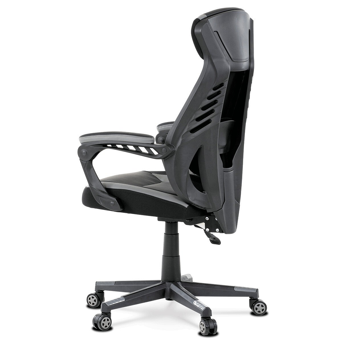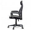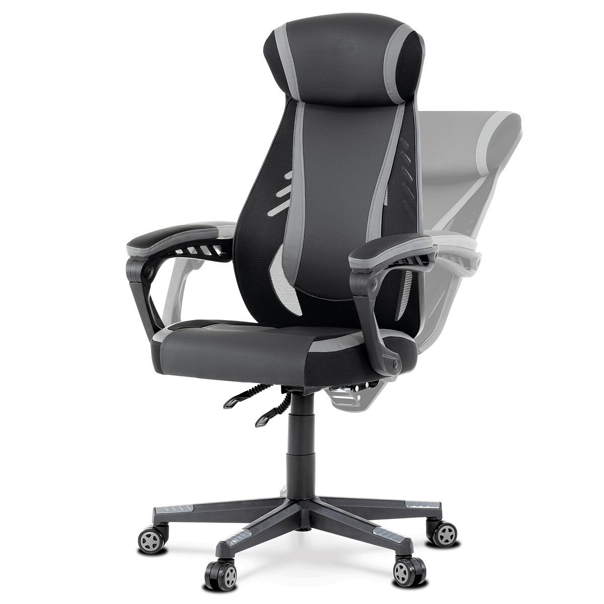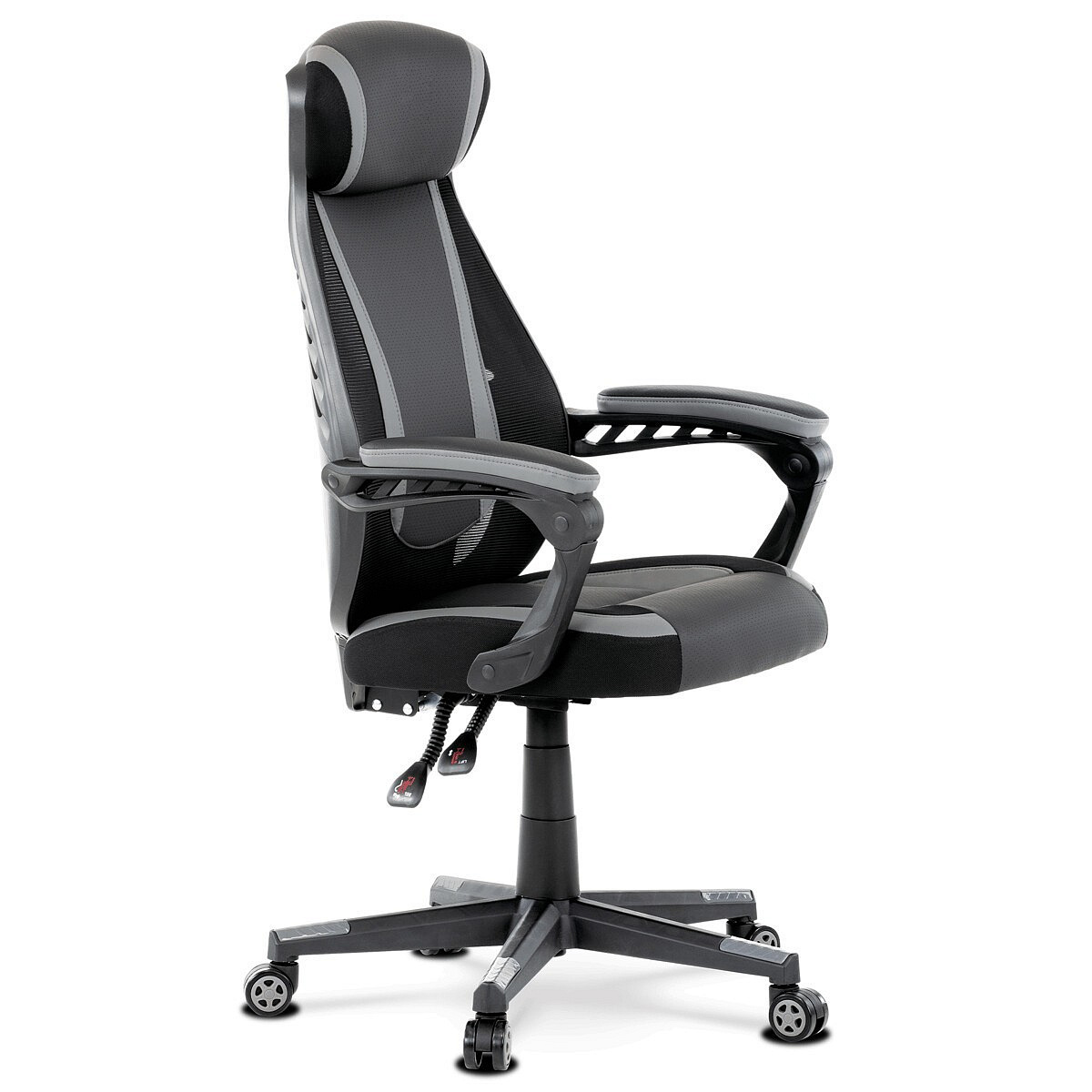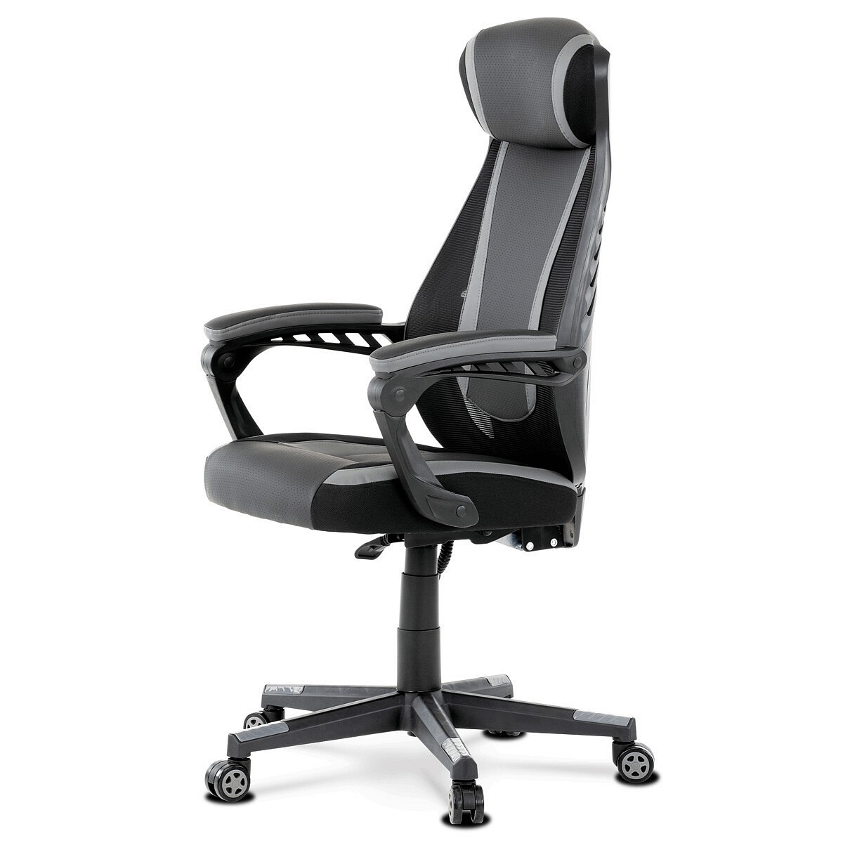 Luxusní herní a kancelářské křeslo z kolekce TOP racing. Jedná se o moderní designové křeslo, navržené nejen pro náročné požadavky PC hráčů, ale je uzpůsobené i pro standardní kancelářskou práci. To vše v maximálním pohodlí a při dokonalé ergonomii sezení. Potah je kombinací šedé a černé perforované ekokůže na sedáku i opěráku, černé síťoviny MESH a černé, jemně hrubé látky látky na sedáku i bocích opěrky hlavy. Opěrák je černý plastový výlisek ve futuristickém designu. Výplň sedáku i hlavové opěrky je z velmi kvalitní a tuhé PU pěny, vyztužení a pružnost zajišťují látkové popruhy. Křeslo je vybaveno houpacím mechanismem s plynulou aretací. Při vypnutí je možné se s opěradlem volně pohupovat. Výška sezení se upravuje jednou páčkou na pravé straně přes kvalitní plynový píst. Poloha opěráku se nastavuje druhou páčkou, umístěnou rovněž na pravé straně křesla. Masivní černý plastový kříž s šedýmii protiskluzovými plastovými doplňky je osazen černými plastovými kolečky pr. 6 cm s šedým racing středem a gumovým obvodem ideálními na tvrdé podlahy. Se stabilitou celých 70 cm průměru kříže si můžete dovolit i ty nejnáročnější hry. Vysoký, prodyšný a ergonomicky navržený opěrák s integrovanou zesílenou opěrkou hlavy, polstrovanou a výškově nastavitelnou bederní opěrkou slouží nejen jako výborná opora celých zad a také podporuje správné držení páteře. Područky jsou plastové, polstrované a potažené modrou a černou ekokůží. Šíře je 7 cm, délka ložné plochy 33 cm a výška 3 cm. Při sklápění sedáku se pohybují a kopírují jeho pohyb a polohu. Nosnost židle je až 130 kg.
