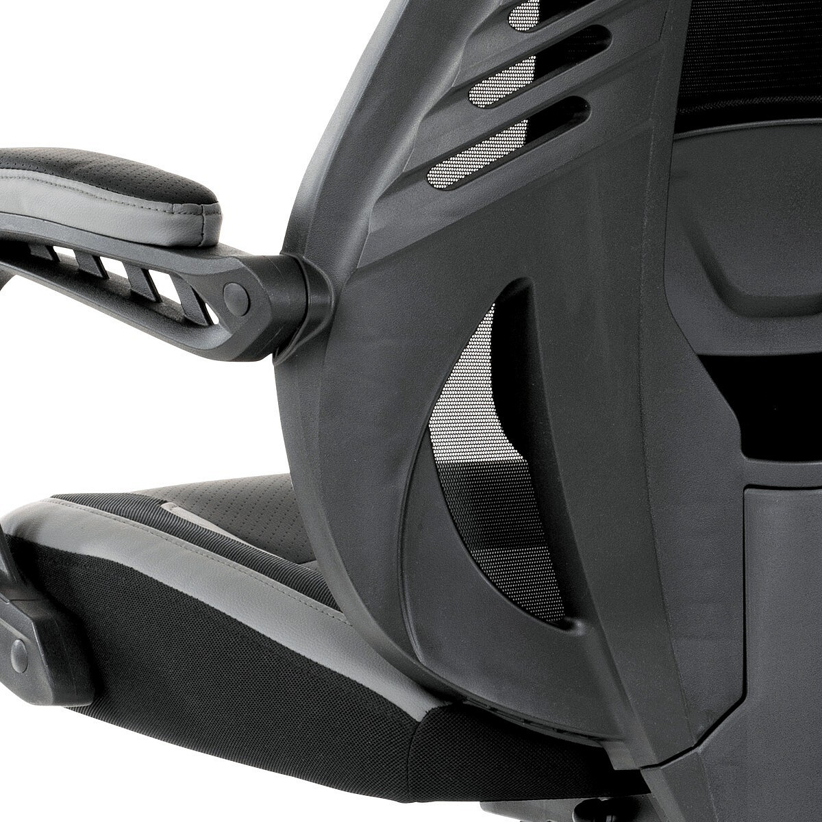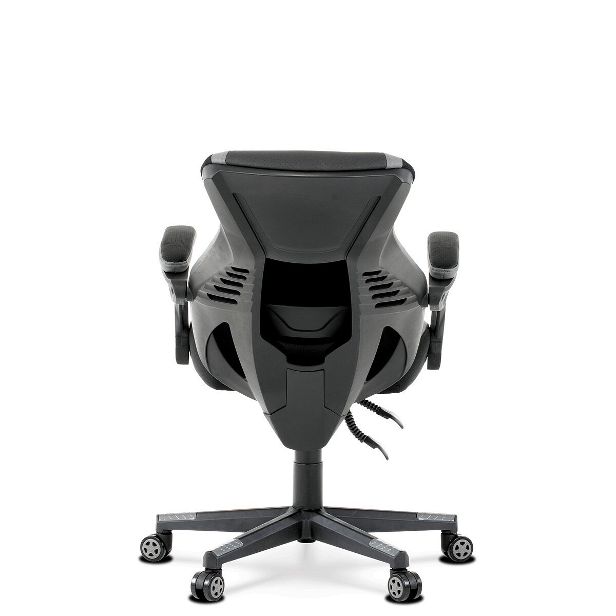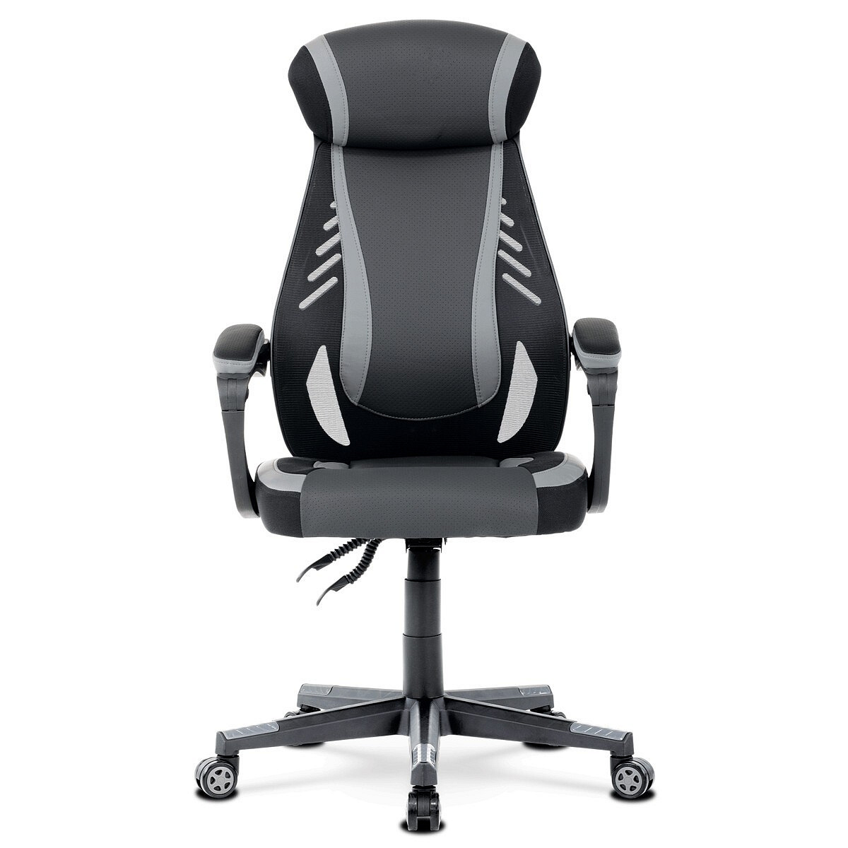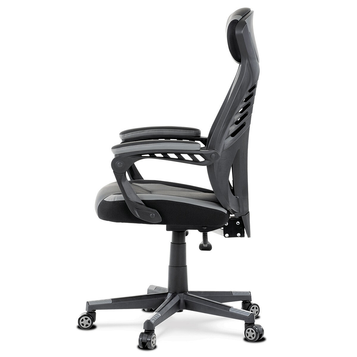Luxusní herní a kancelářské křeslo z kolekce TOP racing. Jedná se o moderní designové křeslo, navržené nejen pro náročné požadavky PC hráčů, ale je uzpůsobené i pro standardní kancelářskou práci. To vše v maximálním pohodlí a při dokonalé ergonomii sezení. Potah je kombinací šedé a černé perforované ekokůže na sedáku i opěráku, černé síťoviny MESH a černé, jemně hrubé látky látky na sedáku i bocích opěrky hlavy. Opěrák je černý plastový výlisek ve futuristickém designu. Výplň sedáku i hlavové opěrky je z velmi kvalitní a tuhé PU pěny, vyztužení a pružnost zajišťují látkové popruhy. Křeslo je vybaveno houpacím mechanismem s plynulou aretací. Při vypnutí je možné se s opěradlem volně pohupovat. Výška sezení se upravuje jednou páčkou na pravé straně přes kvalitní plynový píst. Poloha opěráku se nastavuje druhou páčkou, umístěnou rovněž na pravé straně křesla. Masivní černý plastový kříž s šedýmii protiskluzovými plastovými doplňky je osazen černými plastovými kolečky pr. 6 cm s šedým racing středem a gumovým obvodem ideálními na tvrdé podlahy. Se stabilitou celých 70 cm průměru kříže si můžete dovolit i ty nejnáročnější hry. Vysoký, prodyšný a ergonomicky navržený opěrák s integrovanou zesílenou opěrkou hlavy, polstrovanou a výškově nastavitelnou bederní opěrkou slouží nejen jako výborná opora celých zad a také podporuje správné držení páteře. Područky jsou plastové, polstrované a potažené modrou a černou ekokůží. Šíře je 7 cm, délka ložné plochy 33 cm a výška 3 cm. Při sklápění sedáku se pohybují a kopírují jeho pohyb a polohu. Nosnost židle je až 130 kg.