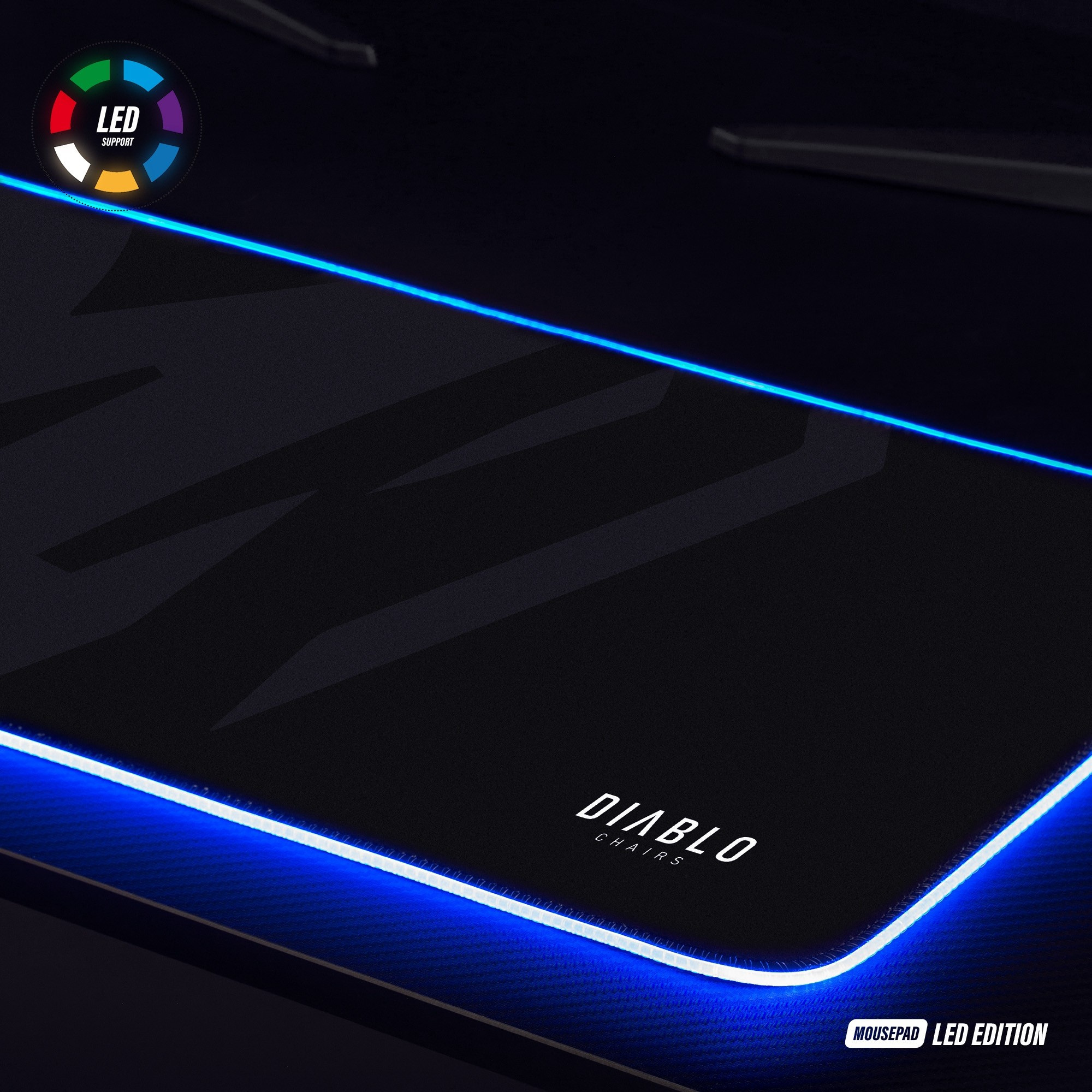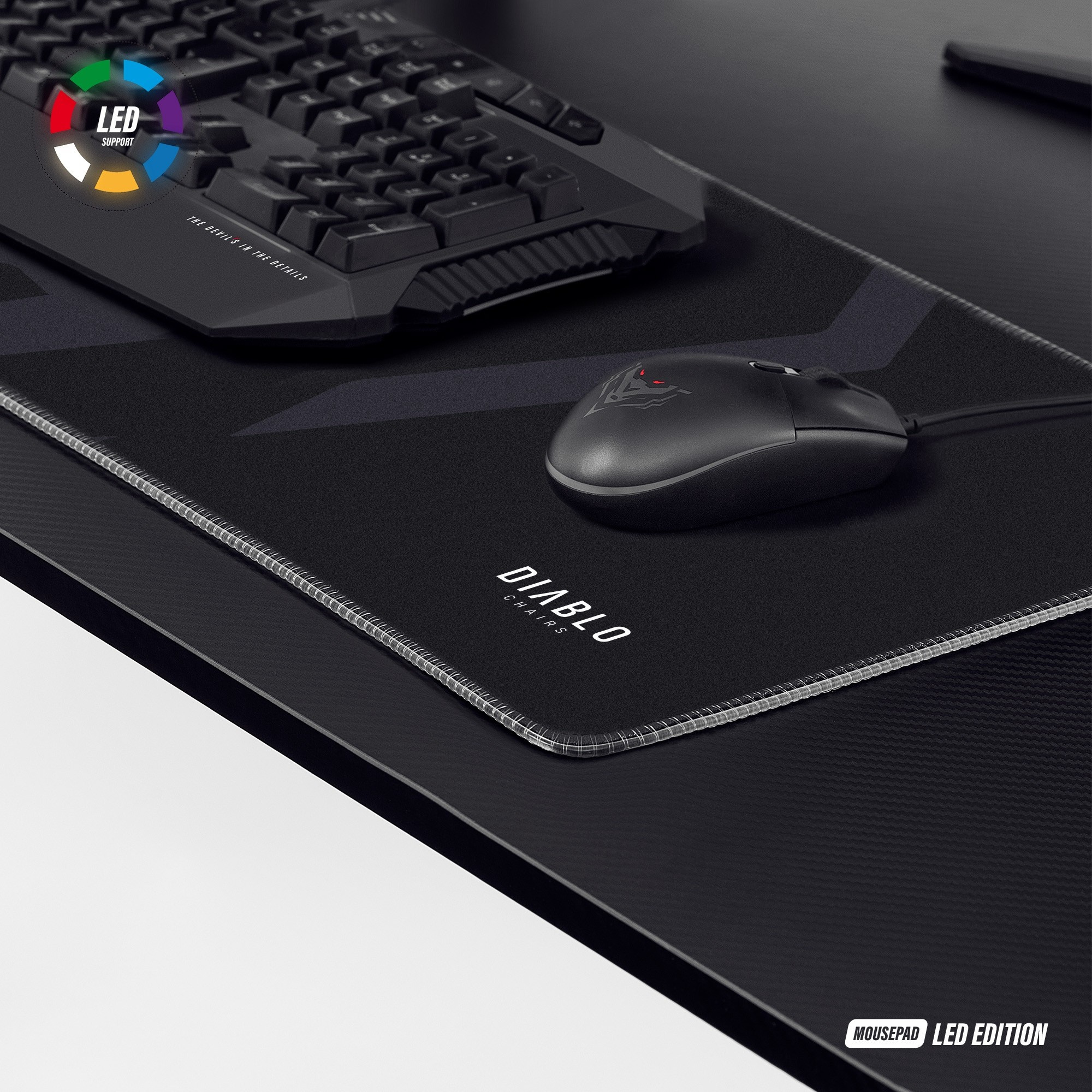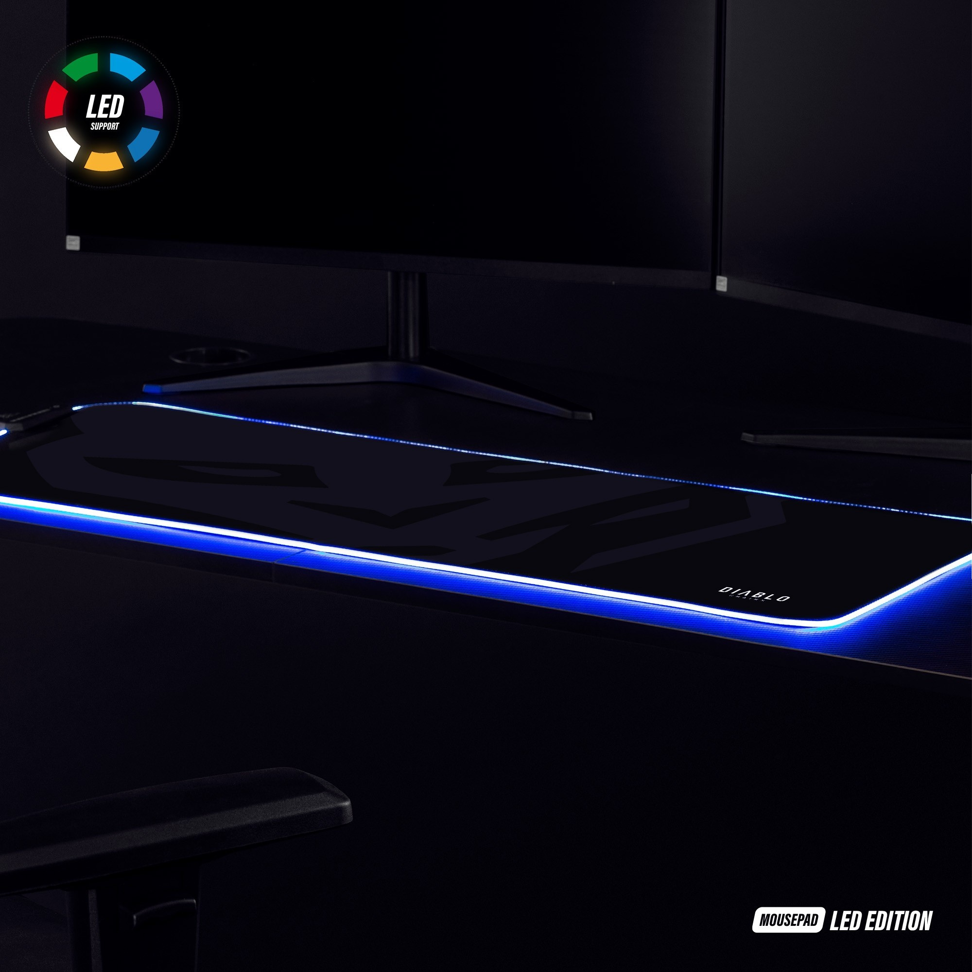HERNÍ PODLOŽKA DIABLO CHAIRS LED EDITION Přizpůsob si svůj herní setup! Udělej z počítačového pracoviště ještě výraznější místo a každou hru plnou dodatečných emocí. S herní podložkou Diablo Chairs LED Edition se stůl promění v opravdové řídící centrum a procházení dalších virtuálních vesmírů bude vzrušující a jedinečné jako nikdy předtím. VÝHODY LED PODLOŽKY Jak to funguje? Naše herní podložka má až deset režimů, včetně sedmi statických a tří dynamických, a také sedm barev podsvícení: červená, zelená, modrá, fialová, indigo, žlutá a bílá. Můžeš si vybrat svůj oblíbený režim podsvícení a užívat si individuálně přizpůsobené herní stanoviště ve výrazném stylu! Design Diablo to není vše, protože naše herní podložka pod myš s LED osvětlením ti také zajistí maximální pohodlí během každodenního hraní. Hladký povrch zajistí, že myš se bude pohybovat plynule, a protiskluzová spodní strana zabrání nechtěnému posouvání podložky po povrchu herního stolu. Zaručené pohodlí! Specifikace herní podložky LED Rozměry: 80x30 cm Tloušťka: 0,4 cm Hmotnost: 0,56 kg Délka USB kabelu: 1,5 m Materiál: tkanina, guma Délka/typ napájecího kabelu: 1,5 m / micro USB Napájecí napětí: 5 V Spotřeba proudu: 150 mA