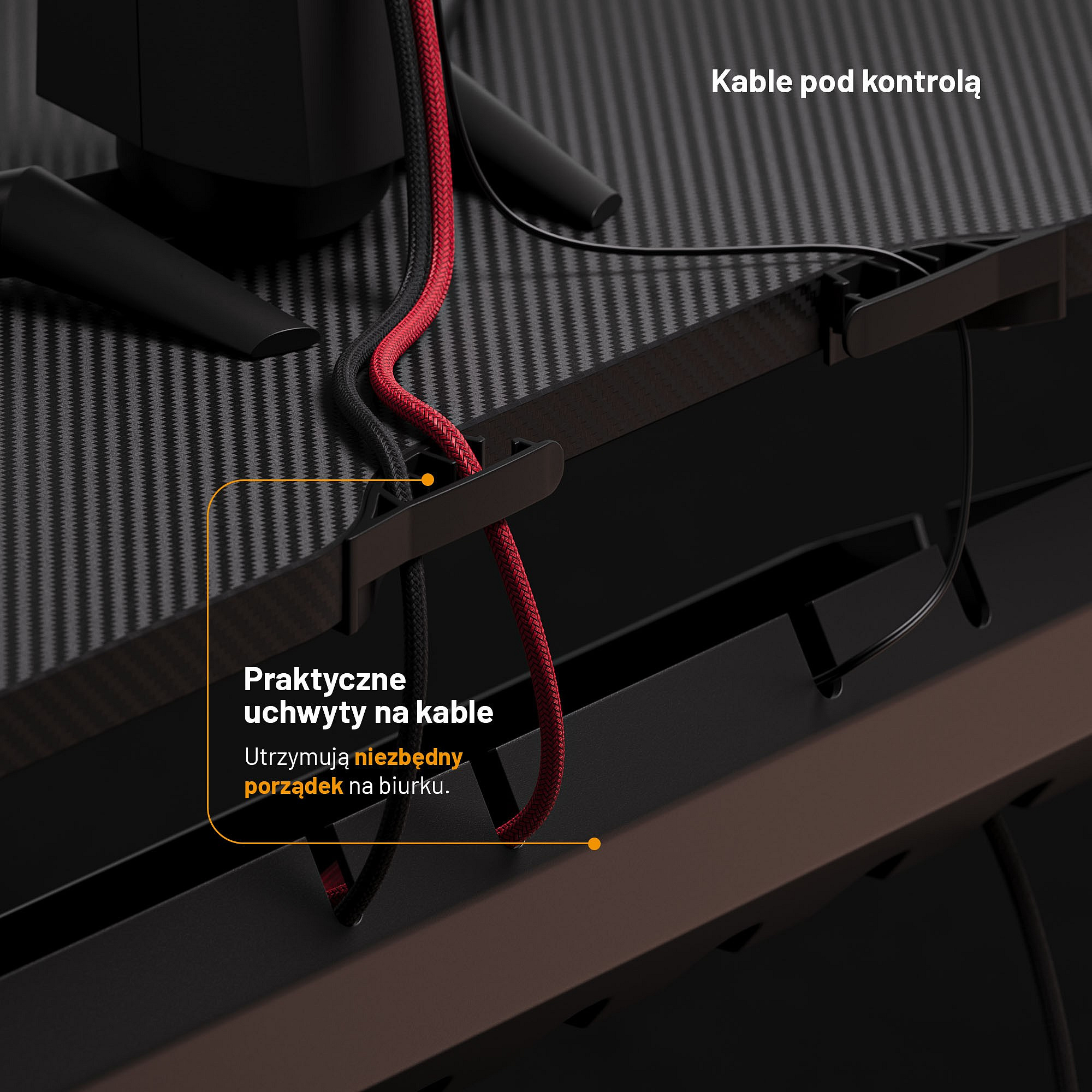 Díky tomuto promyšlenému systému bude správa kabelů hračkou, a to i v případě malého počítačového stolu. Udržujte svůj prostor čistý a uspořádaný a soustřeďte se na to, co je důležité – na hru!
