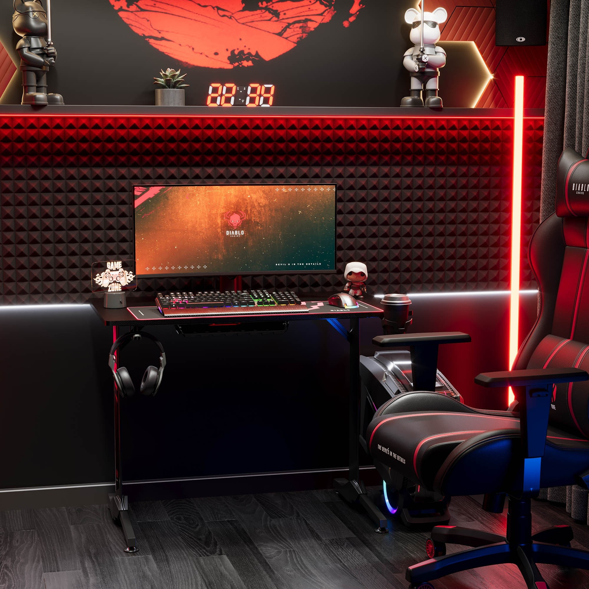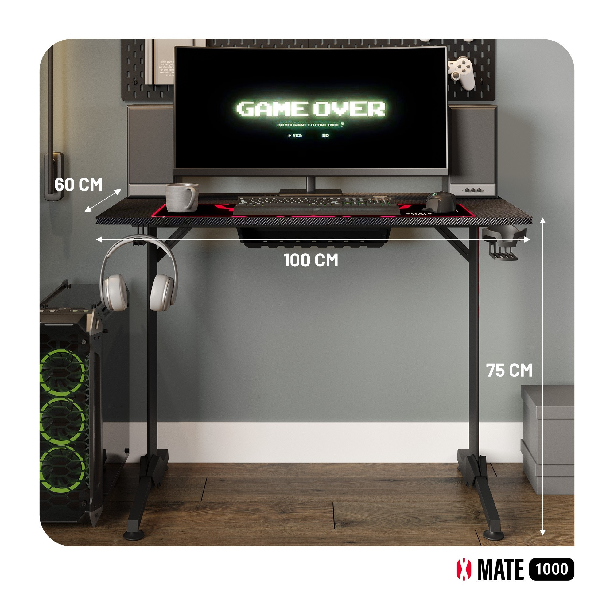 MALÝ HERNÍ STŮL DIABLO X-MATE 1000 Sníš o vlastním herním stanovišti, ale ve svém pokoji nemáš dostatek místa? Řešení je překvapivě jednoduché. Stačí, když svůj setup postavíš na malý herní stůl Diablo X-Mate. Má pouze 100 cm na šířku a 60 cm do hloubky, takže se vejde i do malé místnosti. Správně zvolené doplňky a charakteristický vzhled ve stylu Diablo Chairs způsobují, že hraní, streamování, práce nebo studium se stanou mimořádně příjemnými. VELKÝ POTENCIÁL V MALÉM STOLU Navrhli jsme mini herní stůl 100 cm tak, aby jeho malé rozměry přinášely samé výhody. Obdélníkový tvar desky maximálně zvětšuje užitnou plochu a přiložené doplňky ti usnadňují udržování pořádku a zvyšují tvůj herní komfort. DOPLŇKY PRO SKVĚLOU ORGANIZACI Při malém prostoru je dobrá organizace k nezaplacení. Malý herní stůl X-Mate jsme vybavili dvěma pevně zpracovanými držáky, které sníží riziko rozlití nápoje a vzniku nepořádku, ale především ti na desce stolu zanechají spoustu místa. Držák Headset Mate™ je užitečný pro zavěšení sluchátek. Když si zvykneš odkládat je na své místo, ušetříš spoustu času při hledání a příprava na hru s kamarády ti zabere doslova sekundu. Vyhrazené místo na hrnek není rozmar. Není nic horšího než zalitá klávesnice nebo myš. Díky Cup Mate™ bude váš oblíbený nápoj dostatečně blízko, abyste na něj mohli dosáhnout v každé situaci, ale dostatečně daleko od vašeho cenného elektronického vybavení. Preferuješ, aby byl hrnek vlevo nebo vpravo? Na tvém herním stanovišti by měla platit tvá pravidla. S malým stolem pod počítač X-Mate přizpůsobíte umístění držáků svým preferencím. KONEC S PLÉTÍCÍMI SE KABELY V malém prostoru se počítá každý centimetr. Herní stůl 100x60 cm bez problémů přisunete ke zdi. Na zadní straně desky jsme vytvořili výřez, který ti umožní vést kabely od monitoru nebo klávesnice do praktického organizéru Wire Mate™. Správa kabelů s Diablo je i v případě malého počítačového stolu jednoduchá a efektivní. HRAJ BEZ PŘEKÁŽEK Není řeč o pohodlném, mnohahodinovém hraní bez přizpůsobené podložky pod myš. Abys mohl mít radost z nového stolu ihned po jeho sestavení, v balení najdeš spolehlivou, voděodolnou podložku. Chrání blát, umožňuje volný pohyb myší a díky rozpoznatelnému logu Diablo ve světě gamingu dodává tvému setupu dravý charakter. DESKA, KTERÁ MÁ NĚCO DO SEBE Deska v malém herním stole X-Mate 1000 o tloušťce 1,5 cm je připravena na všechny okolnosti. Za prvé je silný a mimořádně odolný proti poškození. Za druhé, vnější vrstva Carbon Mate™ vypadá velmi atraktivně, je snadno čistitelná a není náchylná k poškrábání. SPOLEHLIVÁ PODPORA Herní stůl 100 cm stojí na nohách Stripe Mate™, díky kterým získáte maximální stabilitu. Silné, ale ne masivní podpory nepřetěžují prostor, což je mimořádně důležité v malých místnostech. Absence vyčnívajících konstrukčních prvků vám umožní najít pohodlnou polohu pro nohy bez rizika, že se neustále budete narážet kolenem nebo chodidlem do něčeho. Na bocích konstrukce najdeš dekorativní vložky s logem Diablo, které dokonale ladí s podložkou pod myš. Péče o detaily je aspekt, který přesvědčuje mnoho hráčů ke značce Diablo. SOLIDNÍ A STABILNÍ KONSTRUKCE Kovový rám zajišťuje, že počítačový stůl Diablo je schopen unést zařízení vážící až 80 kg. Mini psací stůl pro hráče X-Mate drží úroveň za všech podmínek. Stačí, když pomocí nastavitelných podstavců nastavíš výšku pro každou stranu, aby se dosáhlo dokonale rovného, nekolísajícího povrchu.