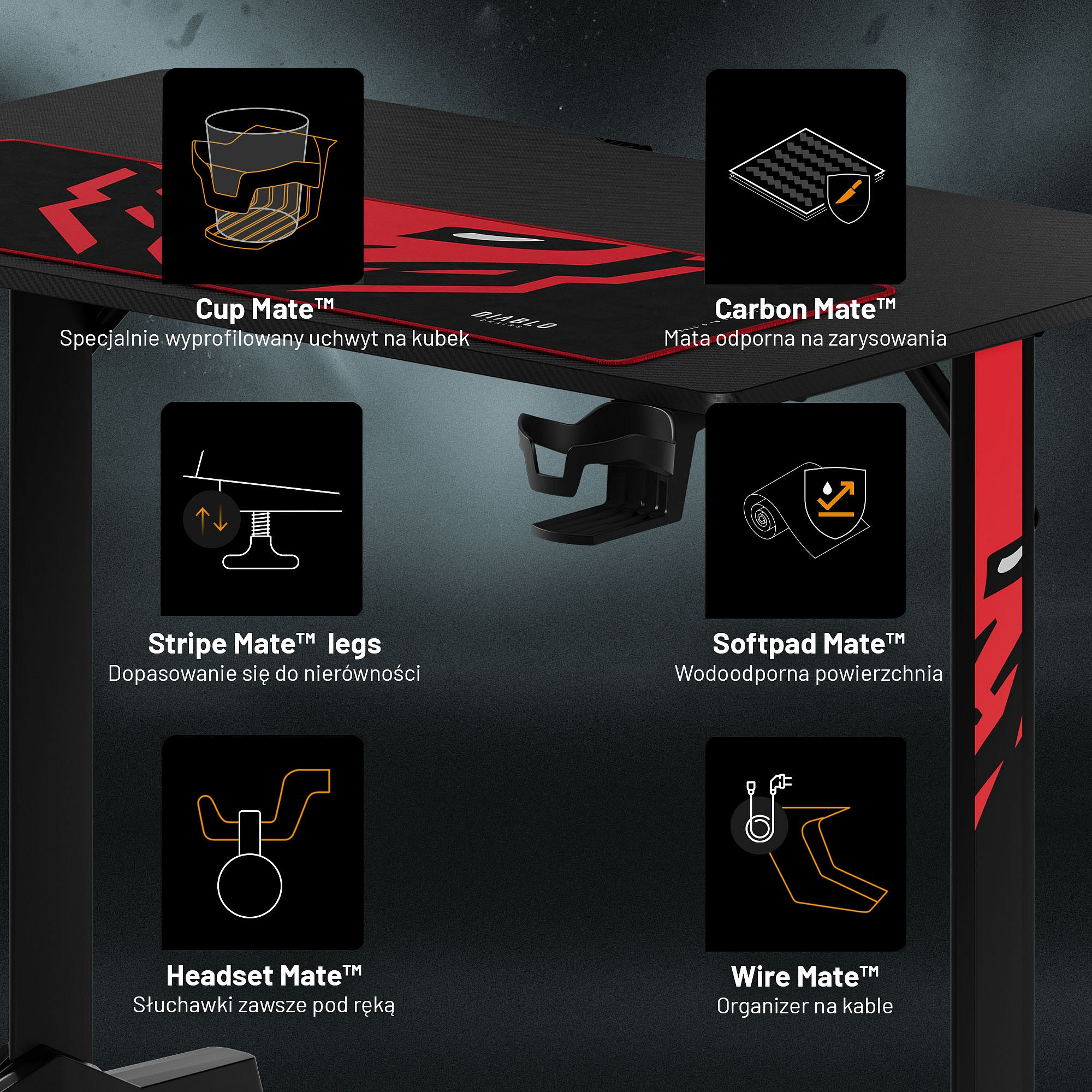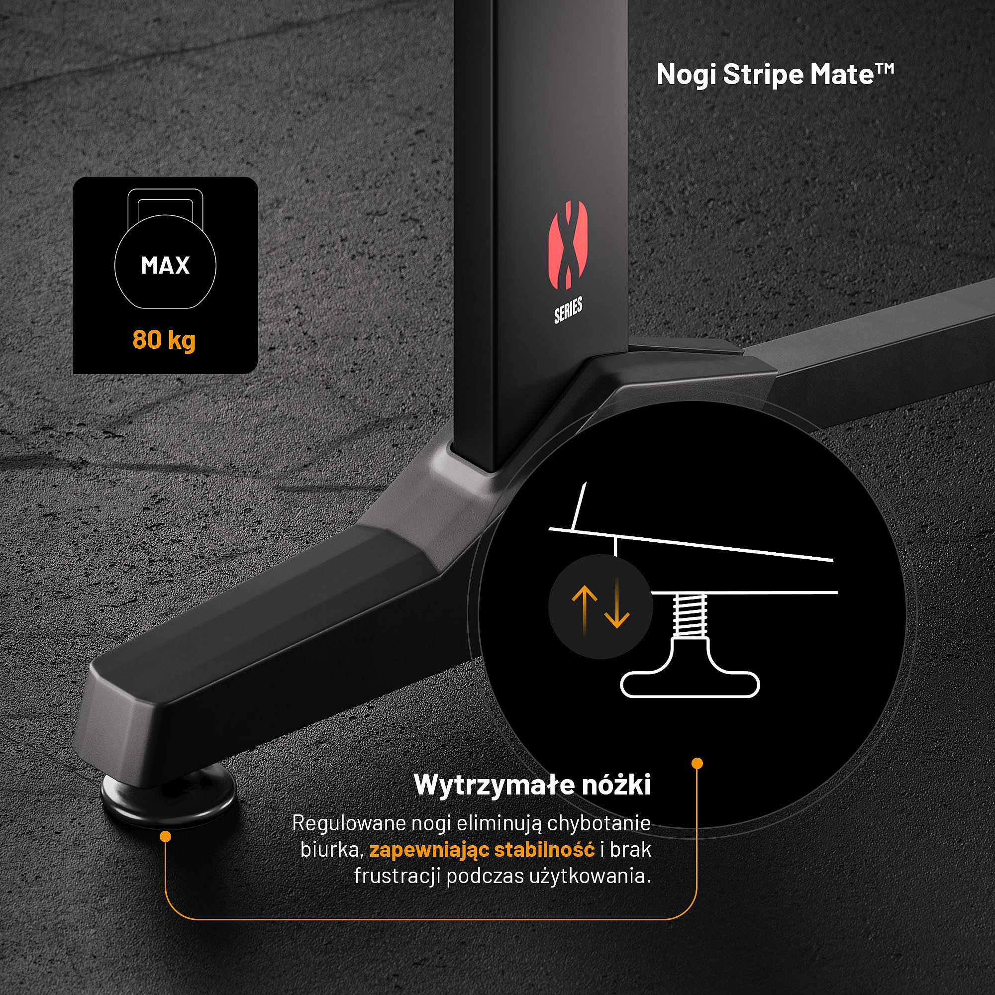 Herní stůl X-Mate 1000 stojí na pevných nohách Stripe Mate™, které mu zajišťují maximální stabilitu. Tyto silné, ale ne masivní podpory nepřetěžují prostor, což je obzvláště důležité v malých místnostech.