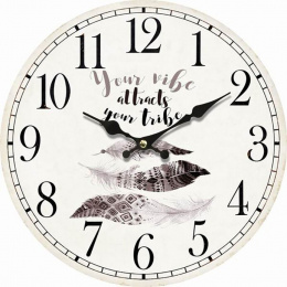 Nástěnné hodiny o průměru 34 cm jsou vyrobeny z MDF materiálu v bílém provedení s jemným motivem peří, který dodává hodinkám lehkost a vizuální efekt. Číselník je opatřen výraznými černými arabskými číslicemi a elegantními černými ručičkami, které zajišťují dobrou čitelnost času. Hodiny mají klasický kulatý tvar s decentním rámečkem, který ladí s celkovým designem. Jsou vhodné pro zavěšení v obývacím pokoji, kuchyni nebo kanceláři, kde přispějí k příjemné atmosféře a zároveň plní praktickou funkci měření času.