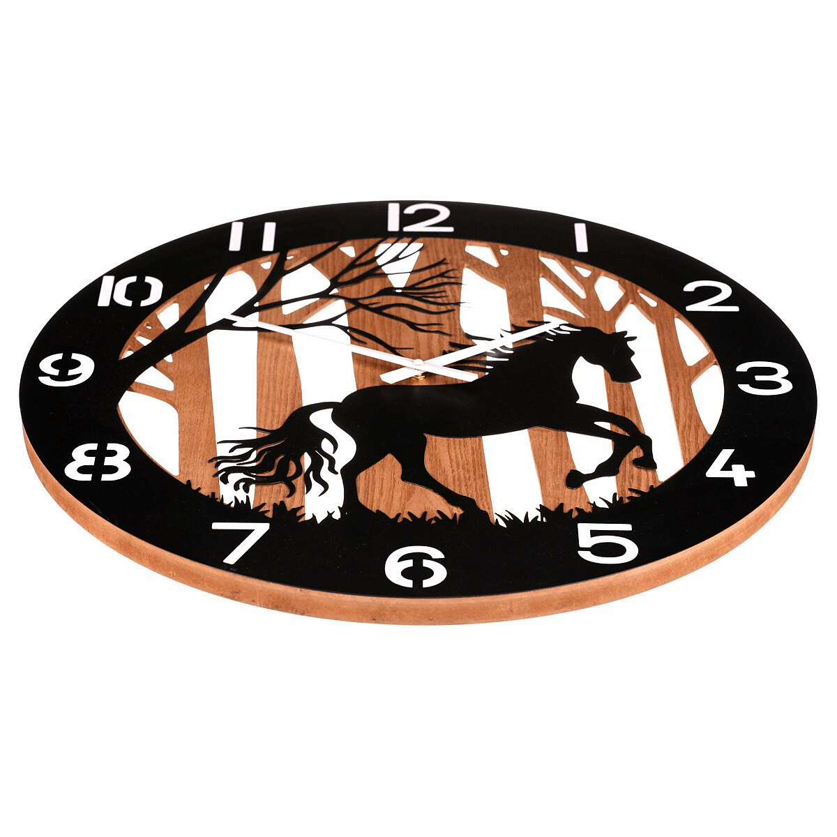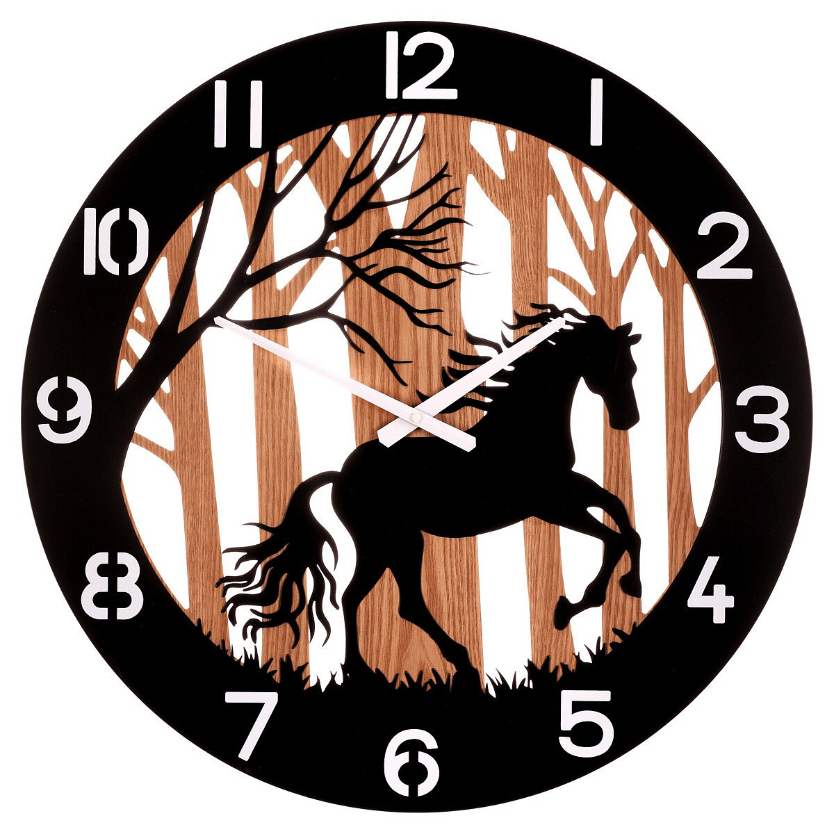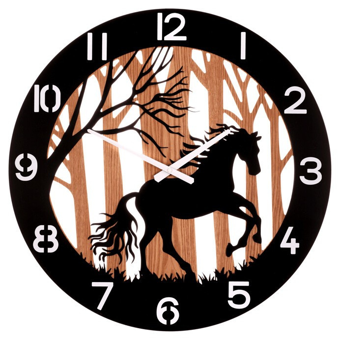 Nástěnné hodiny o průměru 60 cm kombinují černý kovový rám s dřevěným pozadím, na kterém je vyobrazen motiv koně v lese. Čistý design s výraznými bílými číslicemi zajišťuje dobrou čitelnost času. Hodiny vnášejí do interiéru přírodní atmosféru a díky kvalitnímu kovovému provedení jsou navrženy pro dlouhou životnost. Jsou vhodné pro zavěšení v obývacím pokoji, pracovně nebo chodbě, kde doplní rustikální i moderní styl. Precizní ručičky a tichý chod zajišťují spolehlivý a nerušící provoz.