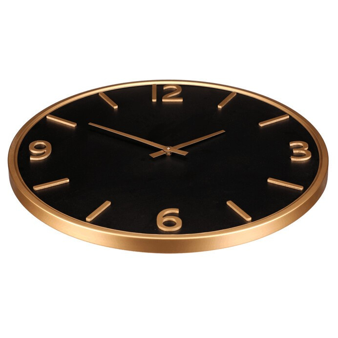 Nástěnné hodiny o průměru 60 cm kombinují černý melaminový ciferník s kovovým rámem v zlatém odstínu, který dodává hodinám moderní a zároveň nadčasový vzhled. Číslice a ručičky jsou v kontrastní zlaté barvě, což zajišťuje dobrou čitelnost času i z větší vzdálenosti. Hodiny jsou vhodné pro různé interiérové styly, kde vyniknou jako praktický a zároveň designový doplněk. Povrch ciferníku je matný, což minimalizuje odlesky a usnadňuje odečet času. Díky kvalitnímu provedení materiálů jsou hodiny navrženy pro dlouhou životnost a snadnou údržbu.