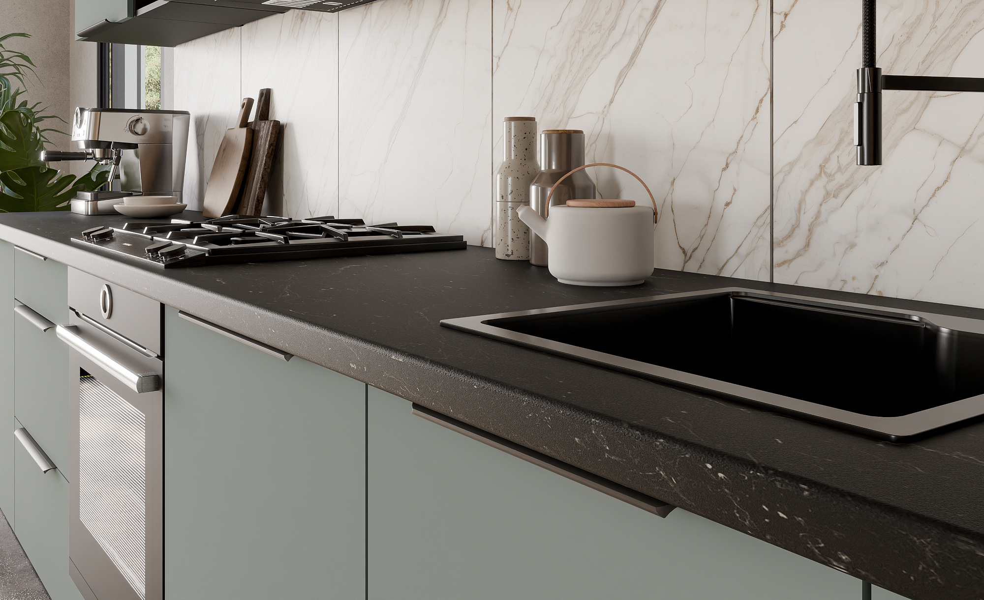 Kuchyně ARIA je vyrobena z vysoce kvalitního lamina o tloušťce 16 mm, které je zpracováno v elegantní černé barvě. Tento sofistikovaný vzhled je doplněn dvířky a čely šuplíků v barvě Aquamarine AFM, které jsou opatřeny odolnými ABS hranami. Kombinace černé barvy a Aquamarine odstínu dodává skřínce luxusní vzhled, který se hodí do každé moderní kuchyně.