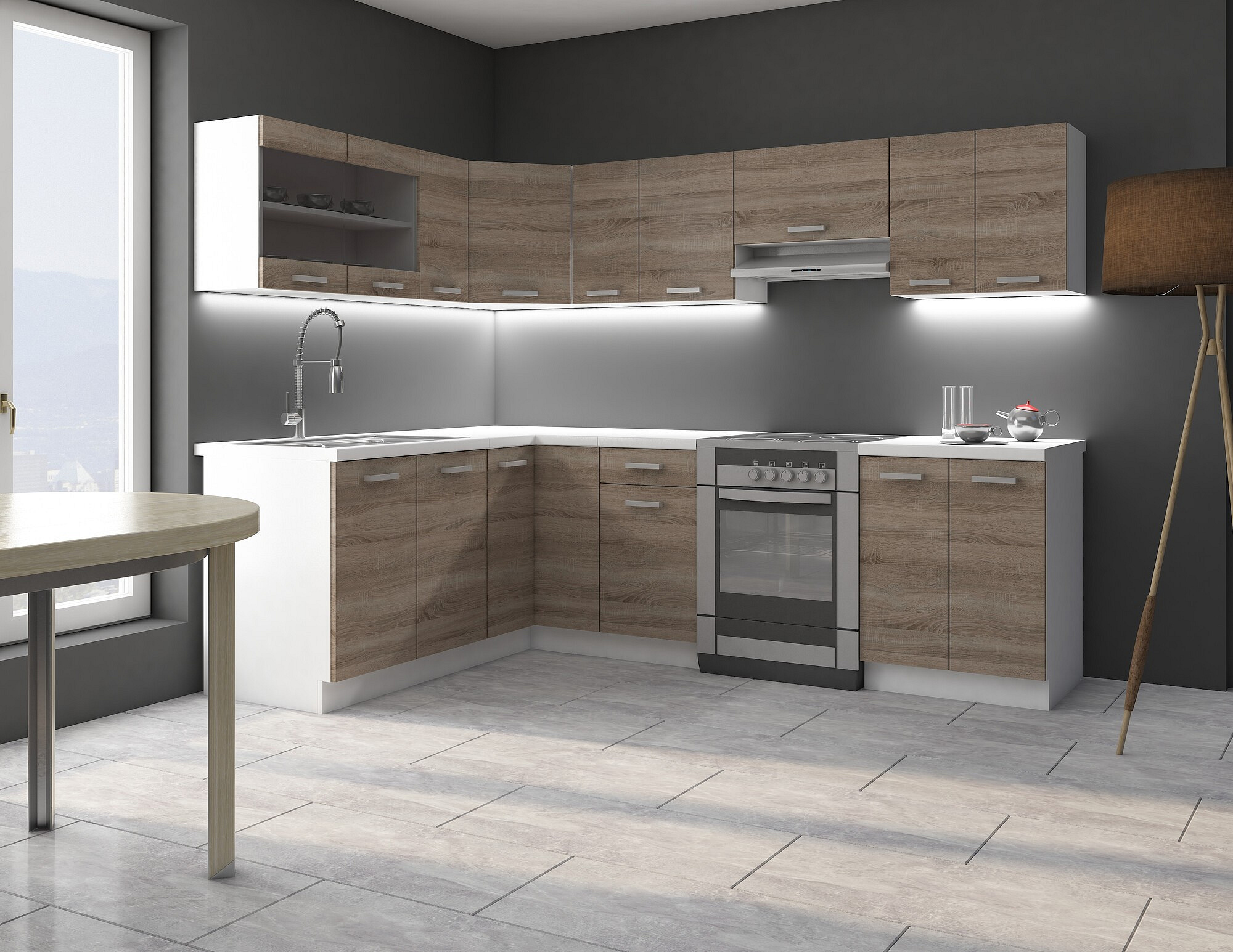 Kuchyně je navržena v atraktivním barevném provedení, které kombinuje bílou barvu s dekorem Dub Sonoma Trufla. Tento kontrast vytváří moderní a svěží vzhled, který se hodí do jakéhokoliv interiéru. Bílý korpus skříňky je vyroben z laminované desky o tloušťce 16 mm, což zajišťuje její pevnost a odolnost. Dvířka a čela šuplíků jsou z kvalitní laminované desky v barvě Dub Sonoma Trufla, což dodává skříňce přírodní a teplý vzhled.