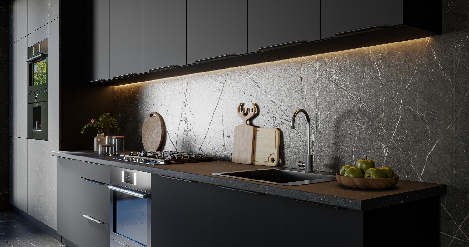 - Dvířka a čela šuplíků jsou vyrobeny z LTD desky výšky 16 mm v barvě Černá mat