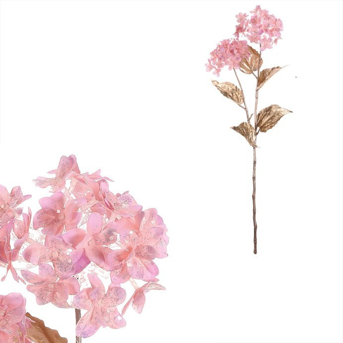 Umělá hortenzie s dvěma květy v růžovém odstínu a zlatými lístky přináší do vánoční výzdoby luxusní nádech. Tento elegantní květ je perfektní volbou pro sofistikované zimní aranžmá, které okouzlí každého návštěvníka.
