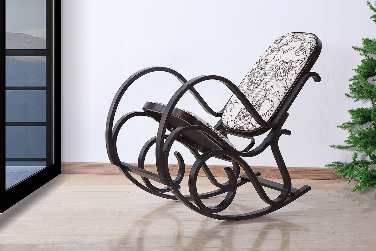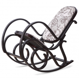 Klasické a nadčasové houpací křeslo, jehož design nás provází již několik generací. Je přímo ztělesněním pohody a relaxace. Zapadne do jakkoliv stylově zařízeného interiéru, v každém působí jako skvělý solitér. Přečtěte si v jeho pohodlí knížku, hrajte hry či on-line komunikujte anebo se jen nechte uspávat při jeho lehkém houpání. Křeslo je vyrobeno z ohýbané bukové překližky, mořené na odstín tmavý ořech a lakováno transparentním lakem. Potah sedáku i opěráku je ze světle béžové látky s výrazným hnědým rostlinným motivem, polstrování je z PU pěny. Nosnost je 110 kg.