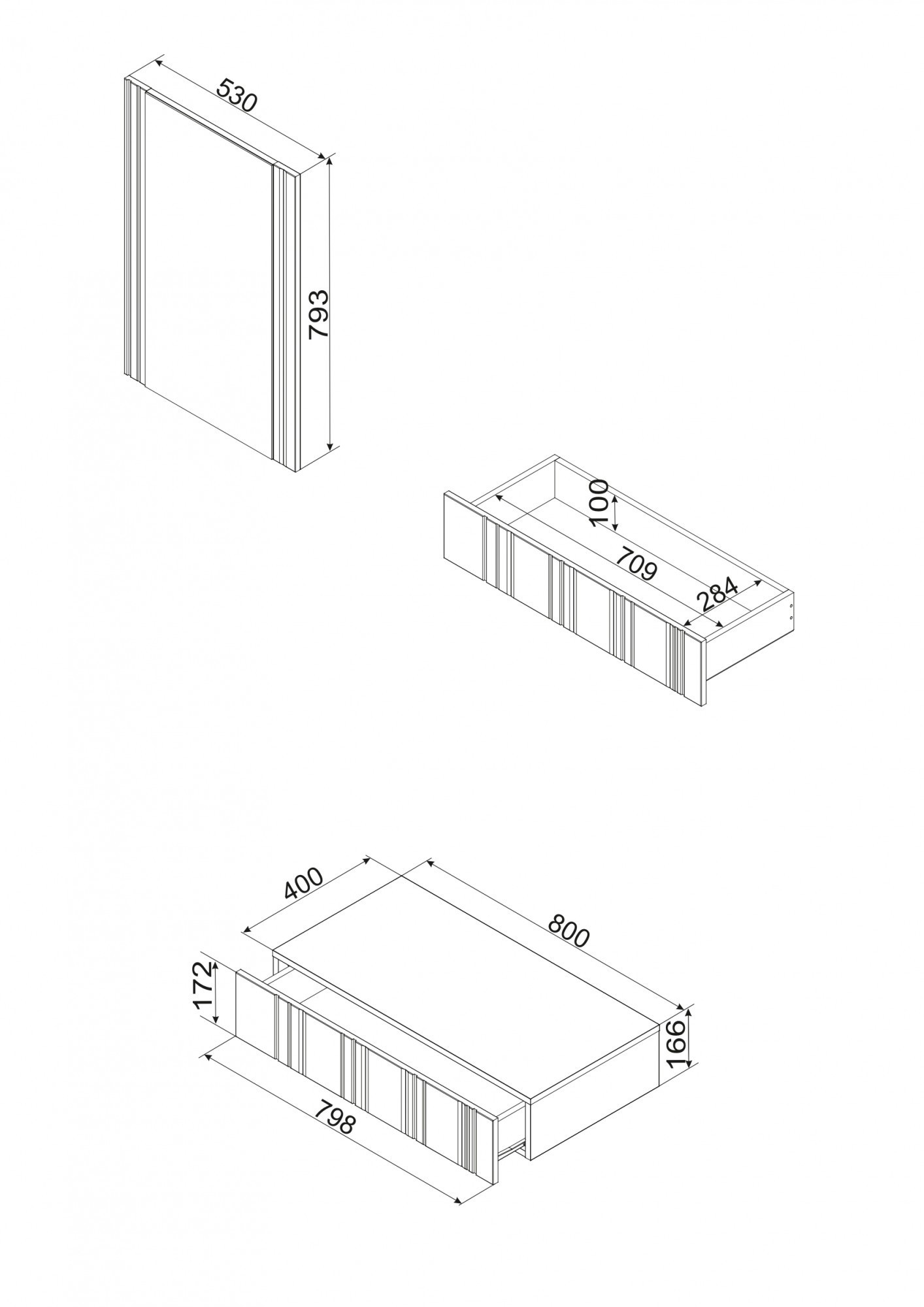 ISLA toaletka rozměry: V/Š/H - zrcadlo: 79cm/53cm; zásuvka 10cm/71cm/28,5cm materiál: korpus: laminovaná deska 16mm čela: MDF deska o tloušťce 16mm s viditelnými frézami Úchyt: systém PUSH TO OPEN