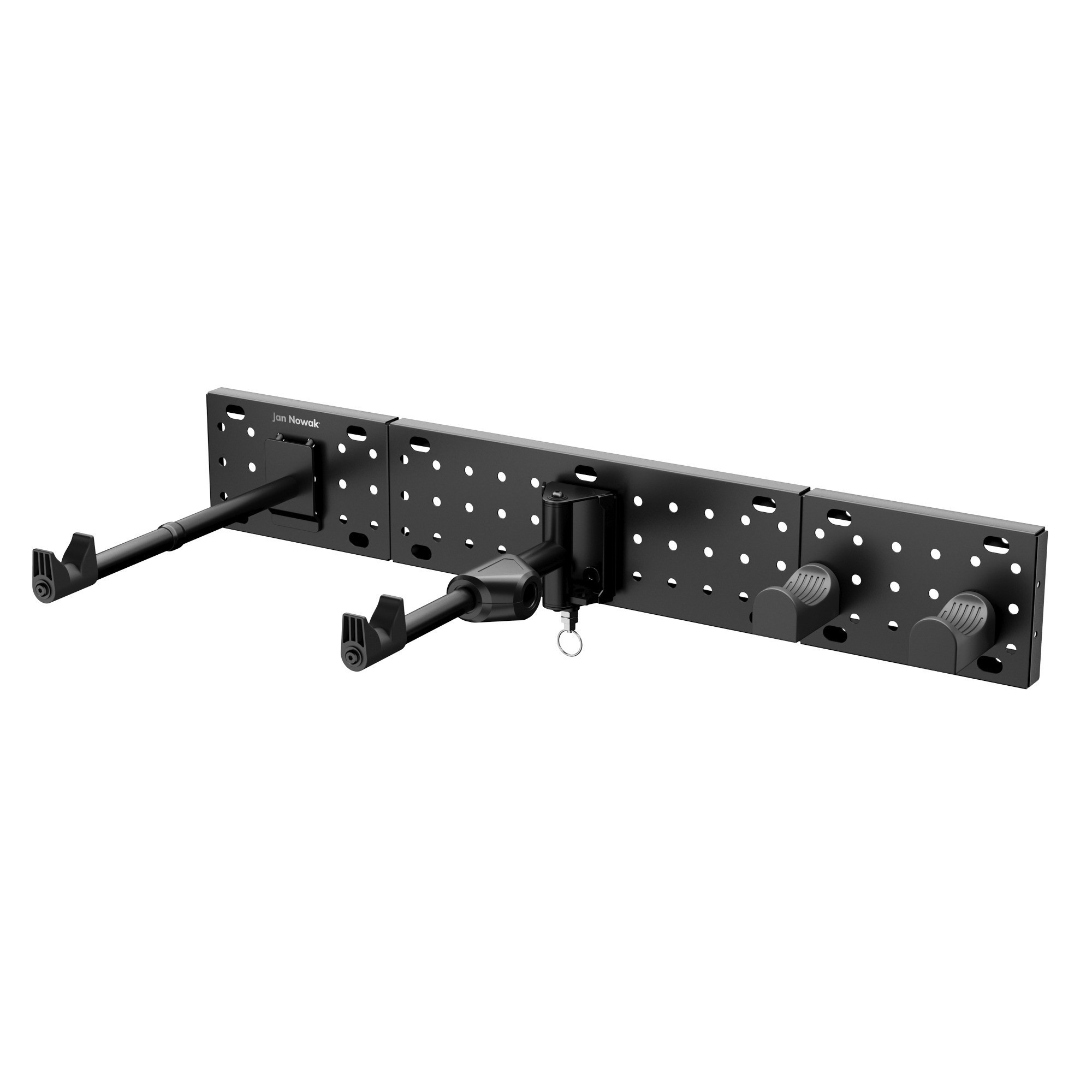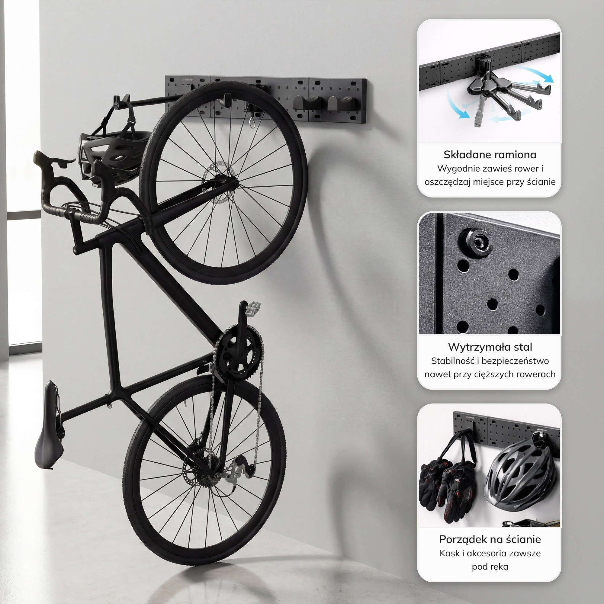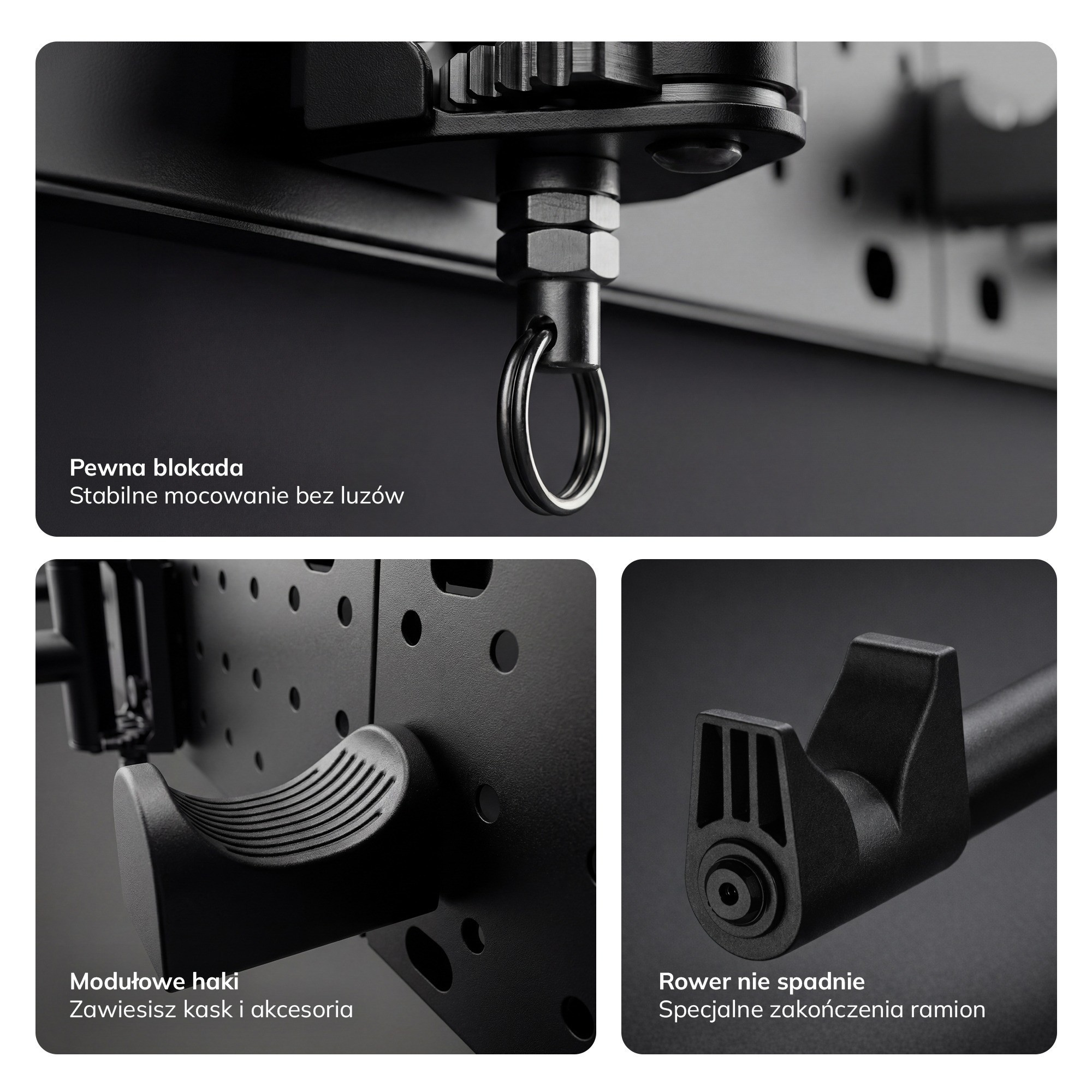 - Modulární systém: Držák je navržen jako modulární systém, což znamená, že jej můžete snadno rozšířit o další háčky a příslušenství. Můžete si tak vytvořit vlastní úložný systém pro vaše kolo a cyklistické vybavení.