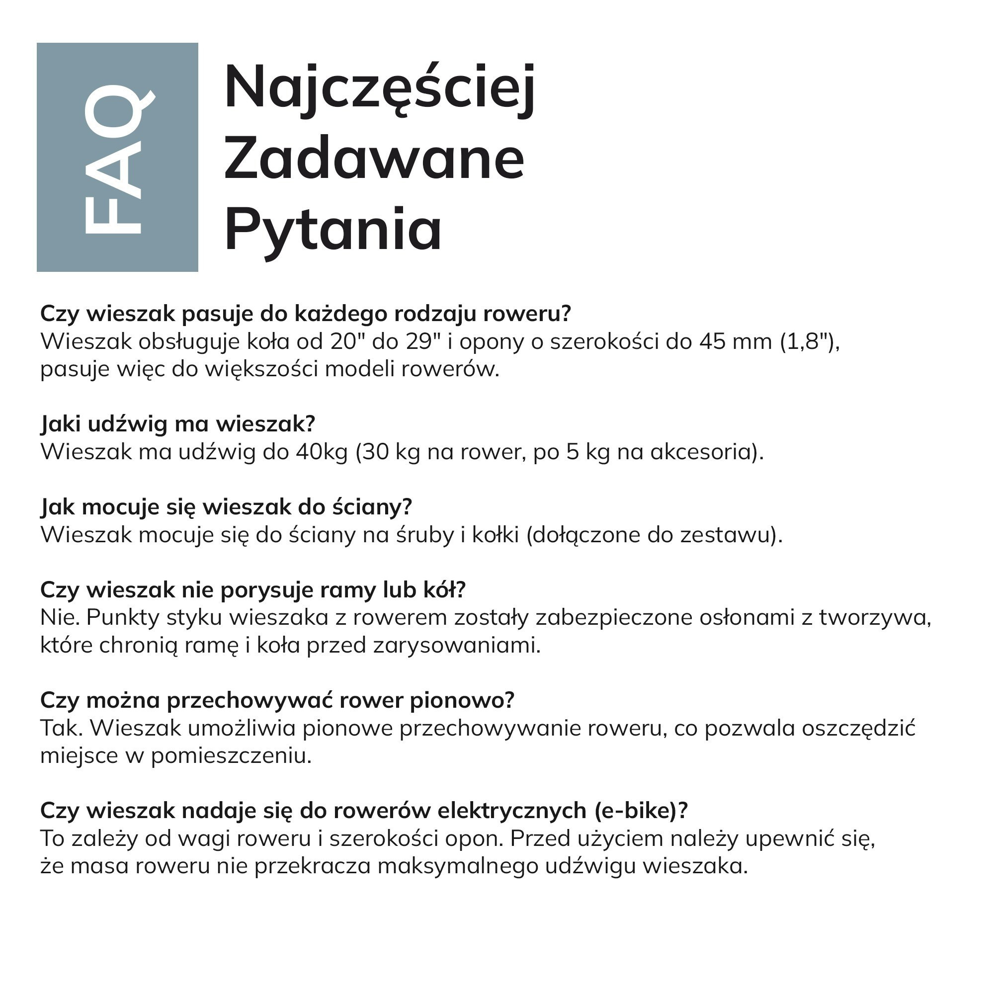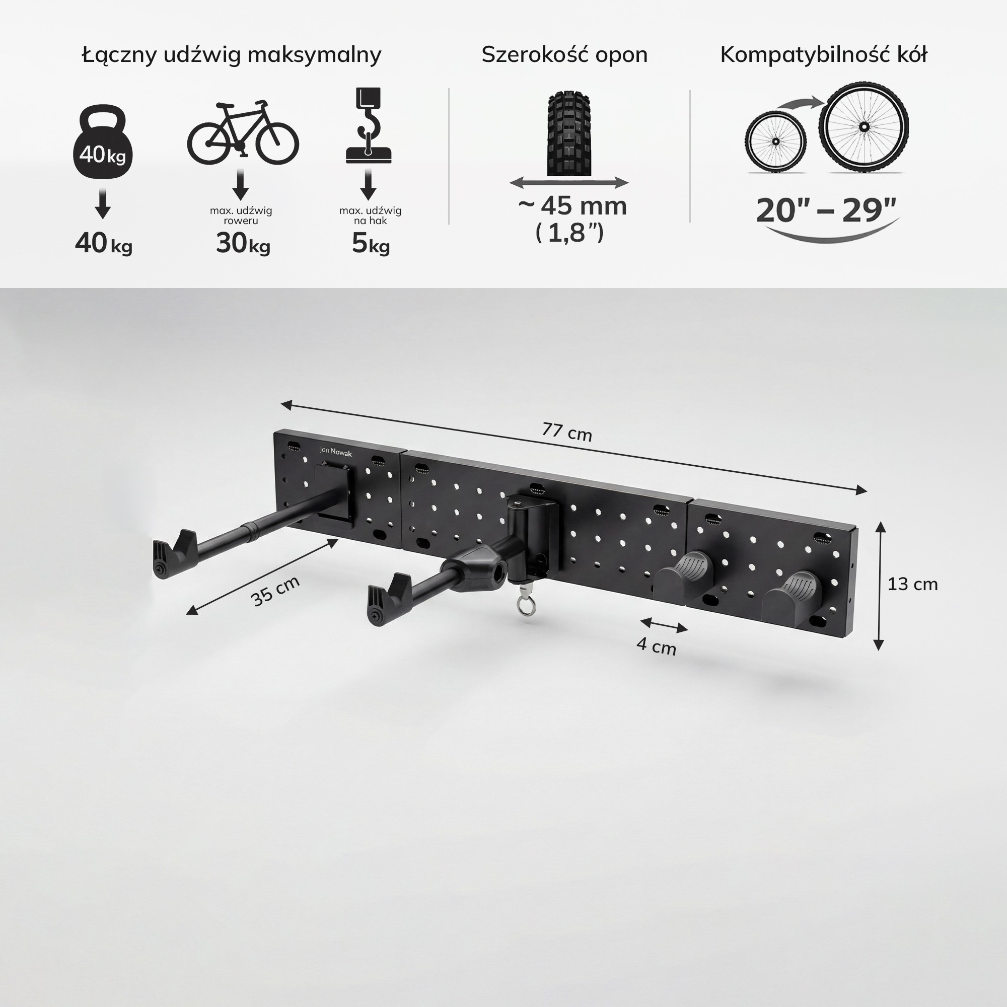 - Univerzální kompatibilita: Držák je kompatibilní s koly o velikosti 20"-29" a pneumatikami o šířce do 45 mm (1.8"). Bez problémů na něj zavěsíte horské, silniční, trekingové i městské kolo.