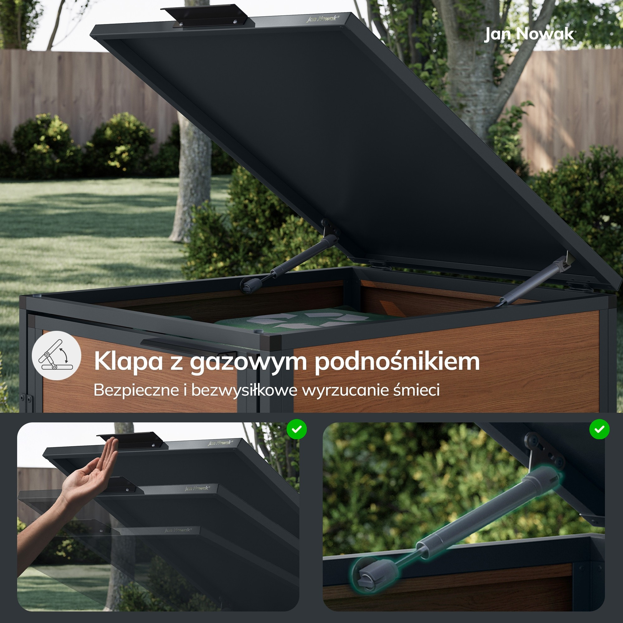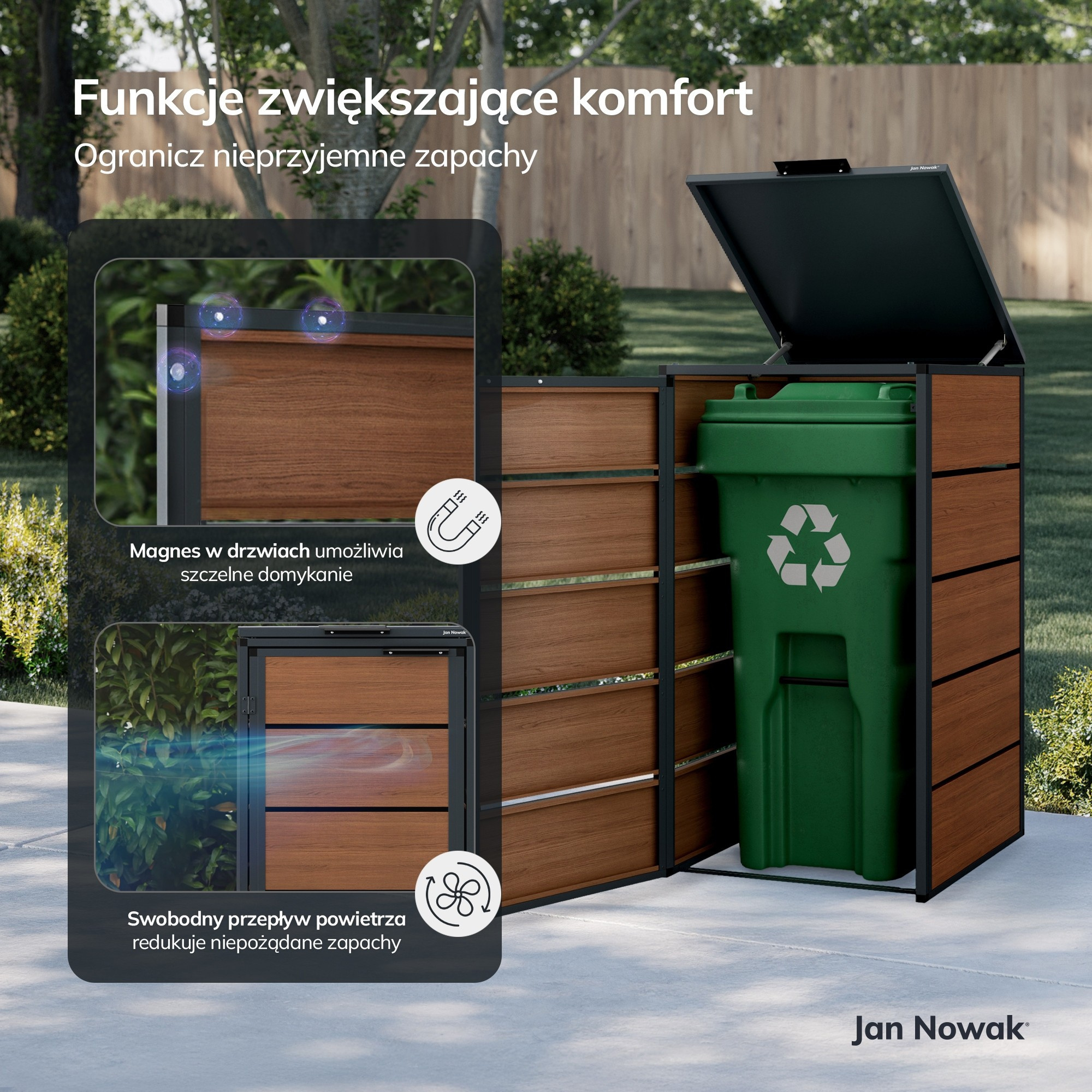 Funkčnost a kompaktnost vestavby jdou ruku v ruce s příjemným vzhledem. Univerzálnost a moderní minimalismus zajišťují, že odpadkový přístřešek se dokonale hodí do jakéhokoli prostoru a bude atraktivním prvkem před domem nebo pracovištěm. Vyberte si z barev antracit a ořech, a slaďte zabudovu s okolím.