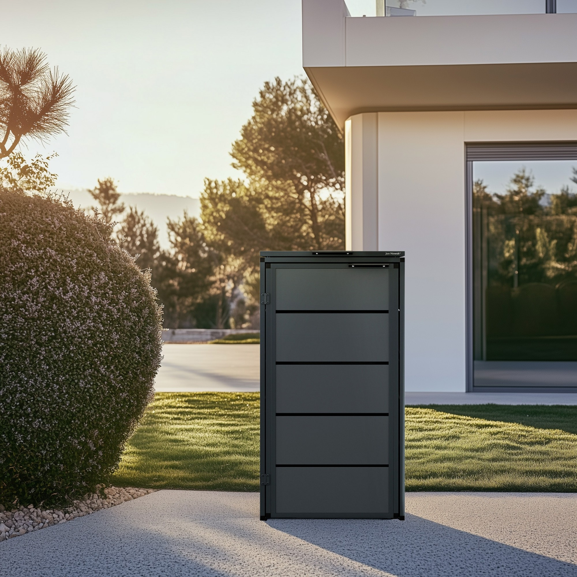 Funkčnost a kompaktnost vestavby jdou ruku v ruce s příjemným vzhledem. Univerzálnost a moderní minimalismus zajišťují, že odpadkový přístřešek se dokonale hodí do jakéhokoli prostoru a bude atraktivním prvkem před domem nebo pracovištěm. Antracitová barva je elegantní a nadčasová, takže se hodí k různým stylům architektury.