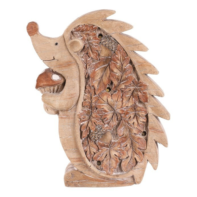 Ježek s osvětlením v imitaci dřeva a s podzimním listím přináší do vaší zahrady kouzelnou podzimní atmosféru. Vyrobený je z magnesia, ale svým zpracováním skvěle zapadne mezi dřeviny a keře. Dekorace je vybavena osvětlením, díky kterému můžete rozsvítit vybrané místo, čímž vytvoříte zejména za temných večerů, skutečně tajemnou atmosféru. Tato dekorace je skvělou volbou pro zahradu, terasu, balkon, případně i stylovým prvkem vybraného místa v interiéru.