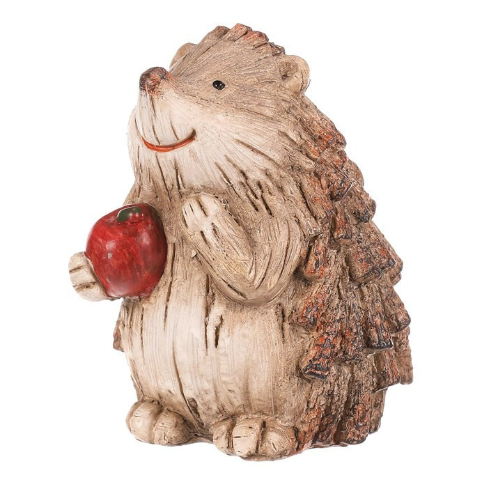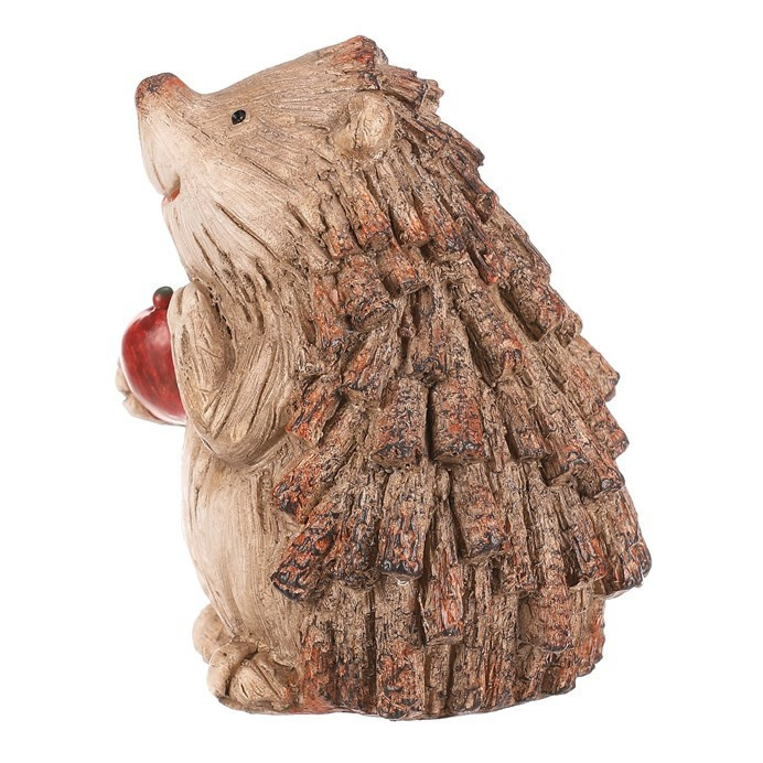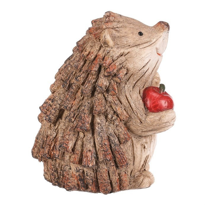 Zahradní figurka v podobě ježka svým provedením krásně zapadne mezi keře a další dřeviny, čímž vytvoříte nádherné lesní zátiší. Ježek v béžovo-hnědých odstínech a s červeným jablíčkem je vyroben z polyresinu, ale vypadá jako by byl právě ze dřeva. Jeho bodliny jsou tvořeny jakoby drobnými nasekanými částmi větviček.
