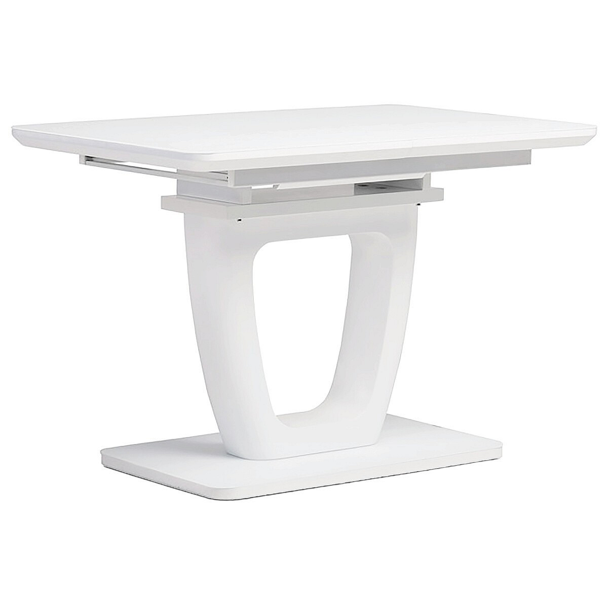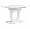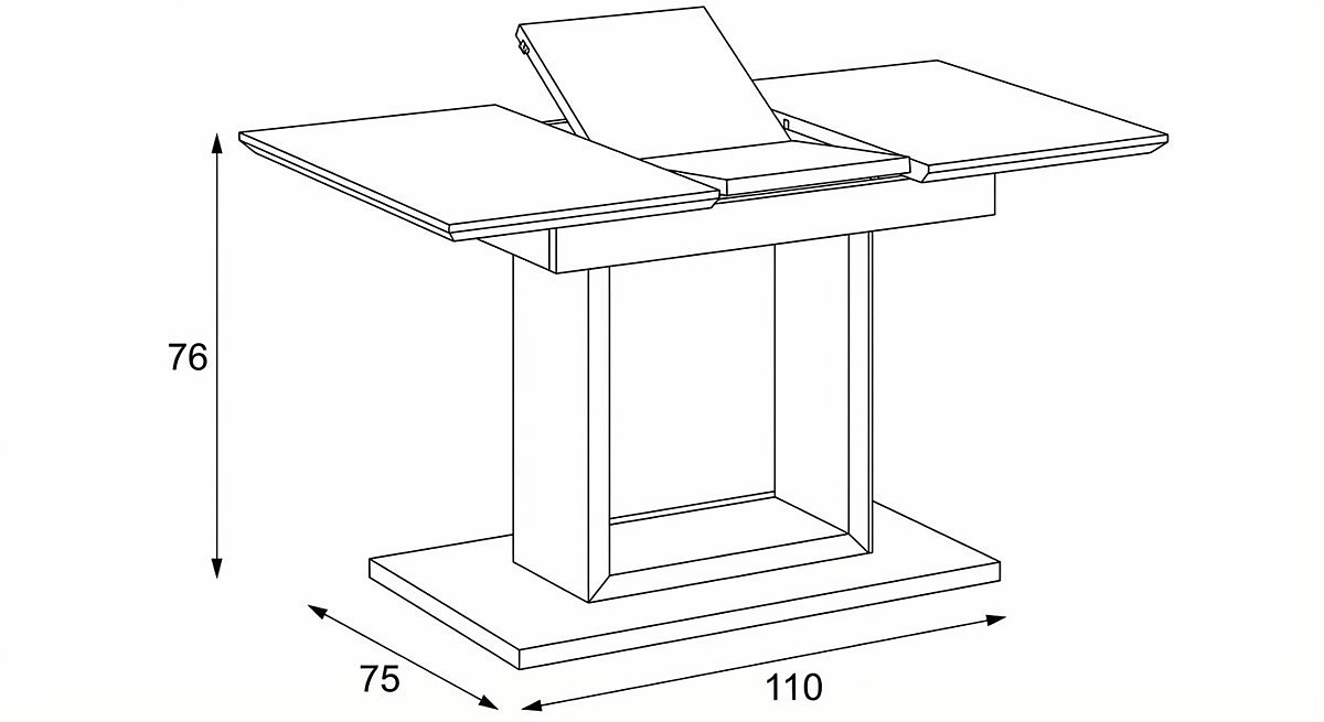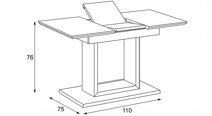 Designový jídelní rozkládací stůl o rozměru 110 + 40 x 75 cm. Vrchní stolová deska je tvrzeného skla tl. 4 mm v bílé barvě. Díl rozkladu je také krytý bílým sklem jako celá stolová deska, což nepatří ke standardům a řadí stůl do vyšší kategorie. Podkladová deska, centrální noha je z MDF je čistě bílá v matném provedení. Podesta je z také z MDF a krytá sklem v barvě. Ze spodní části opatřená plastovými kluzáky, eleminujícími poškození povrchů tvrdých podlah. Mechanické součásti jsou kovové. Stůl jistě zaujme svým nadčasovým designem i skvěloým zpracováním detailu a v neposlední řadě i barvou a stane se elegantním prvkem v moderních i klasicky laděných jídelnách, kuchyních a obývacích prostorách. Výška stolu je 76 cm. Ke stolu je možné umístit až 6 židlí.