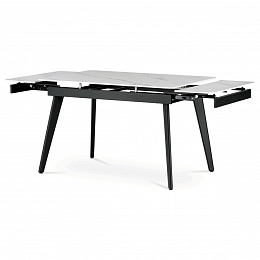 Jídelní rozkládací stůl HT-405M WT kombinuje moderní design s praktickou funkčností. Deska stolu je vyrobena z matné keramické plochy s mramorovým dekorem, která je odolná vůči poškrábání a snadno se udržuje v čistotě. Pevné kovové nohy v černé barvě zajišťují stabilitu a dlouhou životnost. Stůl disponuje rozkládacím mechanismem s možností prodloužení o 60 cm (2x 30 cm), který je vybaven uzamykacím systémem pro bezpečné a pevné zajištění v rozložené poloze. Rozměry 120+30+30x80x74 cm poskytují dostatek prostoru pro pohodlné stolování i větší společnost.