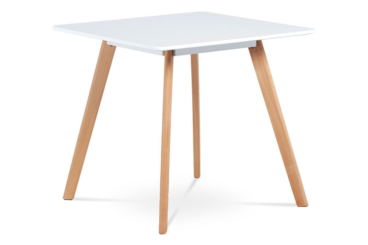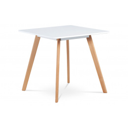 Moderní jídelní stůl s MDF deskou čtvercového tvaru, která je lakována bílou matnou barvou a je 2 cm vysoká. Podnož z bukového masivu v přírodním odstínu je vybavena pěnovými kluzáky a rozteče nohou jsou 42 a 42 cm.