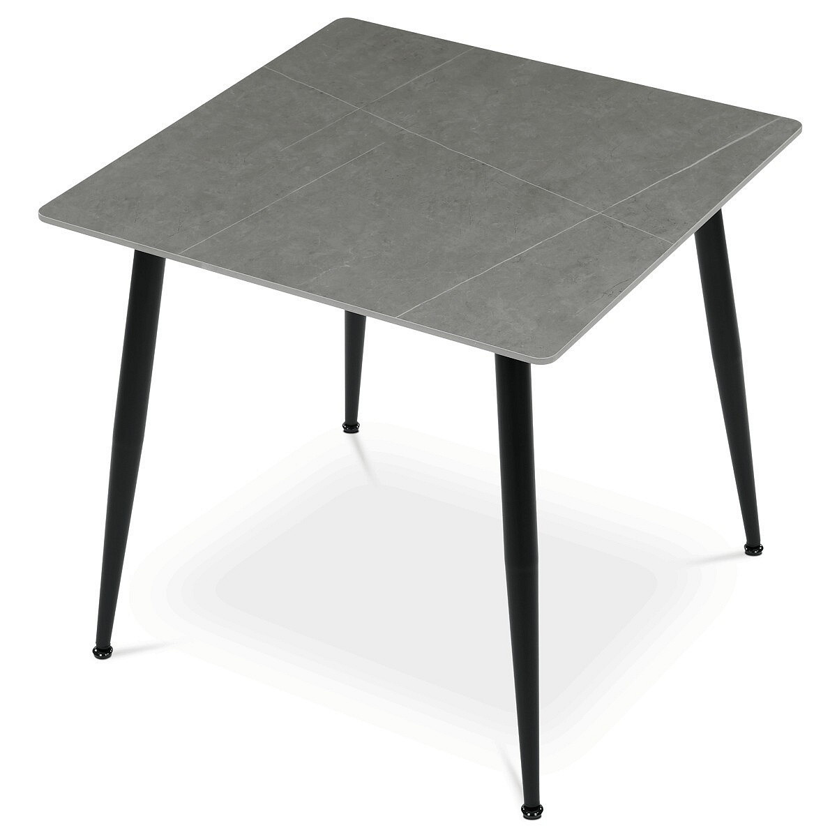 Jídelní stůl o rozměru 80x80 cm s keramickou deskou v šedém mramorovém dekoru nabízí moderní a odolné řešení pro každou jídelnu. Deska je vyrobena z matné keramiky, která je snadno udržovatelná a odolná vůči poškrábání i vysokým teplotám. Stabilní kovové nohy v černém provedení jsou opatřeny rektifikačními patkami, které umožňují vyrovnání nerovností podlahy a zajišťují pevnou oporu. Minimalistický design s tenkou deskou a mírně zkosenými nohami podtrhuje současný styl nábytku. Nosnost stolu odpovídá běžnému užívání v domácnosti i menších provozech.