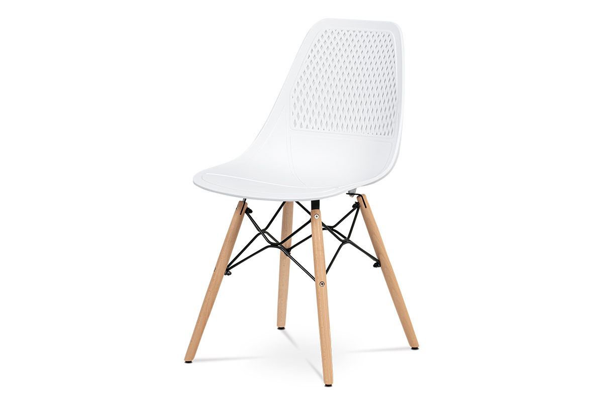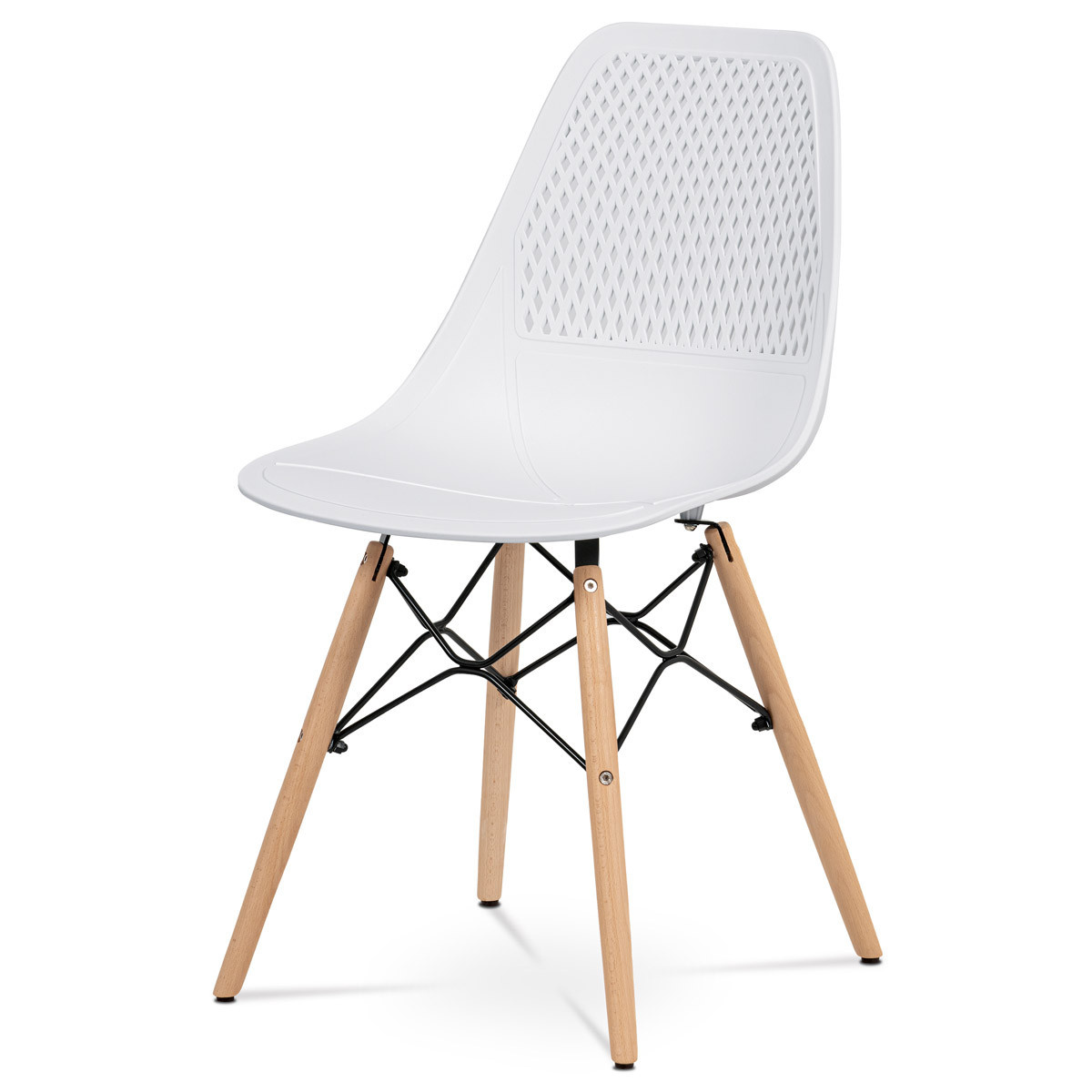Moderní jídelní židle se světovým designem! Populární židle se díky svému designu hodí nejen do kuchyní či jídelen, ale i do pracoven či zasedacích místností. Pohodlný sedák je z pevného plastu bílé barvy a jeho nedílnou součástí jsou i designové prvky jako je například drobné průduchy v horní části opěráku. Pevná podnož z masivu v přírodním odstínu je zpevněná pomocí kovové trnože matné černé barvy, která navíc židli dodává mimořádný vzhled. Součástí podnože jsou i černé plastové kluzáky, které snižují riziko poškození podlahy. Nosnost židle je až 110 kg.