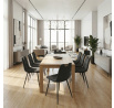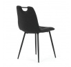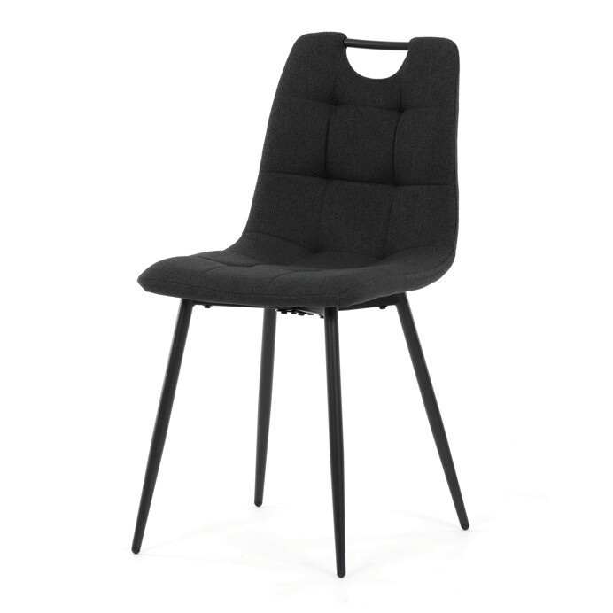Jídelní židle s označením DCL-V2017 BK2 kombinuje moderní design s praktickými detaily. Sedák a opěradlo jsou potaženy černou látkou, která je snadno udržovatelná a doplněná designovým prošitím pro zvýraznění estetického dojmu. Černé kovové nohy s matnou povrchovou úpravou zajišťují stabilitu a pevnost celé židle. Součástí opěradla je praktické madlo, které usnadňuje manipulaci a přenášení židle. Židle nemá područky ani otočný mechanismus, což ji činí vhodnou pro jídelní prostory s omezeným prostorem.
