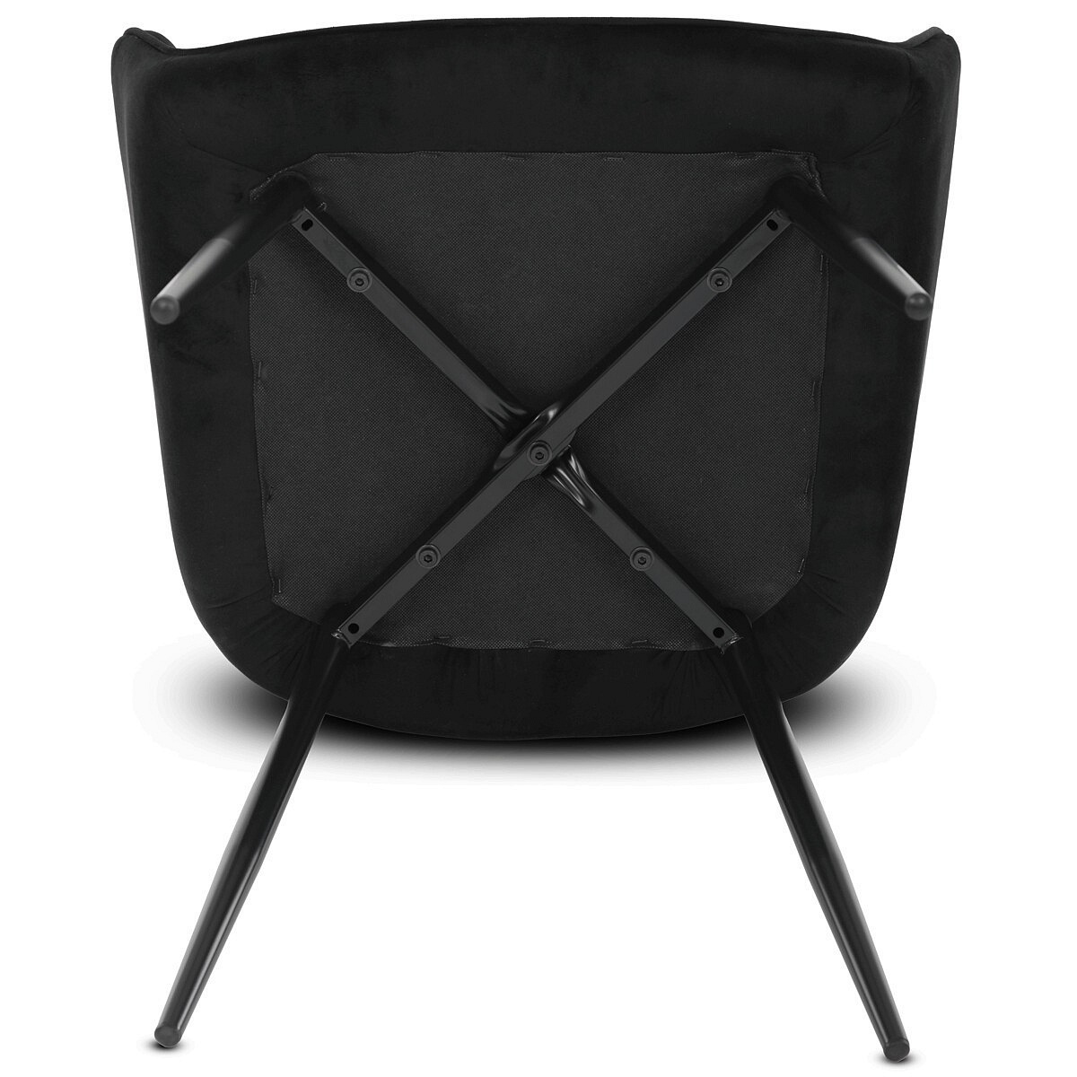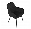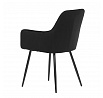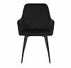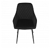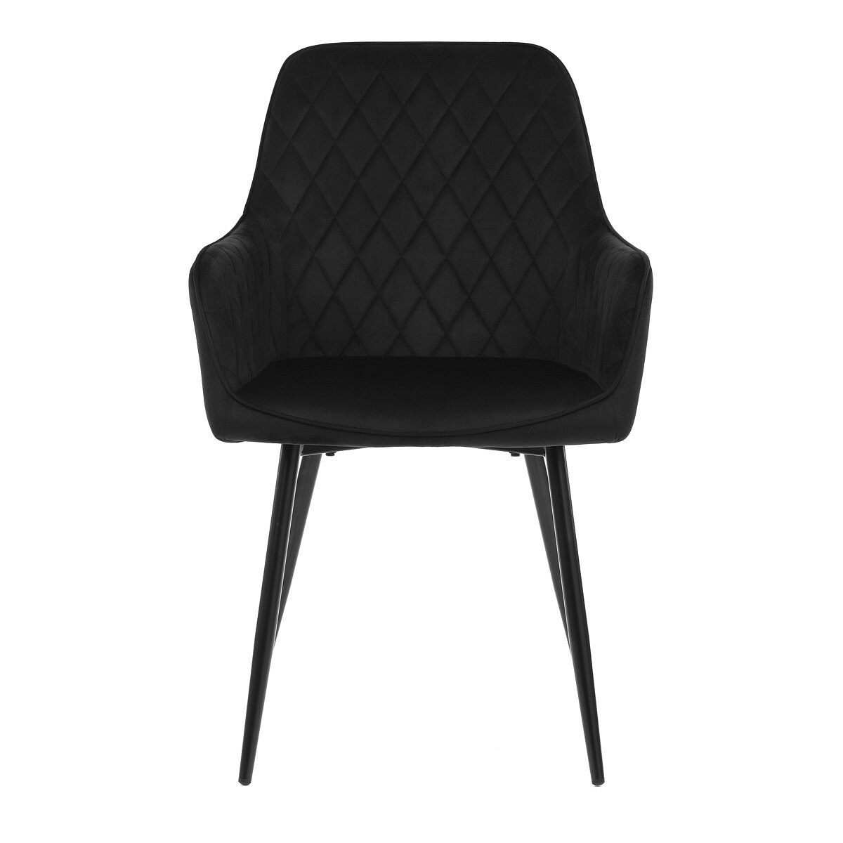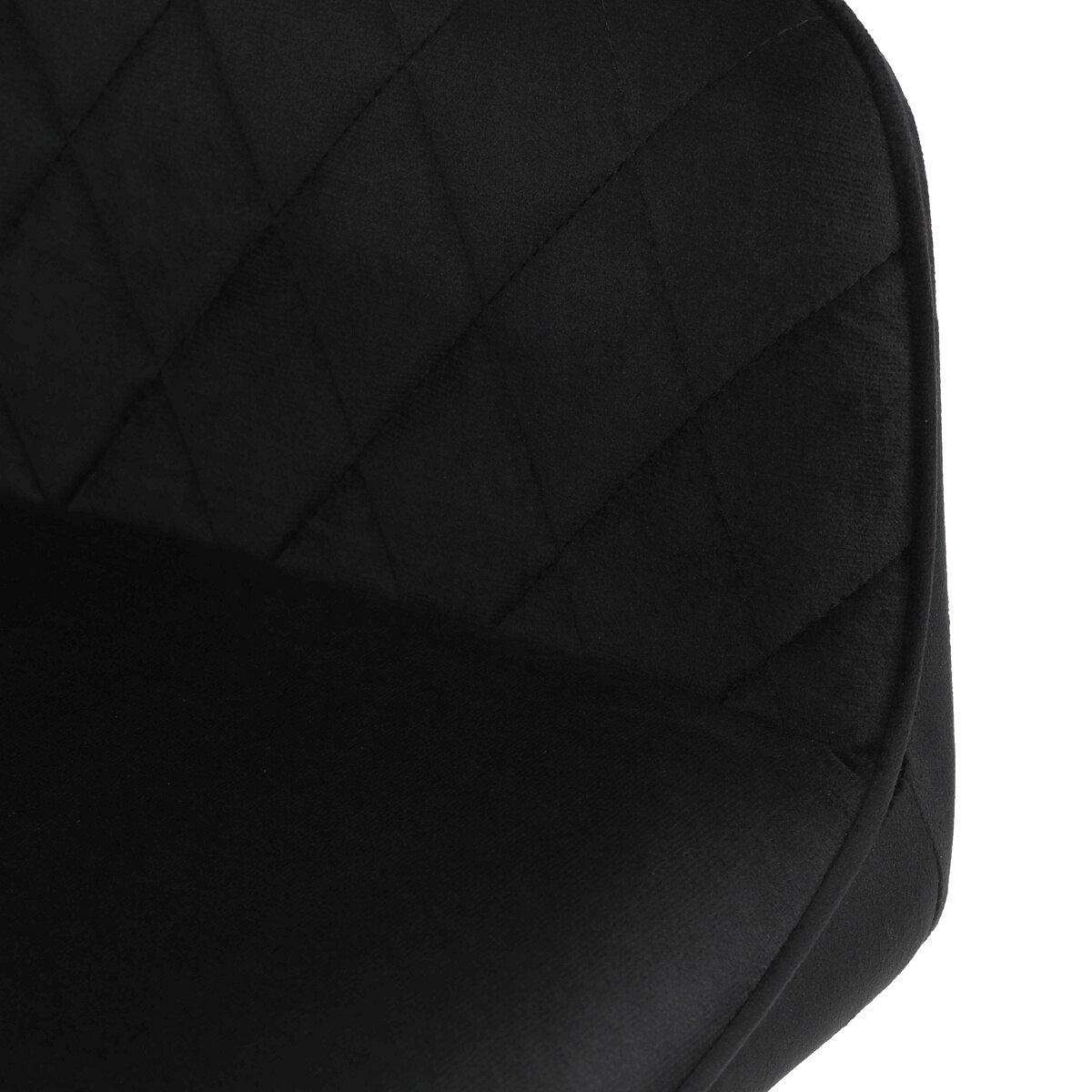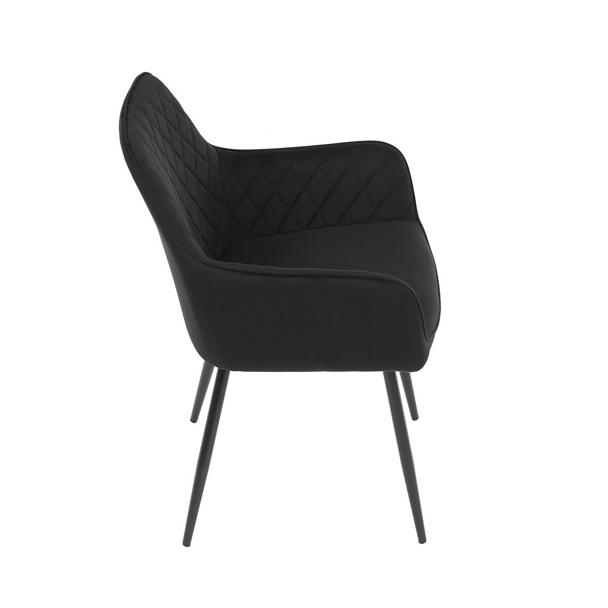 Jídelní židle s černým sametovým potahem nabízí pohodlné sezení díky měkkému čalounění a ergonomicky tvarovaným područkám. Čalounění je doplněno designovým prošitím v kosočtverečkovém vzoru, které zvýrazňuje její moderní vzhled. Pevné kovové nohy v černém matném provedení zajišťují stabilitu a dlouhou životnost židle. Sametová látka je příjemná na dotek a snadno se udržuje, což ji předurčuje k použití v jídelnách i dalších obytných prostorách. Židle není otočná, což přispívá k její jednoduché a pevné konstrukci.