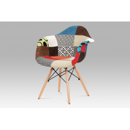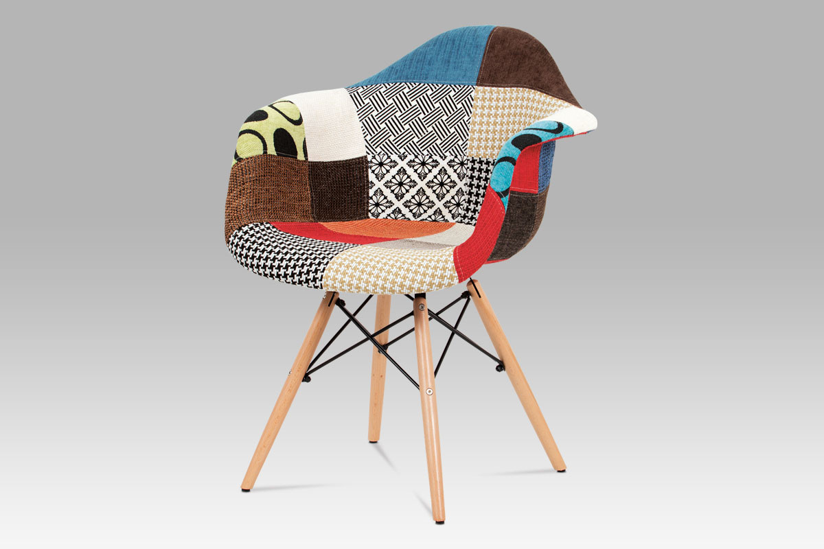 Retro jídelní židle v žádaném provedení patchwork, nohy jsou z lakovaného masivního bukového dřeva v přírodním odstínu s černými kovovými výztuhami. Tyto židle budou skvělým designovým doplňkem. Nosnost této židle je do 110 kg.