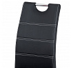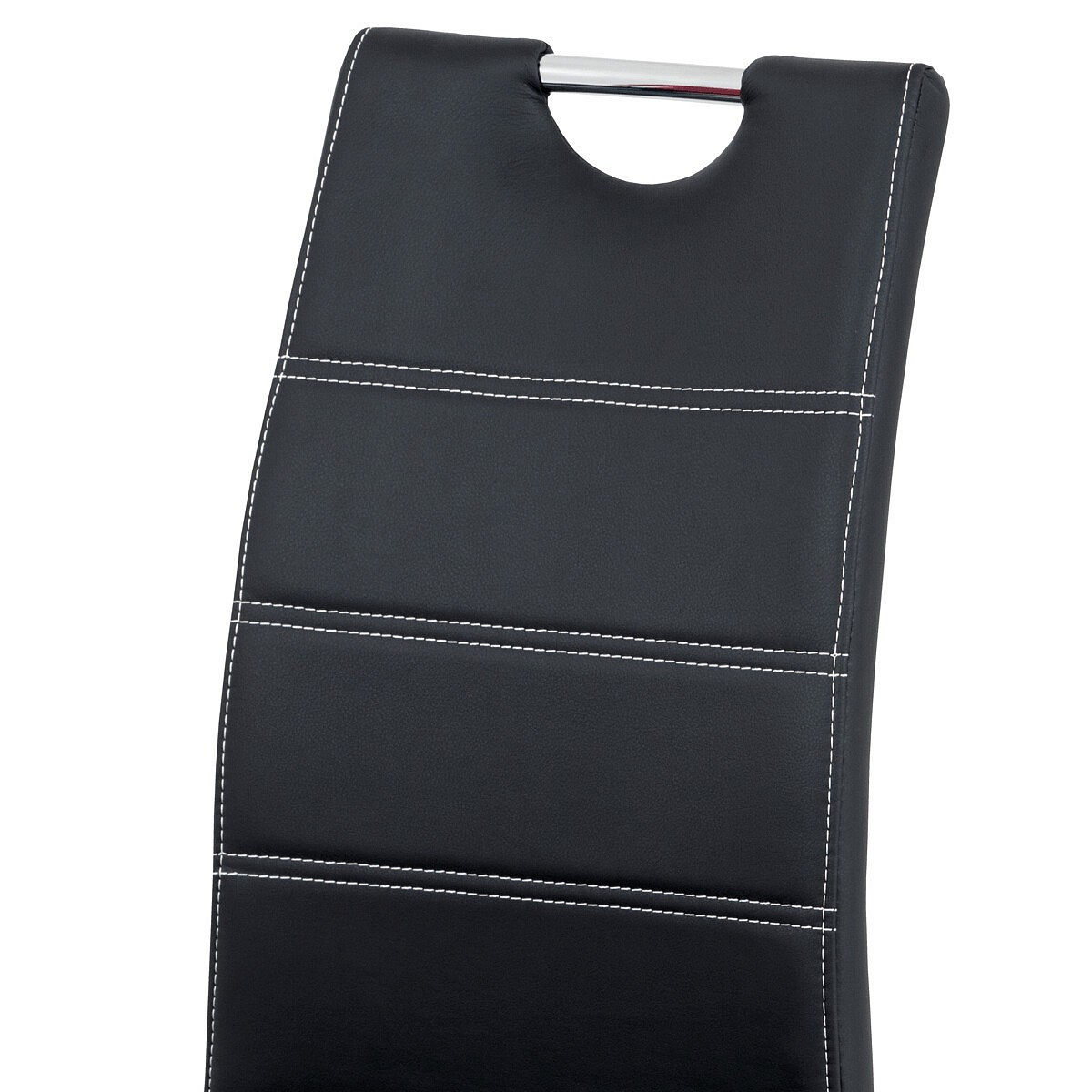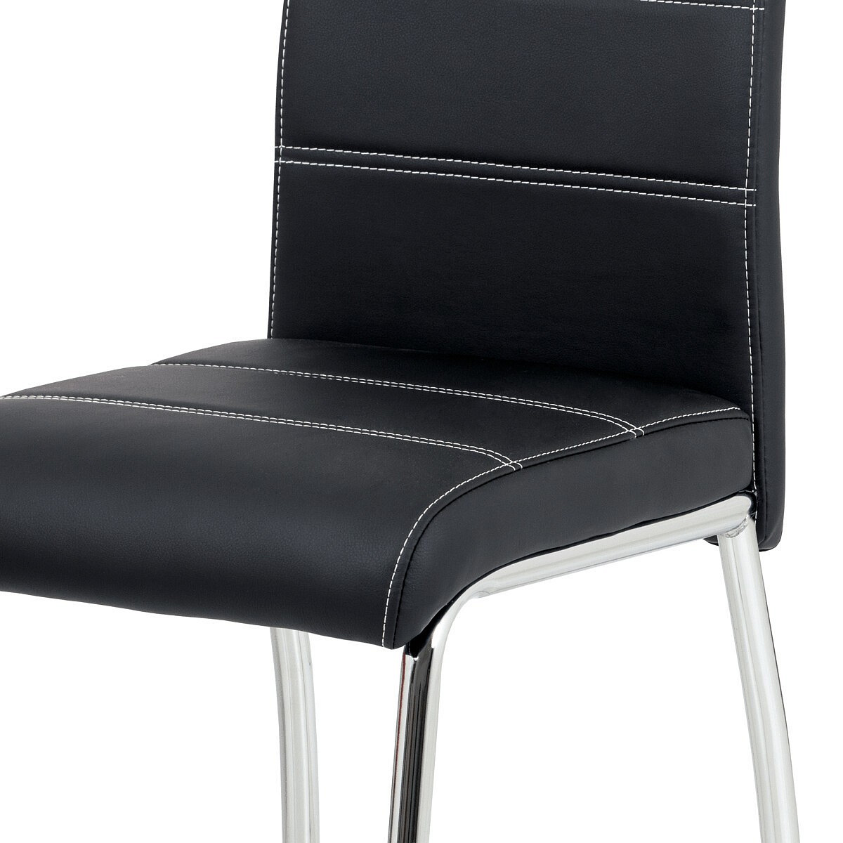 Jídelní židle s čalouněním z černé ekokůže je doplněna výrazným bílým prošitím, které podtrhuje její moderní design. Sedák i opěradlo jsou vyplněny pohodlnou pěnou, která zajišťuje komfort při sezení. Pevná čtyřnohá podnož z chromovaného kovu poskytuje stabilitu a odolnost, zároveň dodává židli elegantní lesklý vzhled. Židle nemá područky ani možnost výškového nastavení, což ji činí kompaktní a snadno kombinovatelnou s různými typy jídelních stolů. Celková konstrukce je navržena pro dlouhou životnost a snadnou údržbu.