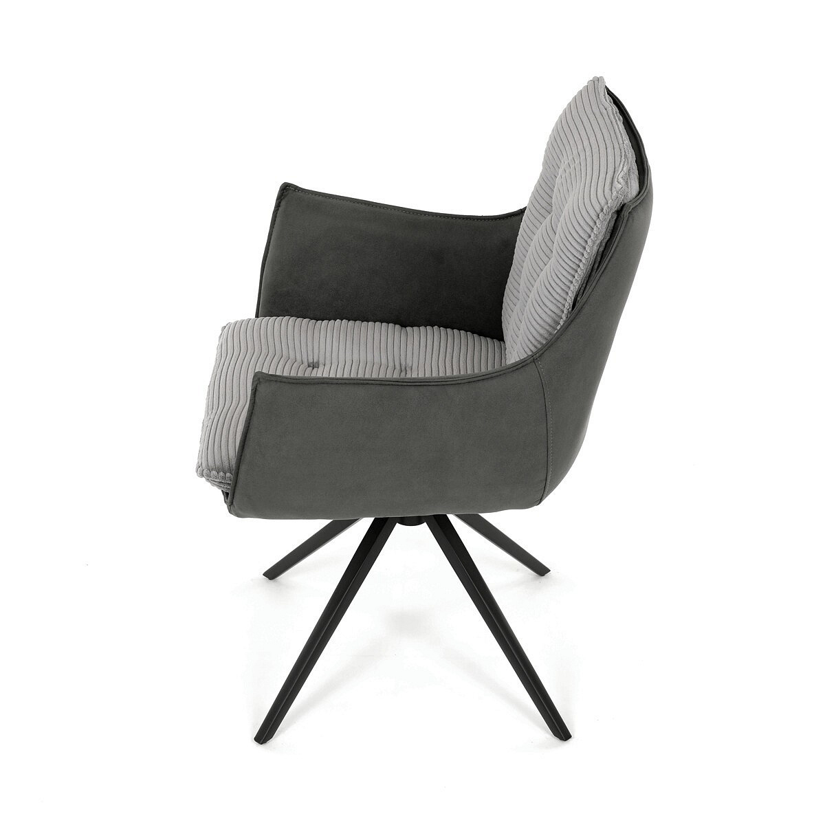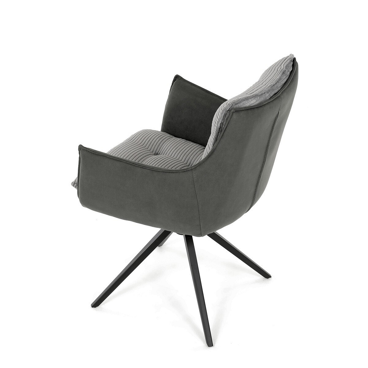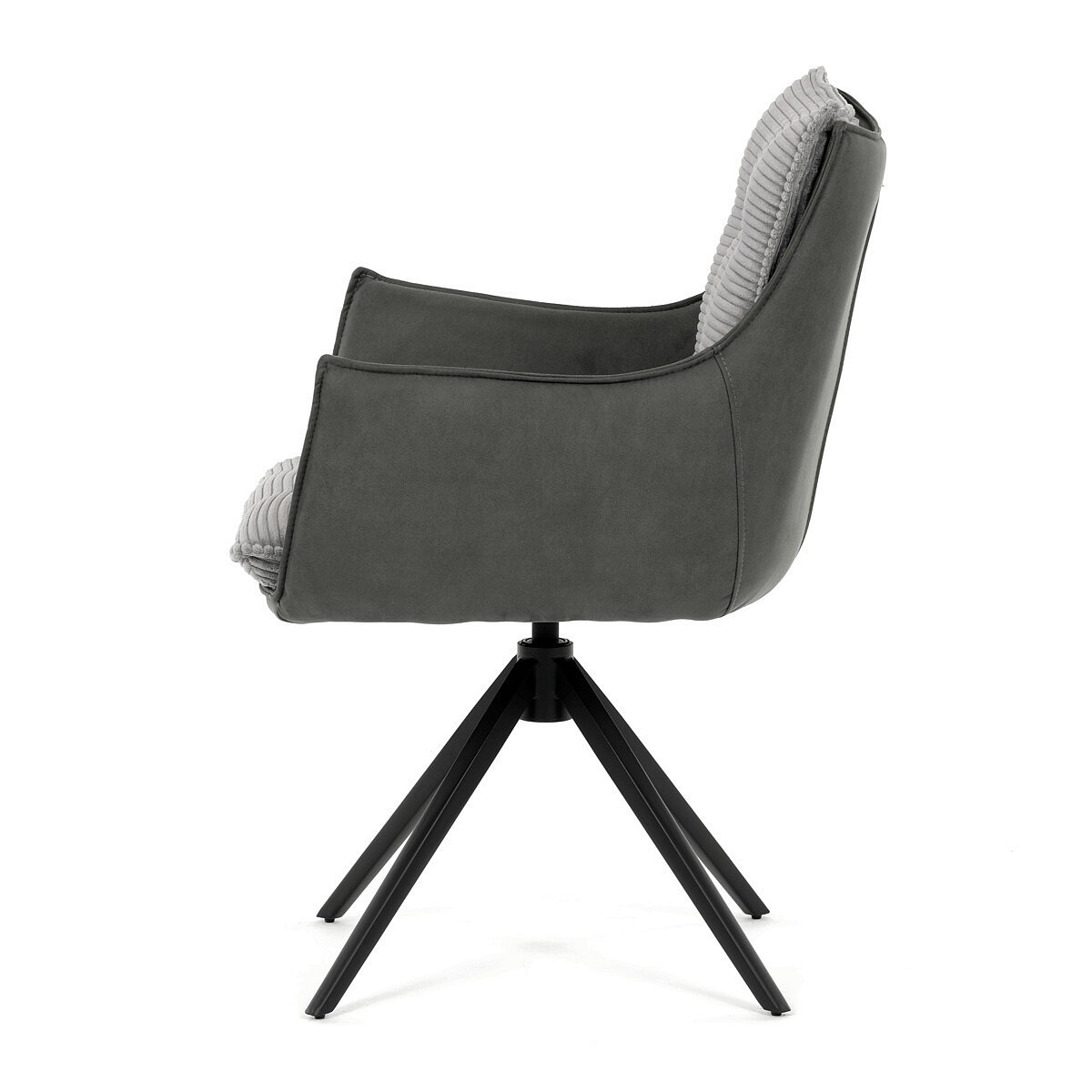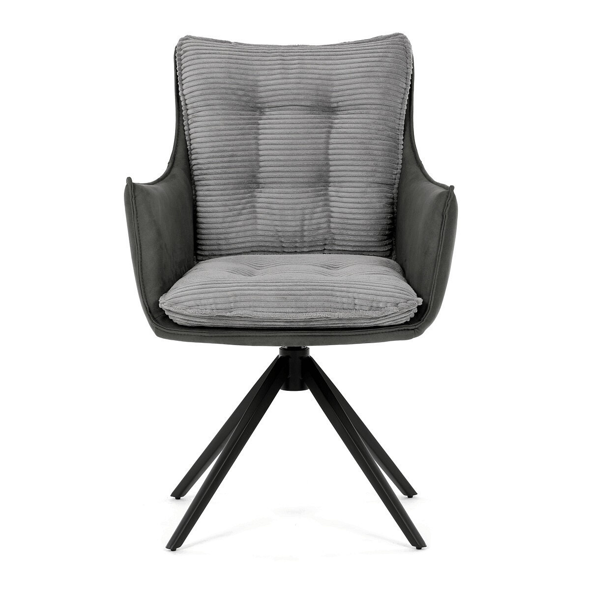 Jídelní židle DCH-D1345 GREY2 značky Autronic vyniká otočným 360° vratným mechanismem, který zajišťuje plynulý a tichý návrat do výchozí polohy, což přispívá k pohodlí a praktičnosti při používání. Konstrukce židle kombinuje pevný černý kovový rám s moderním designem čtyřnohé podnože, která zaručuje stabilitu a dlouhou životnost. Sedák a opěradlo jsou potaženy kombinací dvou typů šedé látky, přičemž vnitřní část tvoří měkký, žebrovaný textil s vysokým polstrováním, které poskytuje ergonomickou podporu a komfort i při delším sezení. Čalounění je pečlivě prošité a tvarované tak, aby zvýraznilo estetiku a zároveň zajistilo dostatečnou prodyšnost materiálu. Područky jsou integrovány do celkové konstrukce sedáku, což zvyšuje komfort bez omezení pohybu. Díky kombinaci kvalitních materiálů a funkčních prvků je židle vhodná pro moderní jídelny i pracovní prostory, kde je kladen důraz na design i uživatelský komfort.