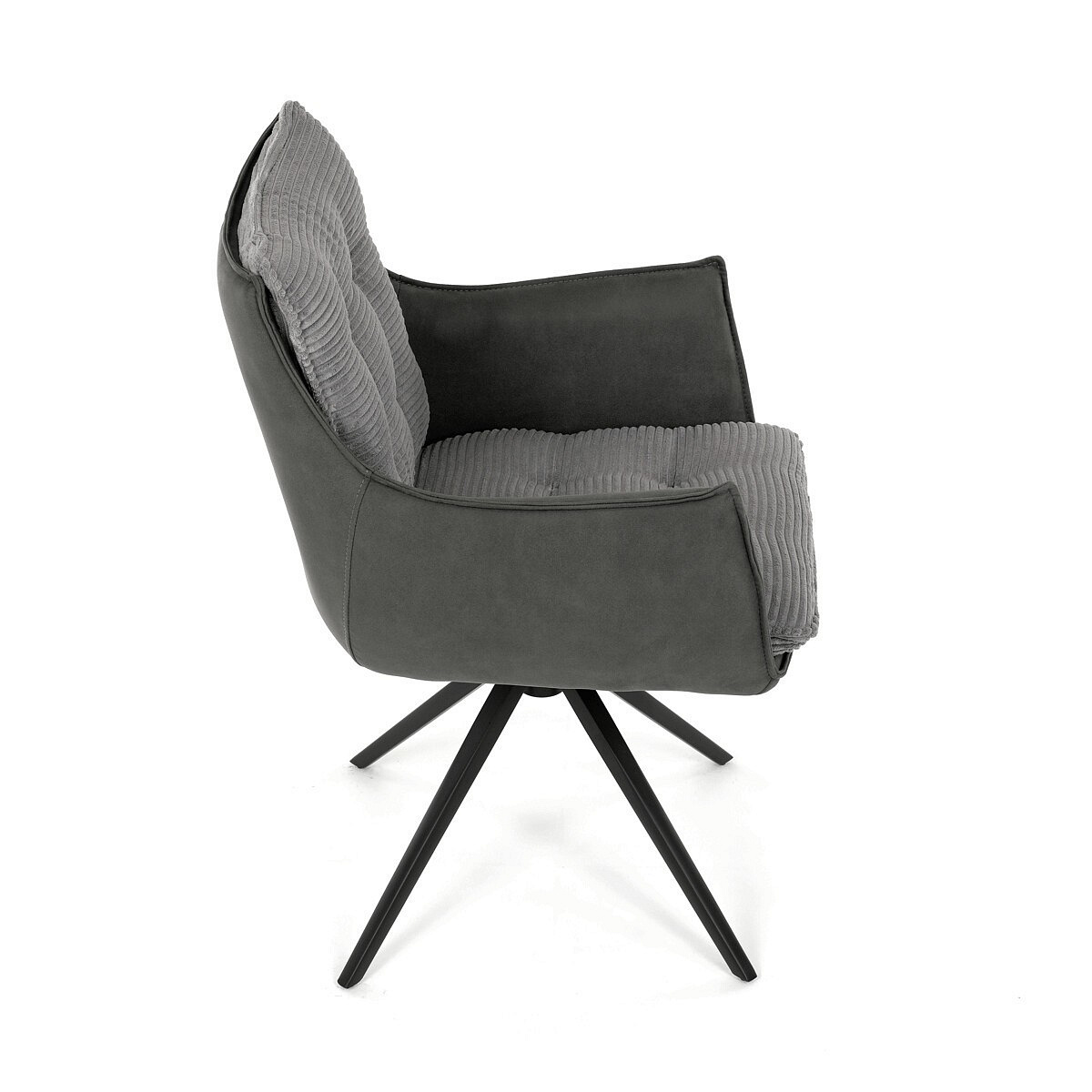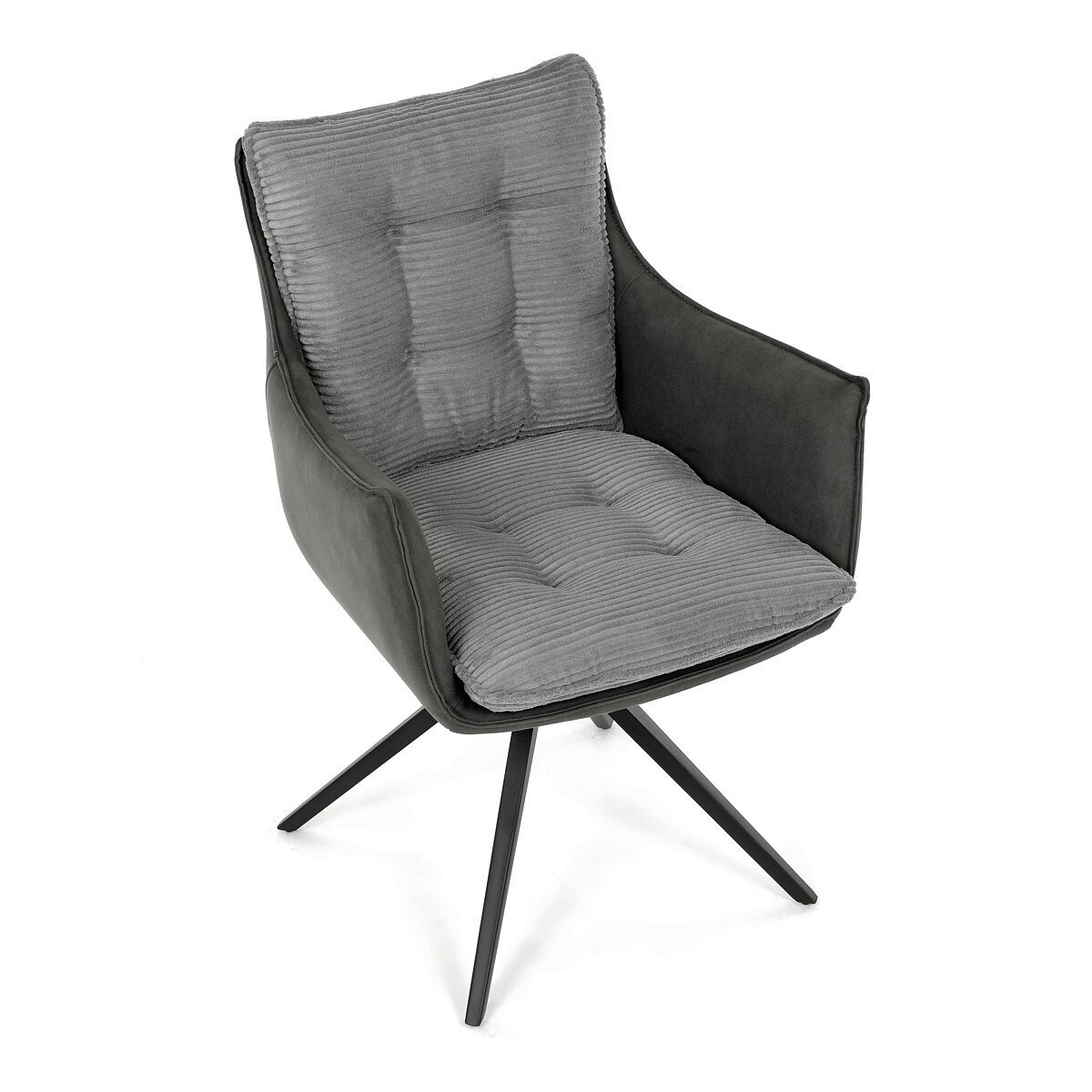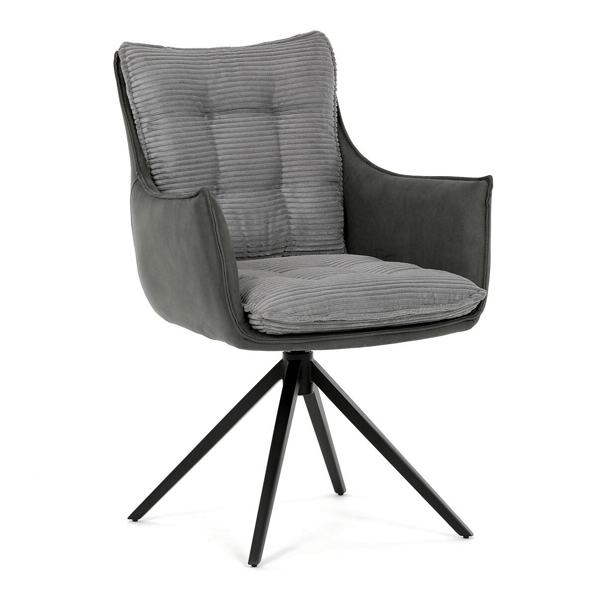Jídelní židle DCH-D1345 GREY2 značky Autronic vyniká otočným 360° vratným mechanismem, který zajišťuje plynulý a tichý návrat do výchozí polohy, což přispívá k pohodlí a praktičnosti při používání. Konstrukce židle kombinuje pevný černý kovový rám s moderním designem čtyřnohé podnože, která zaručuje stabilitu a dlouhou životnost. Sedák a opěradlo jsou potaženy kombinací dvou typů šedé látky, přičemž vnitřní část tvoří měkký, žebrovaný textil s vysokým polstrováním, které poskytuje ergonomickou podporu a komfort i při delším sezení. Čalounění je pečlivě prošité a tvarované tak, aby zvýraznilo estetiku a zároveň zajistilo dostatečnou prodyšnost materiálu. Područky jsou integrovány do celkové konstrukce sedáku, což zvyšuje komfort bez omezení pohybu. Díky kombinaci kvalitních materiálů a funkčních prvků je židle vhodná pro moderní jídelny i pracovní prostory, kde je kladen důraz na design i uživatelský komfort.
