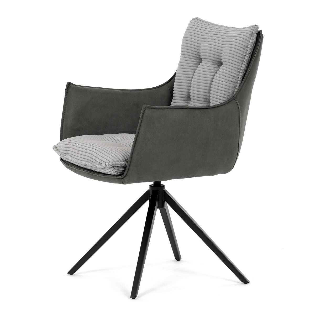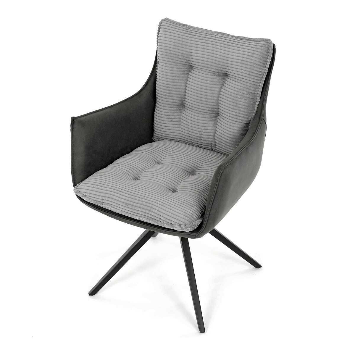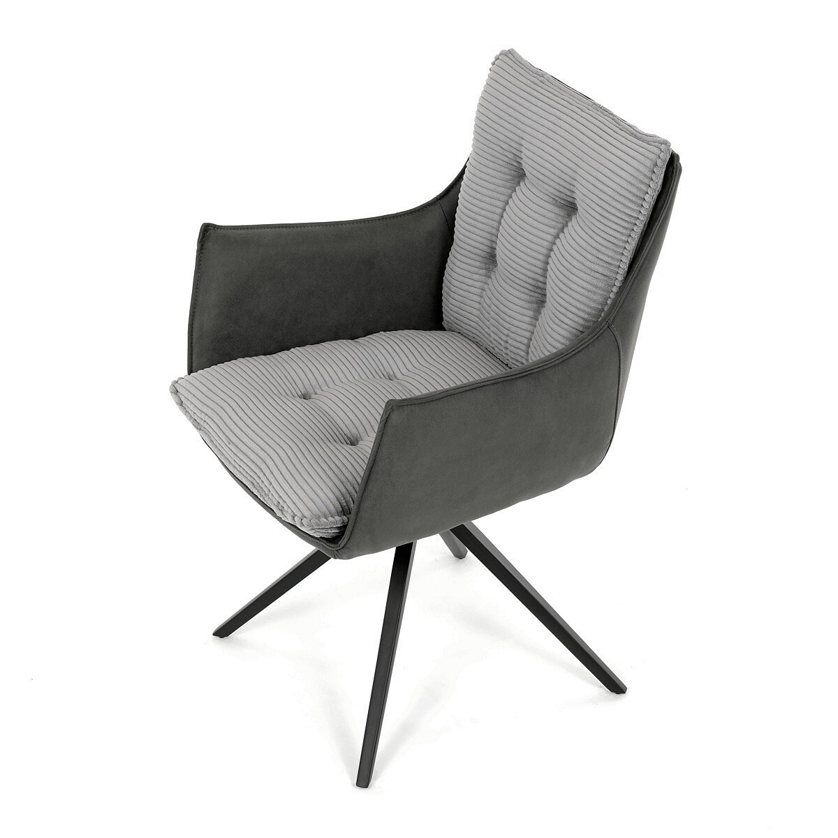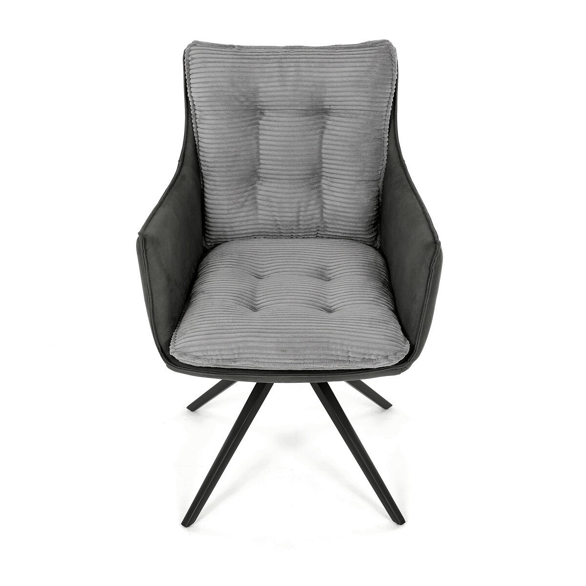 Jídelní židle DCH-D1345 GREY2 značky Autronic vyniká otočným 360° vratným mechanismem, který zajišťuje plynulý a tichý návrat do výchozí polohy, což přispívá k pohodlí a praktičnosti při používání. Konstrukce židle kombinuje pevný černý kovový rám s moderním designem čtyřnohé podnože, která zaručuje stabilitu a dlouhou životnost. Sedák a opěradlo jsou potaženy kombinací dvou typů šedé látky, přičemž vnitřní část tvoří měkký, žebrovaný textil s vysokým polstrováním, které poskytuje ergonomickou podporu a komfort i při delším sezení. Čalounění je pečlivě prošité a tvarované tak, aby zvýraznilo estetiku a zároveň zajistilo dostatečnou prodyšnost materiálu. Područky jsou integrovány do celkové konstrukce sedáku, což zvyšuje komfort bez omezení pohybu. Díky kombinaci kvalitních materiálů a funkčních prvků je židle vhodná pro moderní jídelny i pracovní prostory, kde je kladen důraz na design i uživatelský komfort.