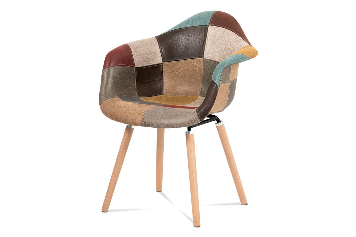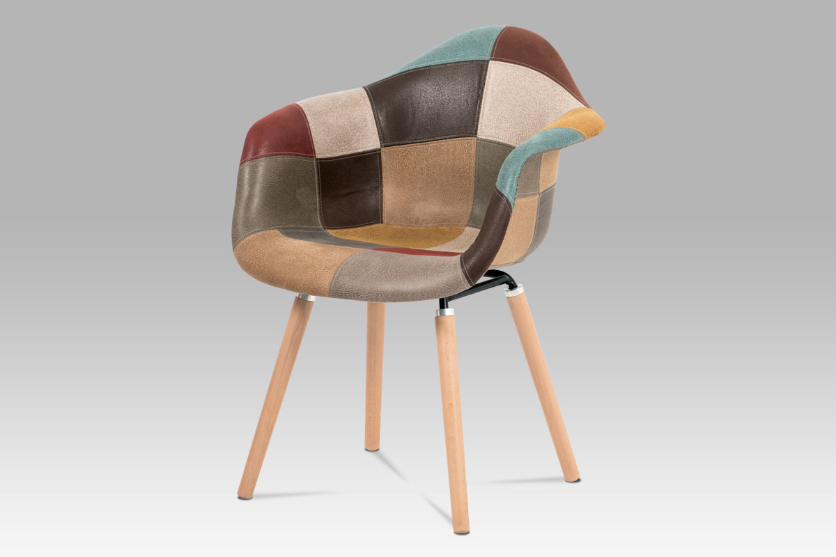 Retro jídelní židle zaujme svým nadčasovým designem a precizním zpracováním. Sedák je čalouněný vícebarevnou látkou patchwork imitující broušenou kůži. Ruce si můžete pohodlně opřít o příjemné područky. Nohy jsou z masivního buku v přírodním odstínu a jsou spojeny poctivou kovovou základnou černé barvy. Součástí podnože jsou černé plastové kluzáky, které snižují riziko poškození Vaší podlahy. Nosnost židle je až 110 kg.