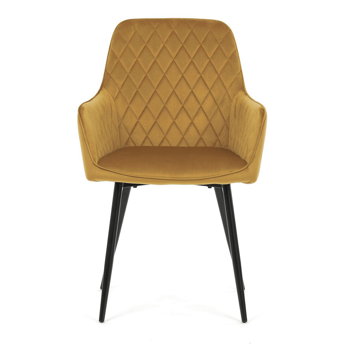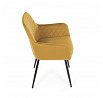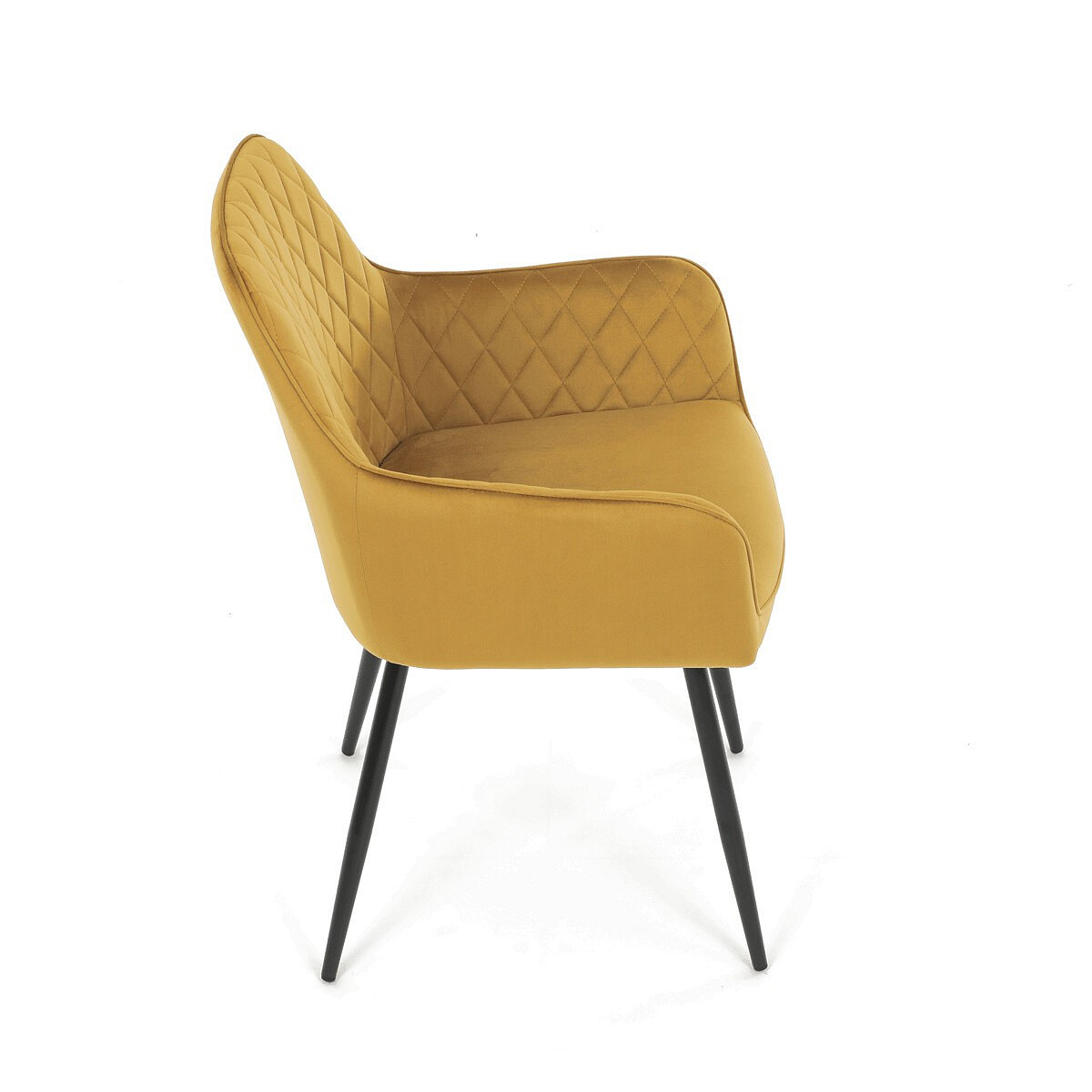 Jídelní židle s označením DCH-215 YEL4 nabízí pohodlné sezení díky čalounění z měkké žluté sametové látky, která je doplněna designovým prošitím v kosočtverečném vzoru na opěradle a područkách. Pevné kovové nohy v černém matném provedení zajišťují stabilitu a dlouhou životnost židle. Ergonomicky tvarované opěradlo s integrovanými područkami podporuje správné držení těla během stolování. Sametová látka je příjemná na dotek a snadno se udržuje, což přispívá k praktickému využití v domácnostech i komerčních prostorách. Židle není otočná, její jednoduchý a zároveň stylový design ji předurčuje k využití v moderních interiérech.