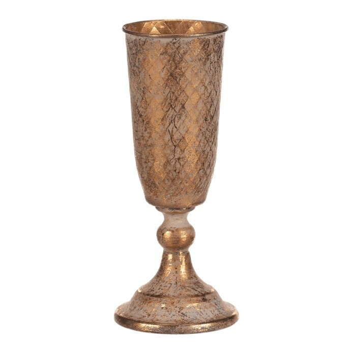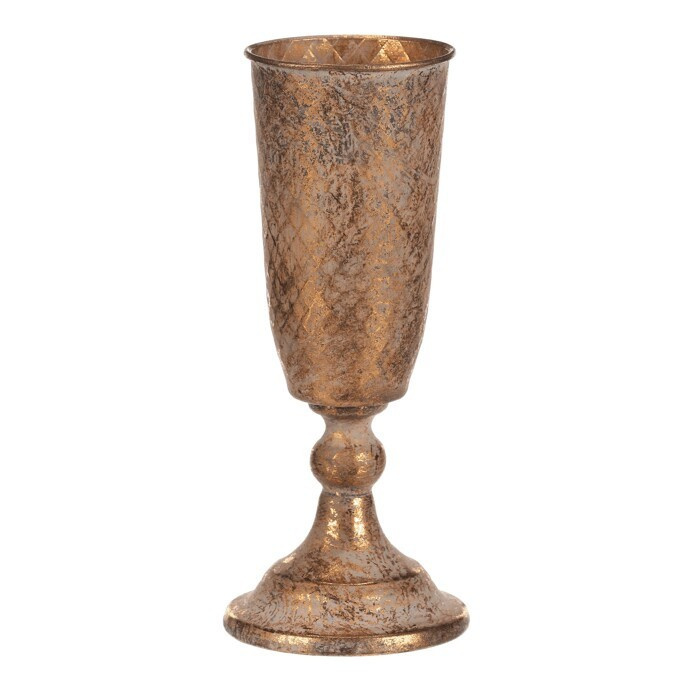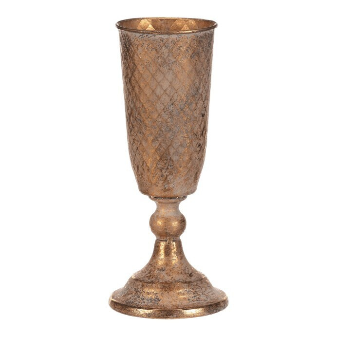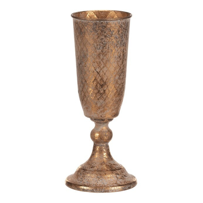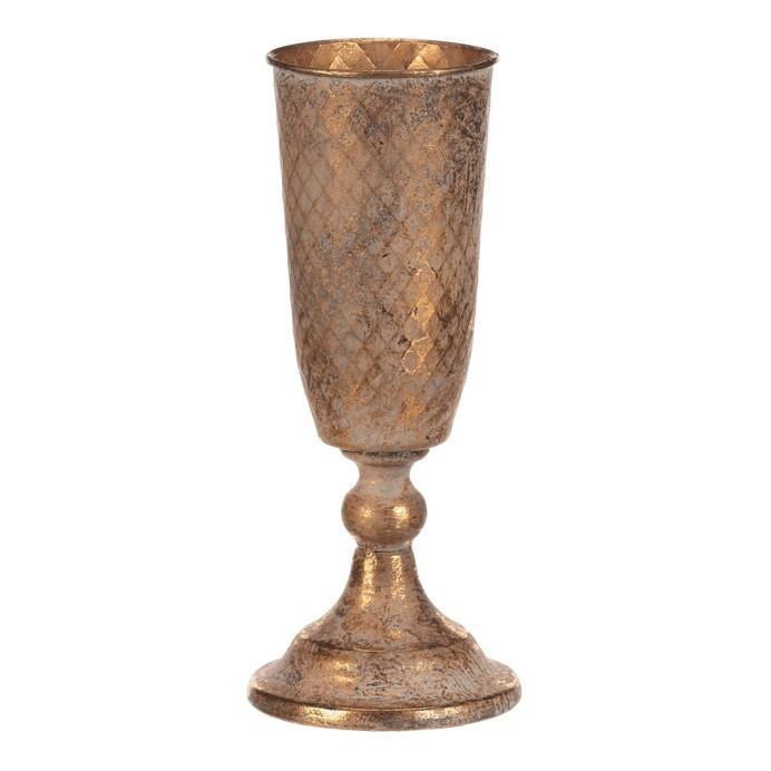Úzký kovový kalich z naší přepychové kolekce dekoračního zboží, vám přináší noblesu a eleganci přímo na váš stůl. Zlatá barva a starožitný vzhled povýší vaše každodenní stolování na královskou úroveň. S tímto unikátním artiklem, který věrně připomíná cenný předmět s historickou hodnotou, se budete cítit jako host na královském dvoře, zářící luxusem. Přiveďte si do svého interiéru unikátní ozdobný prvek a proměňte běžné stolování v nezapomenutelnou událost plné romantiky a elegance.