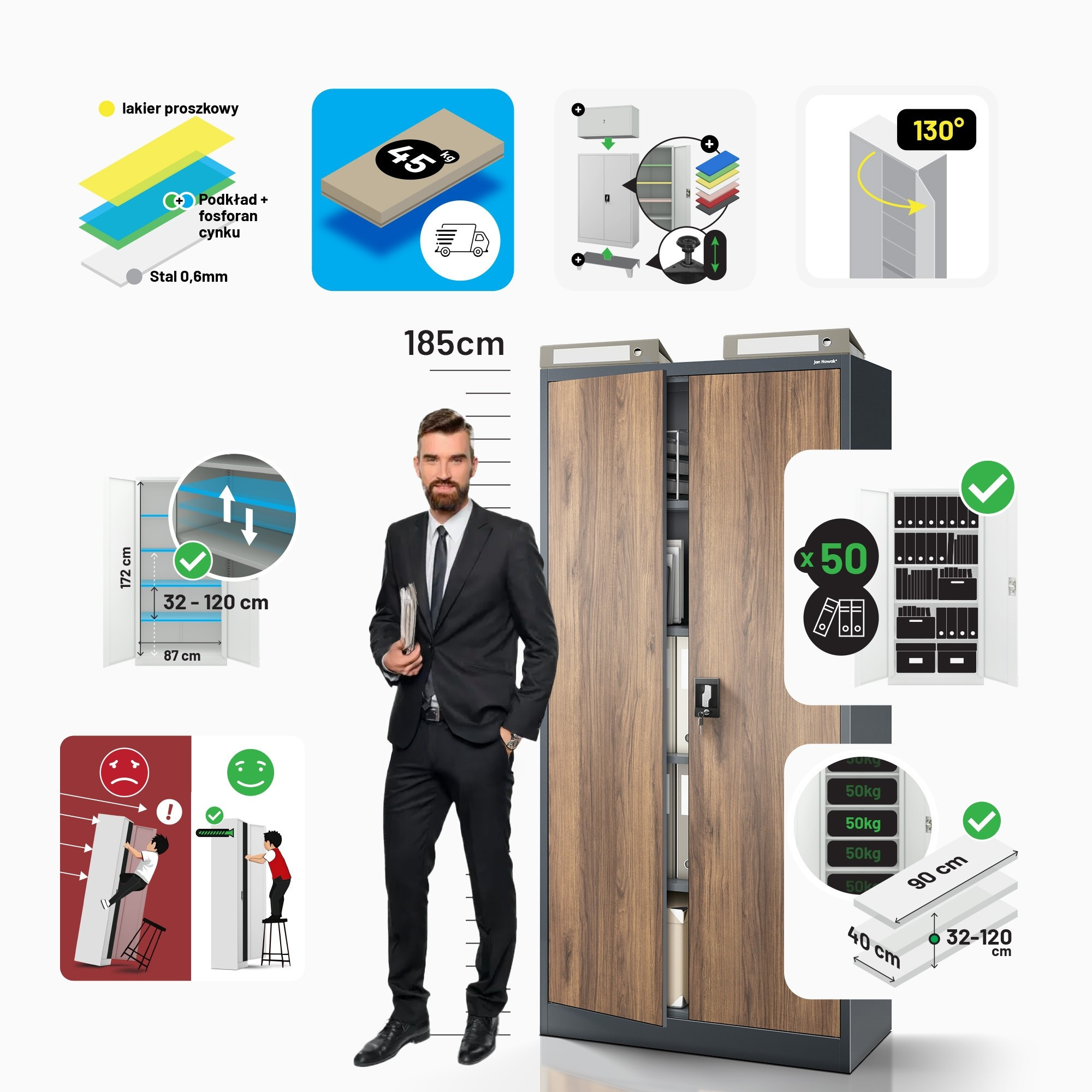 #html-body [data-pb-style=X17UQ5T]{margin-bottom:30px}#html-body [data-pb-style=DM7I6PN],#html-body [data-pb-style=X17UQ5T]{justify-content:flex-start;display:flex;flex-direction:column;background-position:left top;background-size:cover;background-repeat:no-repeat;background-attachment:scroll}#html-body [data-pb-style=GYR7K07]{border-style:none}#html-body [data-pb-style=JR4HE3X],#html-body [data-pb-style=UTYW83U]{max-width:100%;height:auto}@media only screen and (max-width: 768px) { #html-body [data-pb-style=GYR7K07]{border-style:none} }Uzamykatelná kovová skříň Eco Design model JAN kancelářská skříň / na dokumenty / ocel 0,6 mm ANTRACIT (RAL 7016) / OŘECH JAN – ocelová skříň do kanceláře, do dílny, do pracovny Pro model JAN lze najít mnoho využití. Osvědčí se jako kancelářská skříň, skříň do dílny nebo lékařská skříň. Vybaví kanceláře, pracovny, úřady nebo sekretariáty. Uloží šanony, složky, spisy, lékařské vybavení nebo léky, a dokonce i nástroje. JAN je kovová skříň s desítkami funkcí. JAN není jen prostorný a spolehlivý, ale také výjimečný z hlediska designu. Speciální, odolná proti oděru barva připomíná svým vzhledem ořechové dřevo. Sérii Eco Design jsme vytvořili pro ty, kteří chtějí vytvořit klasické, elegantní interiéry, aniž by se vzdali trvanlivosti, kterou se vyznačuje kovová skříň. Péče o životní prostředí je jednou z našich priorit, a právě proto vyrábíme skříně z oceli. Skříň na dokumenty JAN – revoluce na každém místě Naše kancelářská skříň je nábytek, který zefektivní každodenní práci na každém místě. Jeho nastavitelné police po 25 mm lze snadno přizpůsobit individuálním potřebám. Nosnost každé z polic je až 50 kg a kapacita JANA je dokonce 50 šanonů. Kovová skříň do kanceláře by měla být přece prostorná a praktická. Naše kancelářská skříň umožňuje uchovávat dokumenty v souladu s platnými předpisy GDPR. Model JAN má zámek zajištěný ve 3 bodech, se dvěma klíči v sadě, takže dokonale zabezpečí uložený obsah. Práškově lakovaná ocel o tloušťce 0,6 mm je odolná vůči mechanickému poškození a pevně spojené prvky zajišťují, že konstrukce zůstává stabilní i při maximálním zatížení. Naše kovová skříň má otvory na zadní a boční stěně, které umožňují její připevnění ke stěně místnosti. Díky tomu je JAN kancelářská skříň, která zaručuje nezbytnou bezpečnost při každodenním používání. Dodatečně otvory v horní části skříně umožňují připevnit nástavec. Kovová skříň JAN - specifikace Výška: 185 cm Šířka: 90 cm Hloubka: 40 cm Hmotnost: 40 kg Barva: antracit (RAL 7016) / ořech Proč důvěřovat značce JAN NOWAK? Nejlepší materiály a spolehlivá kvalita zpracování. Naše kovové skříně jsou kryty zárukou kvality. Ocelová skříň JAN má certifikát PZH. Bude bezpečná pro vaše zákazníky nebo zaměstnance. JAN ti umožní uchovávat dokumenty obsahující osobní údaje v souladu s platnými předpisy. Naše kancelářská skříň je připravena na GDPR! Důležité: Naše kovová skříň vyžaduje vlastní montáž. V sadě se nachází srozumitelný návod. Kolekce Značka je jedním z největších výrobců a dodavatelů kovových skříní v celé Evropě.