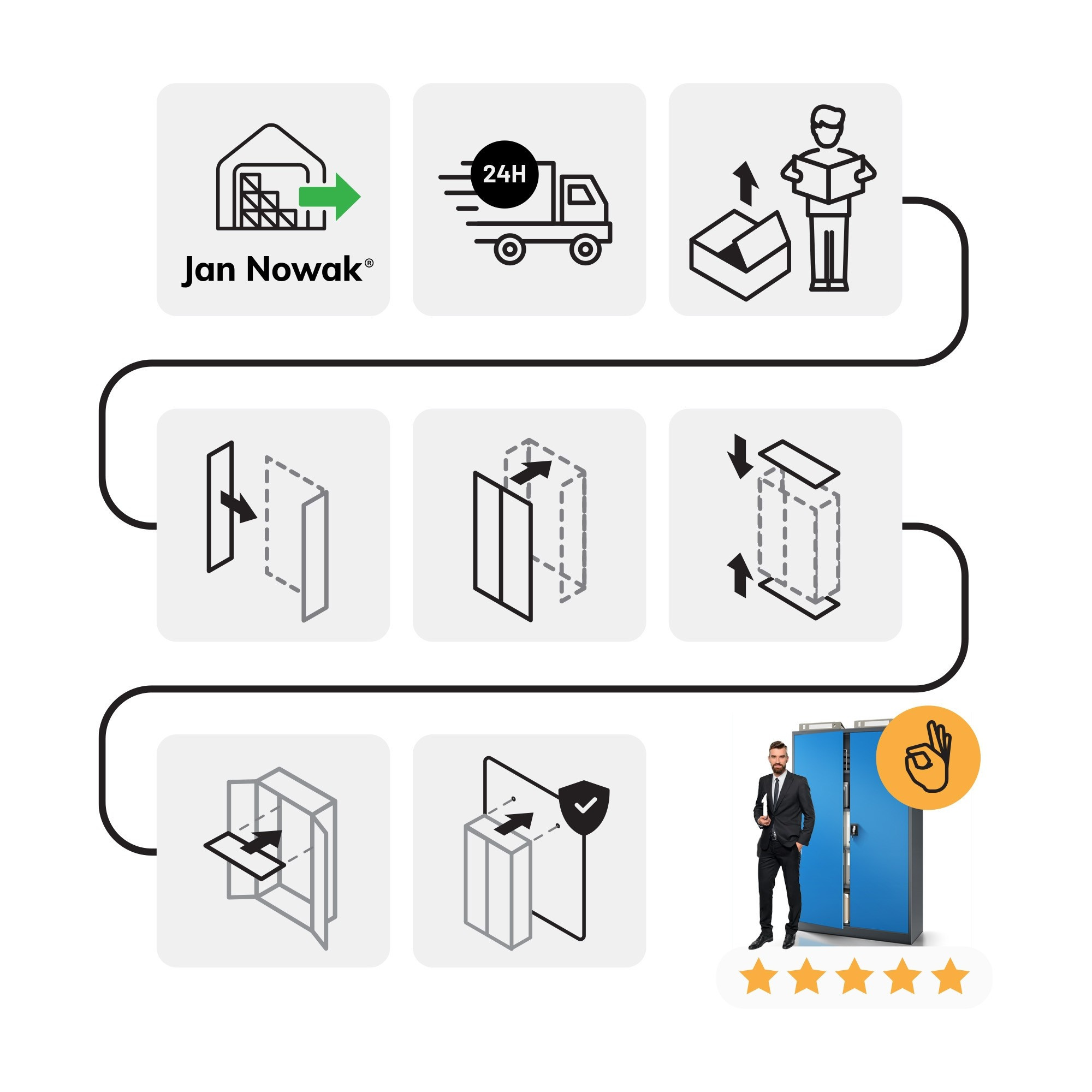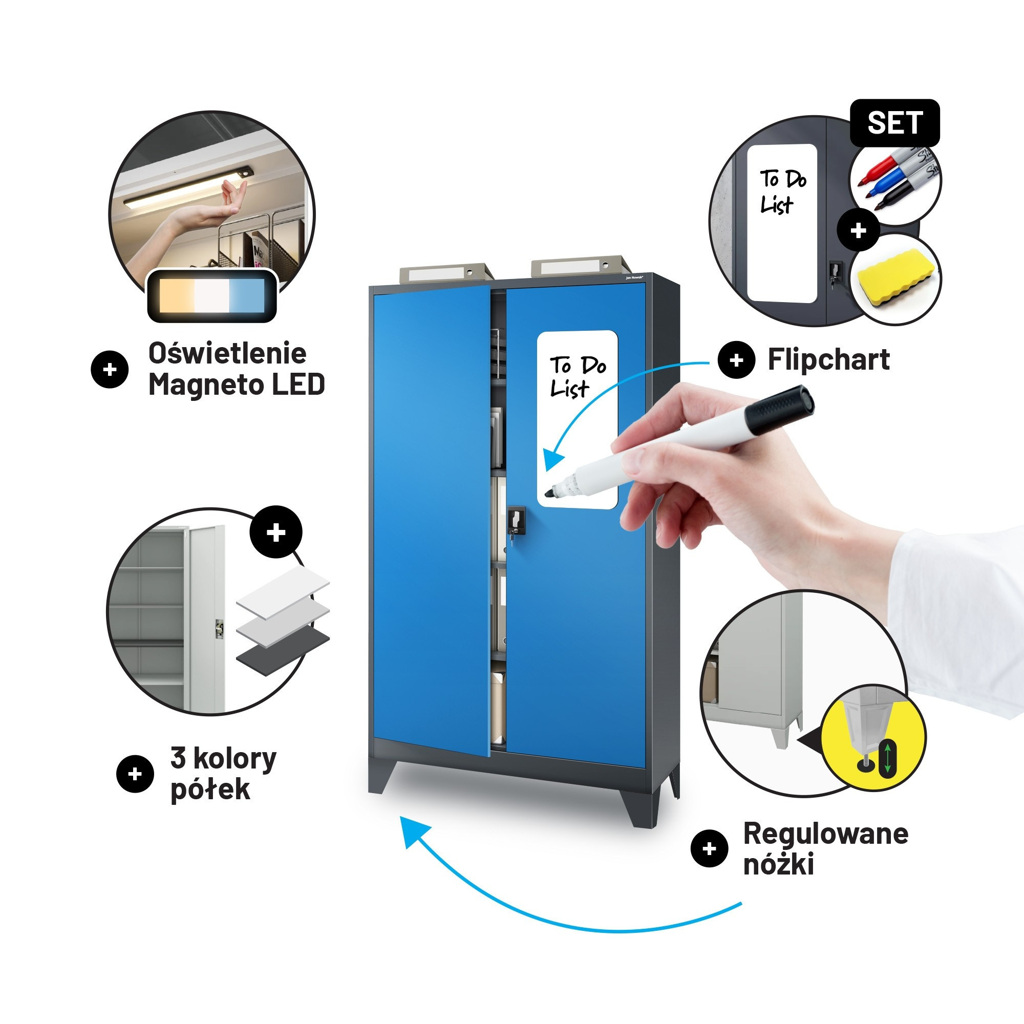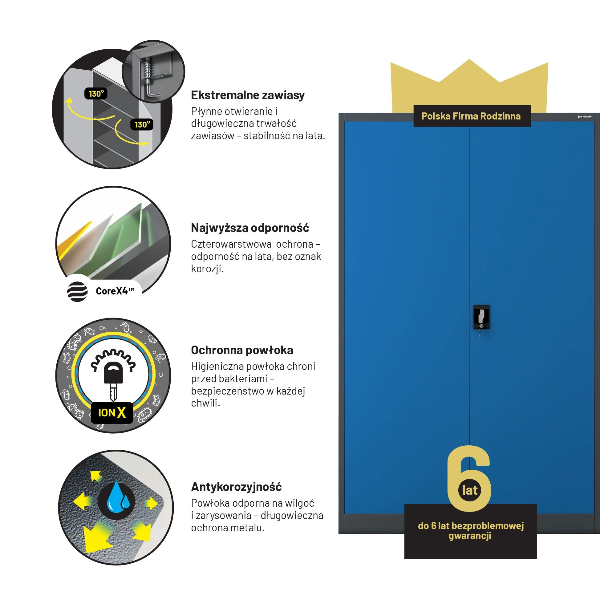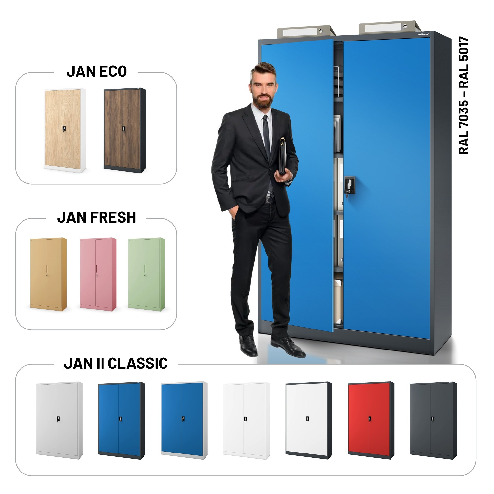 Skříň JAN II – antracitově-modrá Skříň model JAN II – kovová, antracitově-modrá, na dokumenty, nářadí, lékařské vybavení Uzamykatelná ocelová skříň JAN II Kancelářská skříň JAN II je oblíbená mezi zákazníky, kteří ji vybírají pro různé účely – nejen na dokumenty, ale také jako skříň na lékařské vybavení nebo nářadí. Stále častěji nachází uplatnění jako domácí nábytek – ideálně se hodí do moderního, industriálního nebo minimalistického interiéru. Univerzální kovová skříň JAN II do kanceláře do zdravotnického zařízení do dílny do domu Skříň kancelářská JAN II – Hlavní vlastnosti produktu Kancelářská skříň JAN II je kombinací solidního provedení (trvanlivost a spolehlivost) s plnou funkčností. Díky nastavitelným policím přizpůsobíte nábytek svým očekáváním.Naše kovová skříň byla vybavena otvory na zadní a boční stěně, které umožňují její připevnění ke stěně. Zvýší to bezpečnost každodenního používání. Ulož, co chceš Až 60 šanonů nebo jiné předměty – díky nastavitelným policím i velké rozměry. Spěte klidně Dvoukřídlé dveře se zámkem zajištěným ve 3 bodech (2 klíče v sadě). Používej dlouho a bezproblémově Ocel lakovaná práškovou barvou o tloušťce 0,6 mm, odolná vůči mechanickému poškození. Vytvoř si nábytek, jaký potřebuješ. Díky nastavení každých 25 mm přizpůsobíš 4 police svým potřebám. Každá police má nosnost do 50 kg. Kancelářská skříň JAN II – specifikace výška 185 cm šířka 115 cm hloubka 40 cm hmotnost 52 kg barva antracitově-modrá RAL 7016 – RAL 5017 Ještě něco! Záruka kvality Pevné provedení a nejlepší materiály. To je hodnota, kterou je těžké najít jinde na trhu! Nezbytné certifikáty Ocelová skříň na dokumenty JAN II má certifikát PZH. Přizpůsobená GDPR 2018 Skříň na dokumenty JAN II byla navržena tak, aby splňovala požadavky GDPR 2018. Podrobnosti o dodání • produkt k vlastní montáži Kolekce Vyberte si kancelářský nábytek značky – jsme jedním z největších dodavatelů kovových skříní v Evropě. Renomovaný výrobce je zárukou vysoké úrovně kvality.