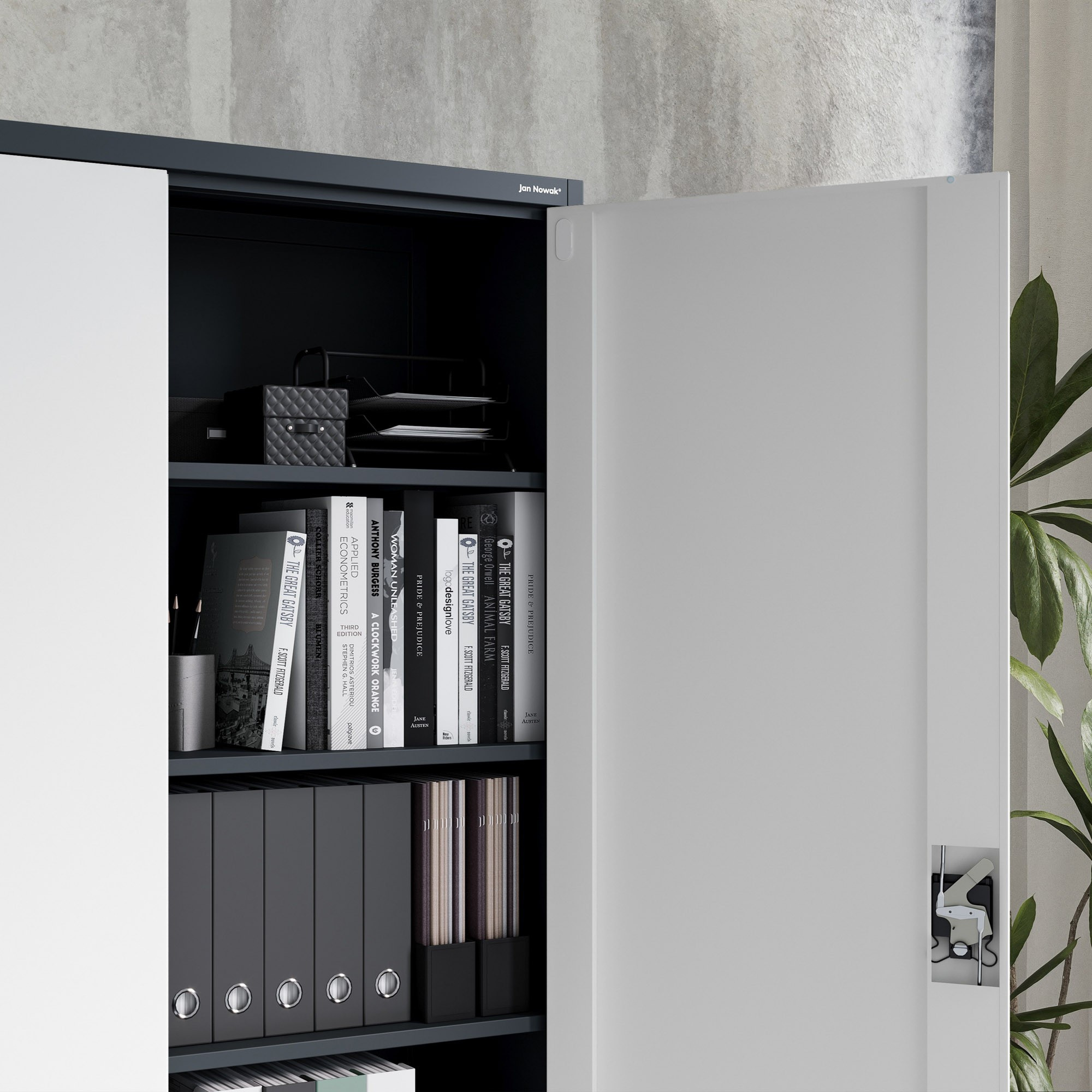 Antracitově-bílá barevná kombinace (RAL 7016 - RAL 9003) dodává skříni JAN II moderní a elegantní vzhled, který se hodí do různých interiérů. Skříň se skvěle hodí do industriálních, minimalistických i klasických prostor.