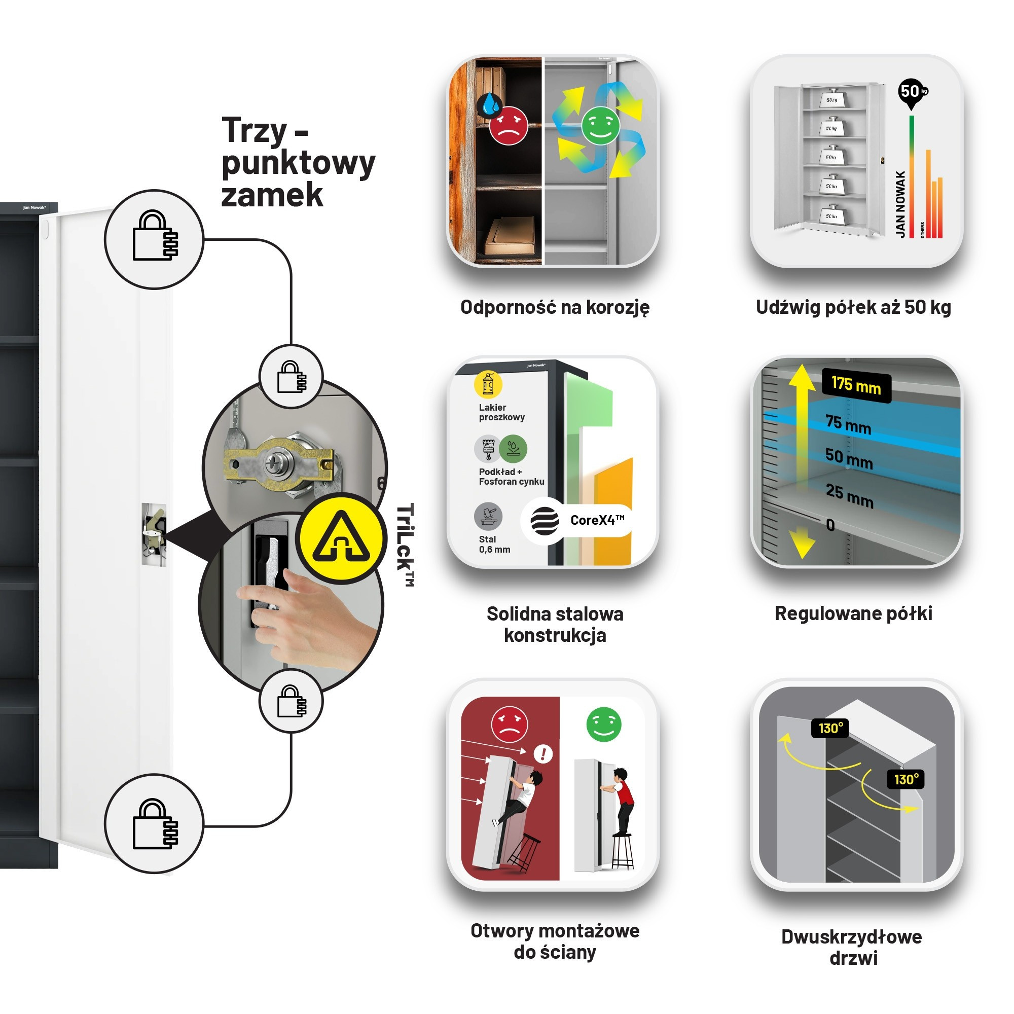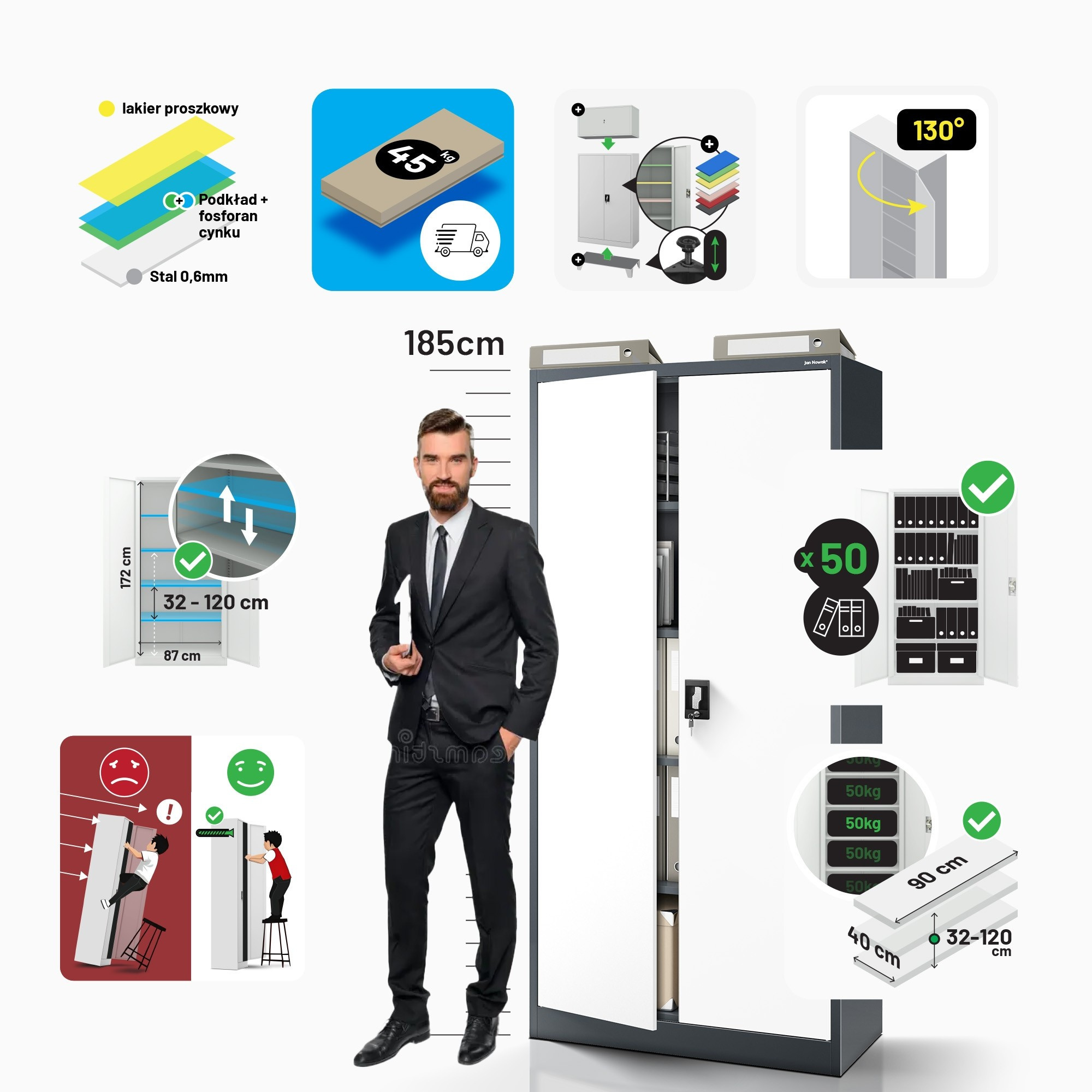 #html-body [data-pb-style=RM40STS]{margin-bottom:30px}#html-body [data-pb-style=JNAL0DU],#html-body [data-pb-style=RM40STS]{justify-content:flex-start;display:flex;flex-direction:column;background-position:left top;background-size:cover;background-repeat:no-repeat;background-attachment:scroll}#html-body [data-pb-style=UV7PGPT]{border-style:none}#html-body [data-pb-style=UMN4CTR],#html-body [data-pb-style=UNUV3PK]{max-width:100%;height:auto}@media only screen and (max-width: 768px) { #html-body [data-pb-style=UV7PGPT]{border-style:none} }Kancelářská skříň JAN – antracitově-bílá Skříň – ocelová, antracitově-bílá, všestranná, na spisy, na léky, na nástroje Uzamykatelná skříň na dokumenty JAN Uzamykatelná skříň na dokumenty JAN je víc než jen skříň na dokumenty. Lze v ní také pohodlně a bezpečně uchovávat léky nebo nástroje. Záleží jen na tobě, jak využiješ tento funkční a trvanlivý nábytek. Skříň využijete jako: kancelářskou skříň pro firmy a úřady lékařskou skříň pro zdravotnická zařízení skříň na nářadí pro dílny a průmyslový sektor Kovovou skříň JAN stále častěji volí i soukromé osoby do svých domovů, kde se velmi inspirativně začleňuje do prostoru s minimalistickým nebo loftovým charakterem. Skříň na dokumenty JAN – Hlavní vlastnosti Skříň na dokumenty JAN je v mimořádně atraktivní antracitově-bílé barvě. Byla vyrobena tak, aby sloužila po mnoho let. Díky nastavitelným policím získáte libovolnou úložnou plochu. prostorná – pojme až 50 standardních šanonů. Naše kovová skříň byla vybavena otvory na zadní a boční stěně, které umožňují její připevnění ke stěně. Zvýší to bezpečnost každodenního používání. Otvor v horní části skříně umožňuje připevnit nástavec. Zadní část naší kovové skříně se skládá ze dvou částí. bezpečná – dvoukřídlé dveře vybavené zámkem zajištěným ve 3 bodech (2 klíče v sadě) odolná – z oceli o tloušťce 0,6 mm, práškově lakovaná a vysoce odolná proti mechanickému poškození inteligentní – 4 přestavitelné, nastavitelné police každých 25 mm, s nosností až 50 kg každá Specifikace – kovová skříň JAN výška 185 cm šířka 90 cm hloubka 40 cm hmotnost 40 kg barva antracitově bílá RAL 7016 - RAL 9003 Proč se vyplatí? Záruka kvality Pevné provedení a nejlepší materiály. To je hodnota, kterou je těžké najít jinde na trhu! Bezpečnost Ocelová skříň na dokumenty nebo léky JAN má certifikát PZH. RODO 2018 Uzamykatelná skříň na spisy JAN je v souladu s RODO 2018. Pamatuj, že kovová skříň JAN je dodávána v částech a vyžaduje vlastní montáž. Kolekce Renomovaný dodavatel je zárukou kvality produktů. Jsme jedním z největších dodavatelů kovových skříní v Evropě, proto zajišťujeme vyšší standardy zákaznického servisu, delší záruky a bezpečnější řešení.