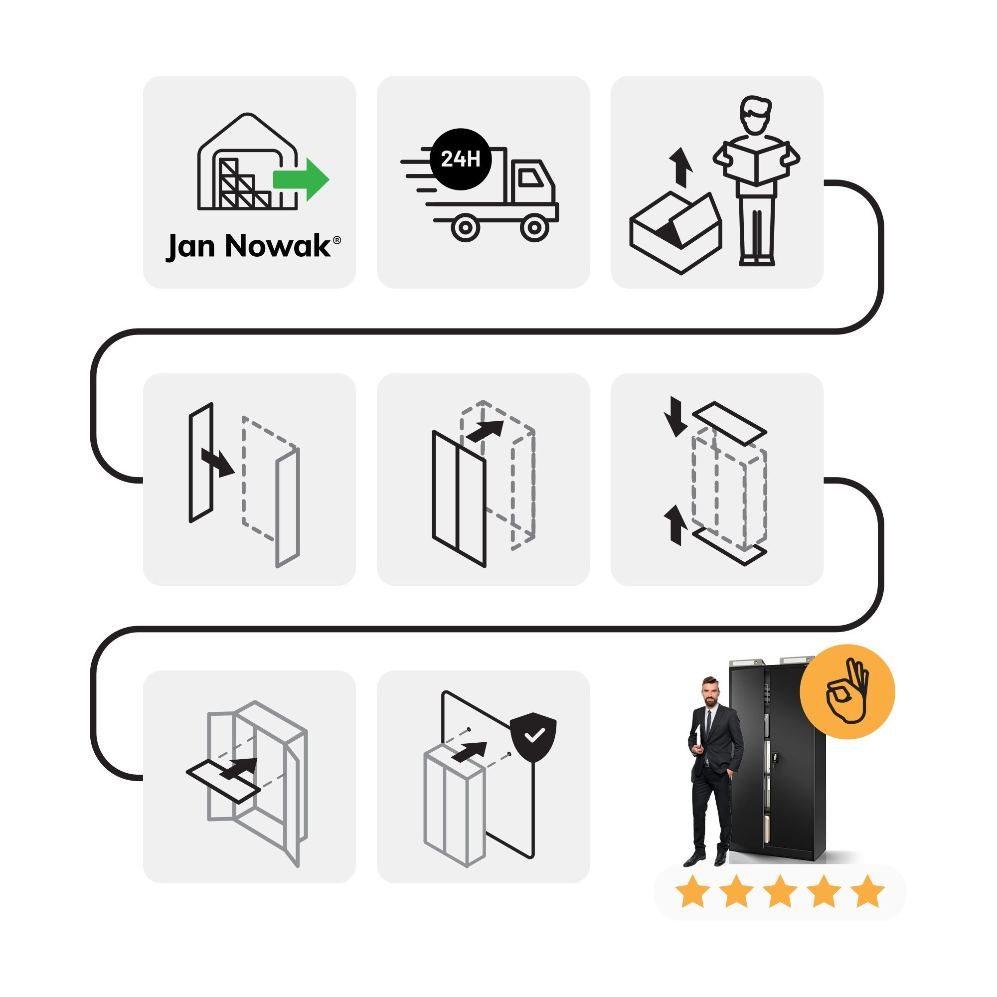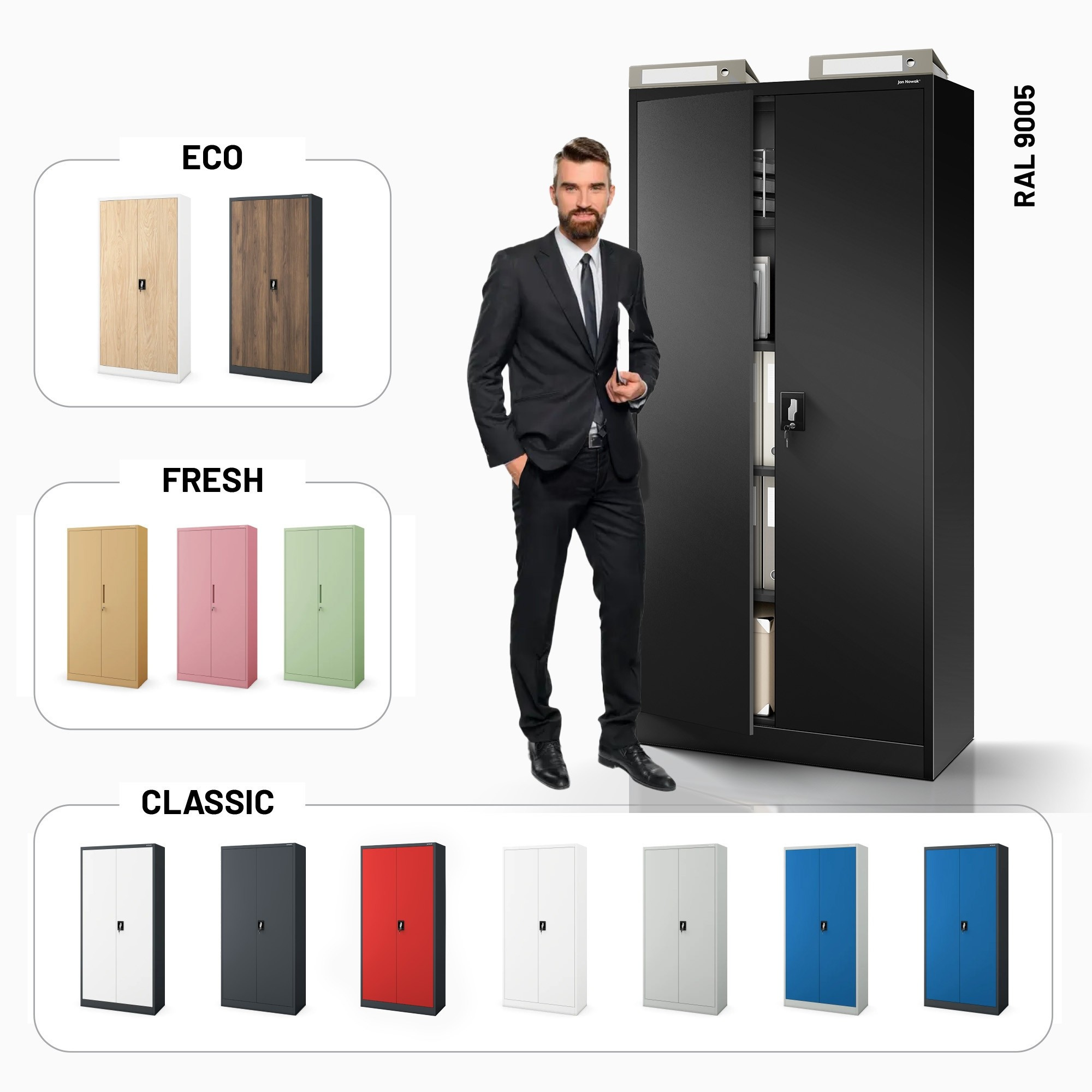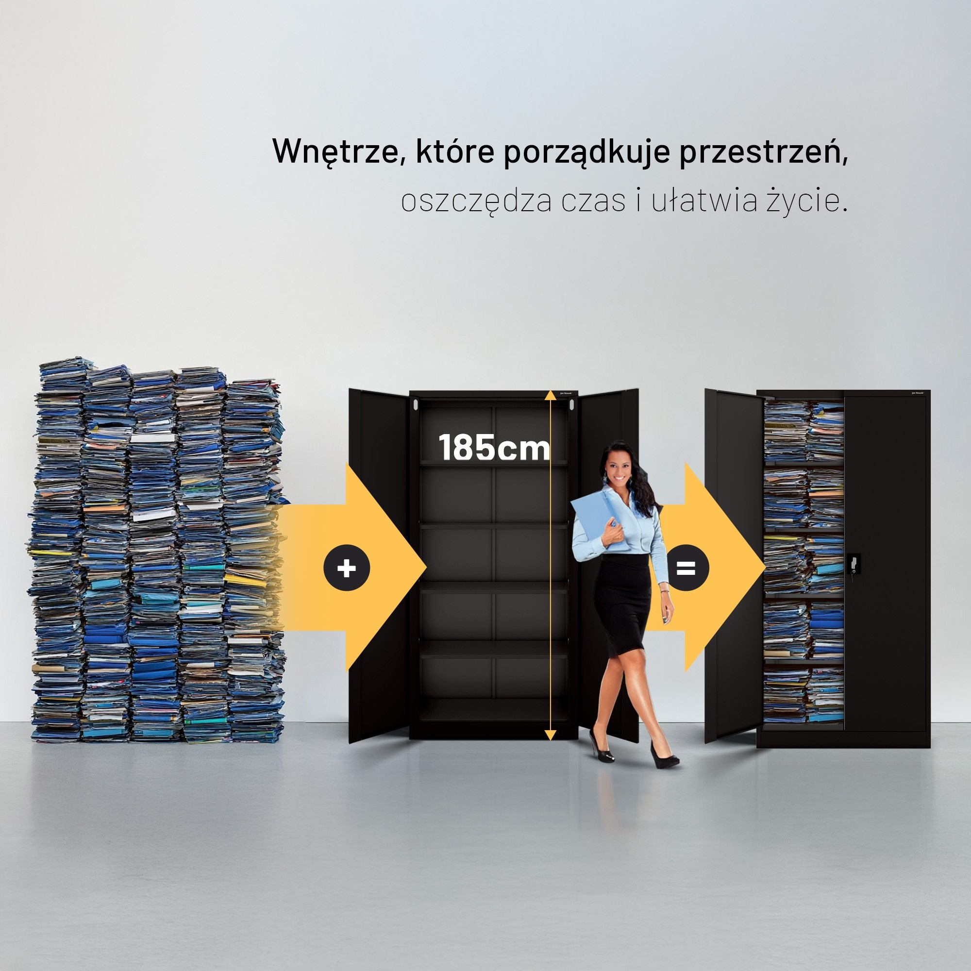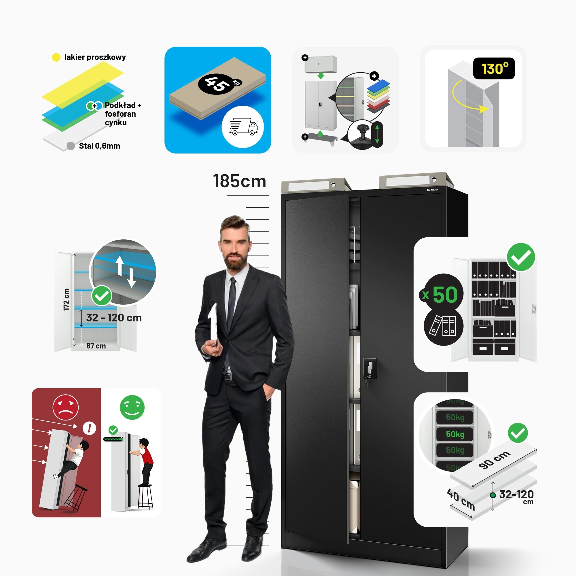 #html-body [data-pb-style=NK39E6M]{margin-bottom:30px}#html-body [data-pb-style=DTF4VM5],#html-body [data-pb-style=NK39E6M]{justify-content:flex-start;display:flex;flex-direction:column;background-position:left top;background-size:cover;background-repeat:no-repeat;background-attachment:scroll}#html-body [data-pb-style=P2FNS1L]{border-style:none}#html-body [data-pb-style=AHEOJU0],#html-body [data-pb-style=OYA4BD9]{max-width:100%;height:auto}@media only screen and (max-width: 768px) { #html-body [data-pb-style=P2FNS1L]{border-style:none} } Kancelářská skříň JAN – černá RAL 9005 Kovová skříň JAN v originální černé barvě je vynikajícím doplňkem kancelářských, kabinetních, lékařských nebo soukromých prostor. Díky své kapacitě, solidnímu provedení a stabilní konstrukci zajistí mnoho let spokojenosti z každodenního používání. Univerzálnost ocelové skříně JAN zajišťuje, že se osvědčí jako: kancelářská skříň lékařská skříň skříň na nářadí Může být také vybavením pro ordinace, sekretariáty, sklady nebo archivy. Dokonale doplní interiér každé místnosti a hodí se jak k tradičnímu, tak modernímu designu. Skříň na dokumenty JAN – všestranná a spolehlivá Model JAN je univerzální ocelová skříň, která zefektivní každodenní práci a umožní udržet dokumenty v nezbytném pořádku. Regulovatelné police každých 25 mm s nosností až 50 kg umožňují přizpůsobit vnitřek individuálním potřebám a kapacita skříně je až 50 šanonů. Dvoukřídlé dveře usnadňují přístup k obsahu, který je navíc chráněn před přístupem neoprávněných osob tříbodovým zámkem. Model JAN byl vyroben z práškově lakované oceli o tloušťce 0,6 mm. Díky tomu je naše kancelářská skříň mimořádně odolná, stabilní a odolná proti poškození. Naše kovová skříň byla vybavena otvory na zadní a boční stěně, které umožňují její připevnění ke stěně. Zvýší to bezpečnost každodenního používání. Otvor v horní části skříně umožňuje připevnit nástavec. Zadní část kovové skříně se skládá ze dvou částí. Specifikace: barva: černá RAL 9005 výška: 185 cm šířka: 90 cm hloubka: 40 cm hmotnost: 40 kg Proč stojí za to? Záruka kvality Kovové skříně značky jsou kryty zárukou kvality, což potvrzuje jejich trvanlivost a nejvyšší kvalitu provedení. Bezpečnost Atest PZH umožňuje volně využívat skříň v rámci provozované činnosti. Soulad s GDPR Uzamykatelná skříň na spisy JAN je v souladu s platnými požadavky GDPR týkajícími se uchovávání dokumentů. Je dobré vědět: Naše kancelářská skříň je dodávána v částech pro vlastní montáž.Kolekce Značka zaručuje nejvyšší kvalitu produktů. Jsme jedním z největších dodavatelů kovových skříní v Polsku a Evropě. Využíváním služeb renomovaného dodavatele se můžete spolehnout na mnoho let spokojenosti s nakoupeným zbožím.