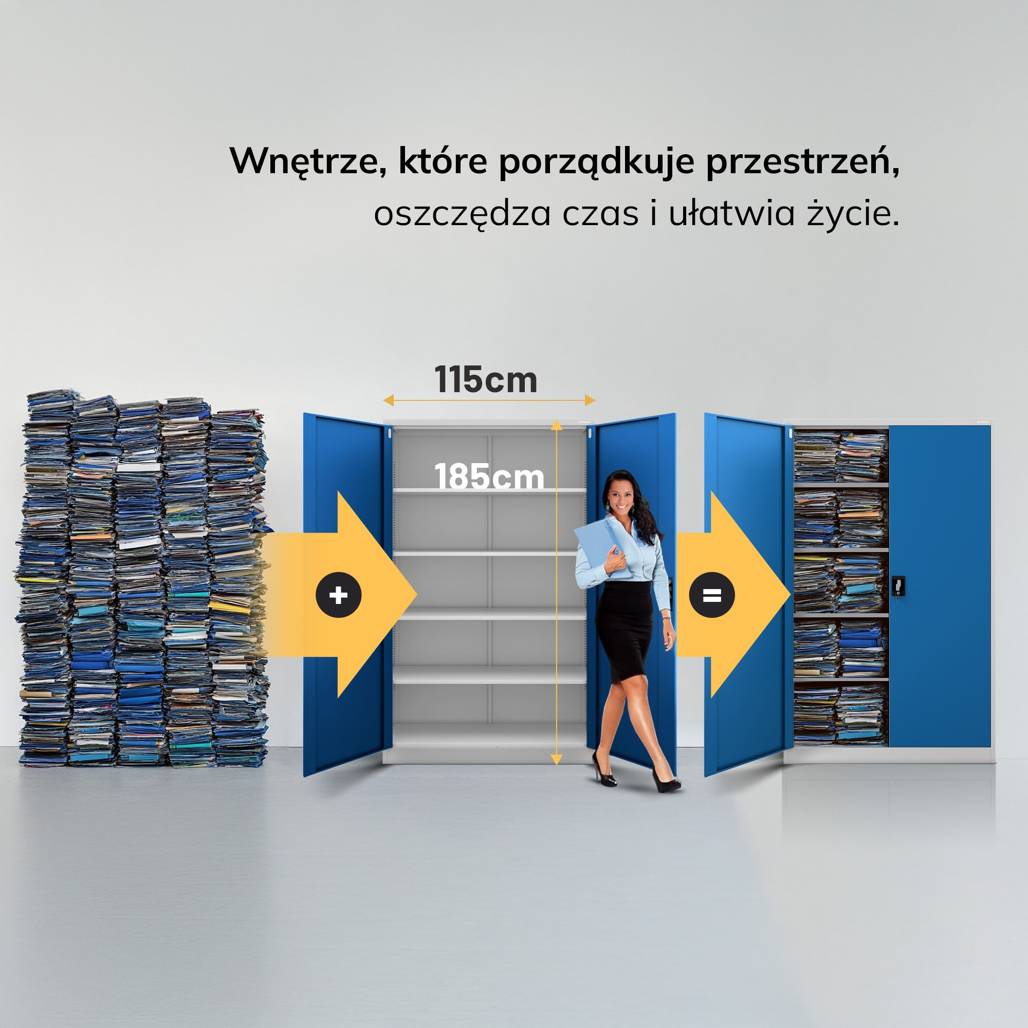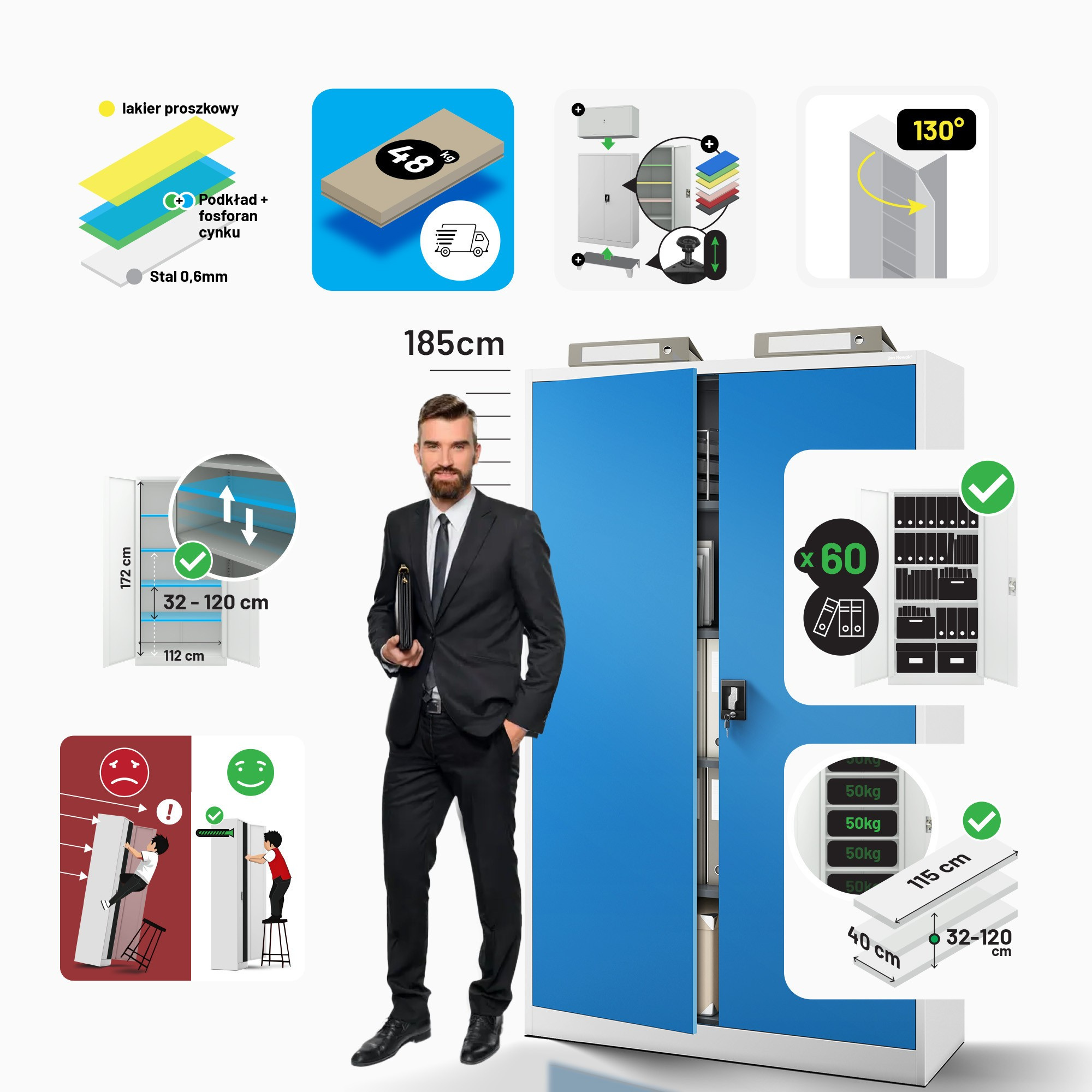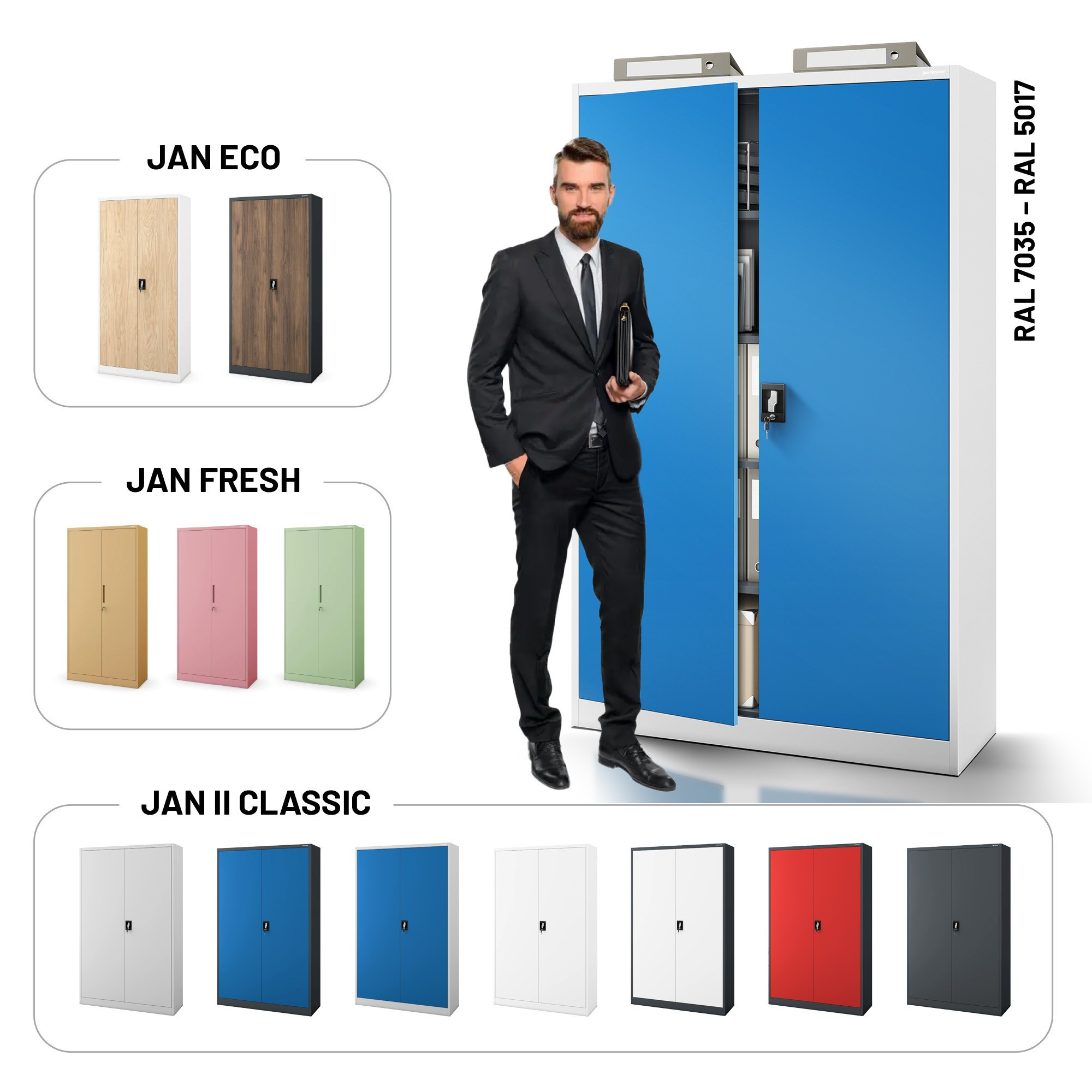 Skříň JAN II – šedo-modrá Skříň model JAN II – ocelová, na dokumenty, léky, nástroje Ocelová skříň na spisy JAN II Ocelová skříň na spisy JAN II je vybírána zákazníky z celé Evropy díky své všestrannosti. Ideálně se hodí jako kancelářský nábytek pro ukládání dokumentů, ale také jako skříň na větší vybavení ve zdravotnických zařízeních nebo dílnách. Zamykatelná kovová skříň JAN II se skvěle hodí jako: skříň na dokumenty (firmy, úřady, školy, kanceláře) lékařská skříň na léky nebo medikamenty (zdravotnická zařízení) skříň na nářadí (výrobní firmy, dílny) Skříň JAN II můžete také směle využít k vybavení domácího interiéru, zejména pokud se jedná o interiér s industriálním, loftovým nebo minimalistickým charakterem. Ocelová skříň JAN II – vlastnosti produktu Ocelová skříň JAN II v šedo-modré barevné kombinaci představuje styl, spolehlivost a funkčnost. Nejenže vypadá skvěle, ale je také odolná a pevná, a její používání je čistá radost. Díky nastavitelným policím si plně přizpůsobíte skříň svým potřebám.Naše kovová skříň byla vybavena otvory na zadní a boční stěně, které umožňují její připevnění ke stěně. Zvýší to bezpečnost každodenního používání. až 60 šanonů nebo větší rozměry, pokud potřebujete zámek uzamykatelný ve 3 bodech (2 klíče v sadě), dvoukřídlé dveře z pevné oceli (tloušťka 0,6 mm), práškově lakované (odolné proti mechanickému poškození) 4 nastavitelné police, nastavitelné každých 25 mm (celková nosnost do 180 kg) Specifikace – uzamykatelná skříň JAN II výška 185 cm šířka 115 cm hloubka 40 cm hmotnost 52 kg barva šedo-modrá RAL 7035 – RAL 5017 Ještě více důvodů, proč si vybrat skříň JAN II Záruka kvality Pevné provedení a nejlepší materiály. To je hodnota, kterou je těžké najít jinde na trhu! Nezbytné certifikace Vyberte produkt s certifikátem PZH. Připraveno na GDPR 2018 Pokud plánujete uchovávat dokumenty, zvolte skříň navrženou v souladu s požadavky GDPR 2018. Podrobnosti o dodání: Samostatná montáž Čitelný návod v balení Kolekce Kancelářský nábytek z kolekce je ceněn v České republice i mimo její hranice za vysokou kvalitu provedení a skutečný zákaznický servis. Ne bez důvodu jsme jedním z největších dodavatelů kovových skříní v Evropě.