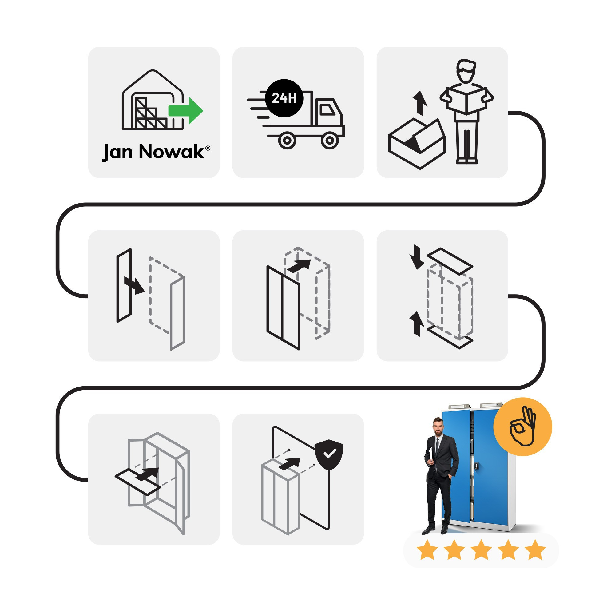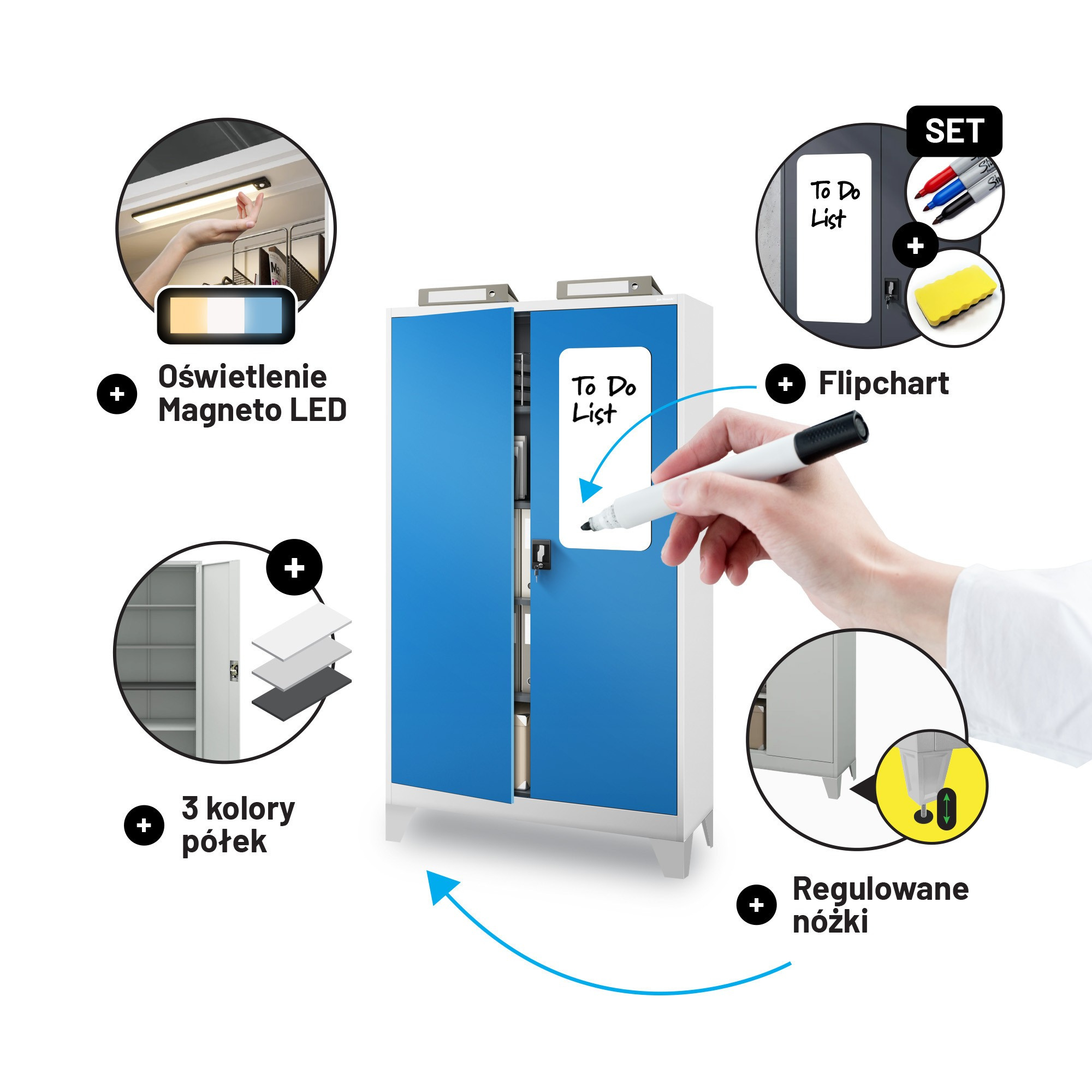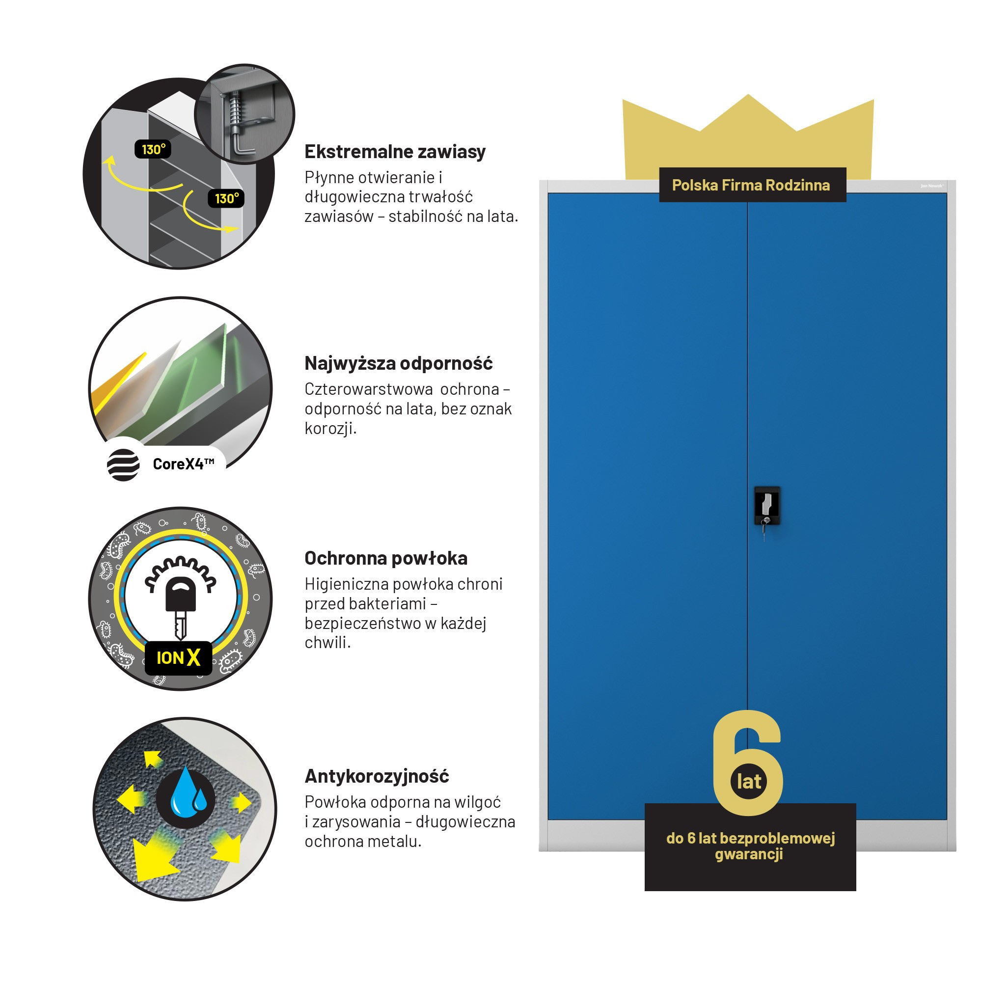 Skříň JAN II – šedo-modrá Skříň model JAN II – ocelová, na dokumenty, léky, nástroje Ocelová skříň na spisy JAN II Ocelová skříň na spisy JAN II je vybírána zákazníky z celé Evropy díky své všestrannosti. Ideálně se hodí jako kancelářský nábytek pro ukládání dokumentů, ale také jako skříň na větší vybavení ve zdravotnických zařízeních nebo dílnách. Zamykatelná kovová skříň JAN II se skvěle hodí jako: skříň na dokumenty (firmy, úřady, školy, kanceláře) lékařská skříň na léky nebo medikamenty (zdravotnická zařízení) skříň na nářadí (výrobní firmy, dílny) Skříň JAN II můžete také směle využít k vybavení domácího interiéru, zejména pokud se jedná o interiér s industriálním, loftovým nebo minimalistickým charakterem. Ocelová skříň JAN II – vlastnosti produktu Ocelová skříň JAN II v šedo-modré barevné kombinaci představuje styl, spolehlivost a funkčnost. Nejenže vypadá skvěle, ale je také odolná a pevná, a její používání je čistá radost. Díky nastavitelným policím si plně přizpůsobíte skříň svým potřebám.Naše kovová skříň byla vybavena otvory na zadní a boční stěně, které umožňují její připevnění ke stěně. Zvýší to bezpečnost každodenního používání. až 60 šanonů nebo větší rozměry, pokud potřebujete zámek uzamykatelný ve 3 bodech (2 klíče v sadě), dvoukřídlé dveře z pevné oceli (tloušťka 0,6 mm), práškově lakované (odolné proti mechanickému poškození) 4 nastavitelné police, nastavitelné každých 25 mm (celková nosnost do 180 kg) Specifikace – uzamykatelná skříň JAN II výška 185 cm šířka 115 cm hloubka 40 cm hmotnost 52 kg barva šedo-modrá RAL 7035 – RAL 5017 Ještě více důvodů, proč si vybrat skříň JAN II Záruka kvality Pevné provedení a nejlepší materiály. To je hodnota, kterou je těžké najít jinde na trhu! Nezbytné certifikace Vyberte produkt s certifikátem PZH. Připraveno na GDPR 2018 Pokud plánujete uchovávat dokumenty, zvolte skříň navrženou v souladu s požadavky GDPR 2018. Podrobnosti o dodání: Samostatná montáž Čitelný návod v balení Kolekce Kancelářský nábytek z kolekce je ceněn v České republice i mimo její hranice za vysokou kvalitu provedení a skutečný zákaznický servis. Ne bez důvodu jsme jedním z největších dodavatelů kovových skříní v Evropě.