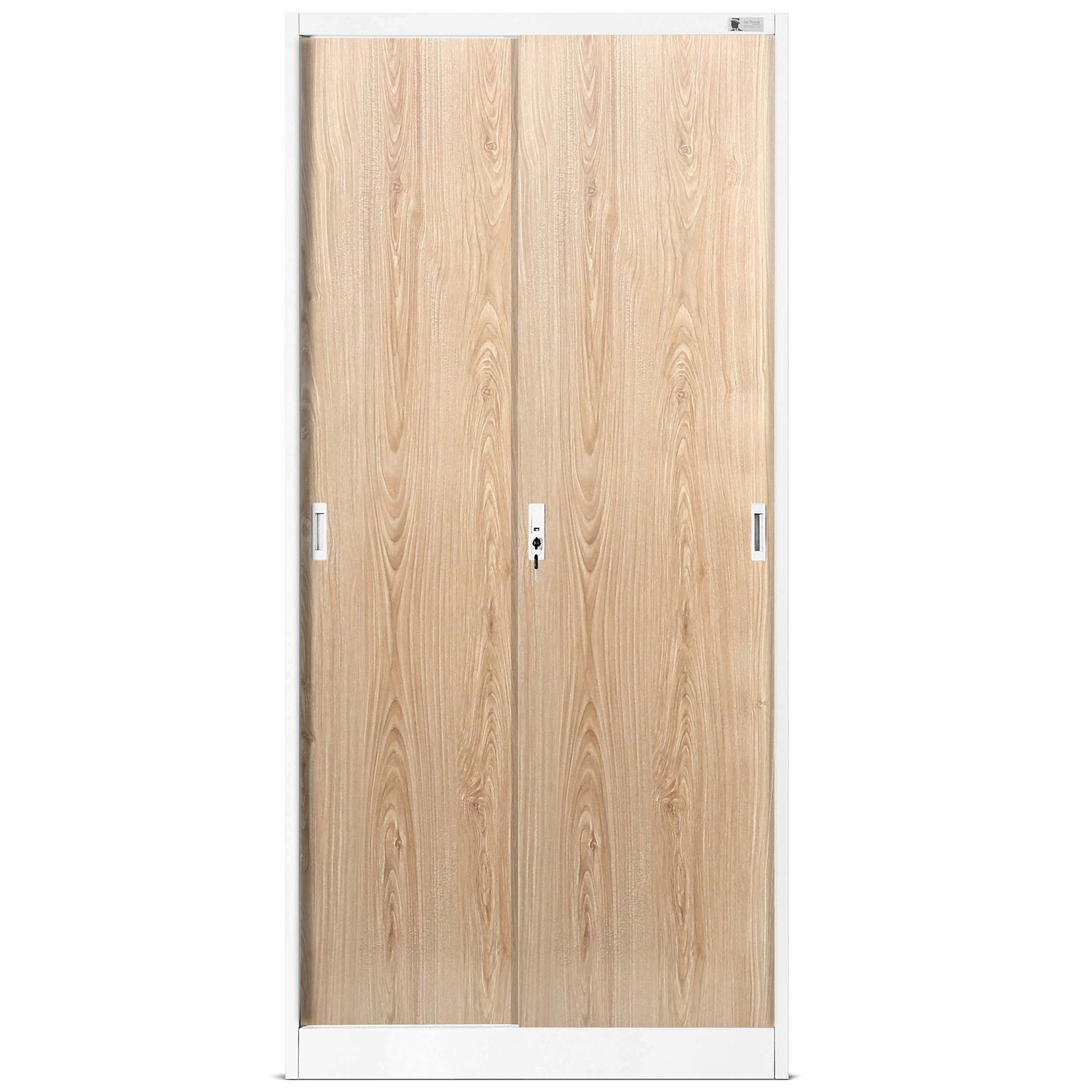 Kancelářská kovová skříň s posuvnými dveřmi KUBA, 900 x 1850 x 400 mm, Eco Design: bílá/ dub sonoma