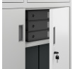 - Samostatně uzamykatelnými moduly: Prosklená vitrína, tři zásuvky, trezor a skříňka – každý modul je chráněn samostatným zámkem.