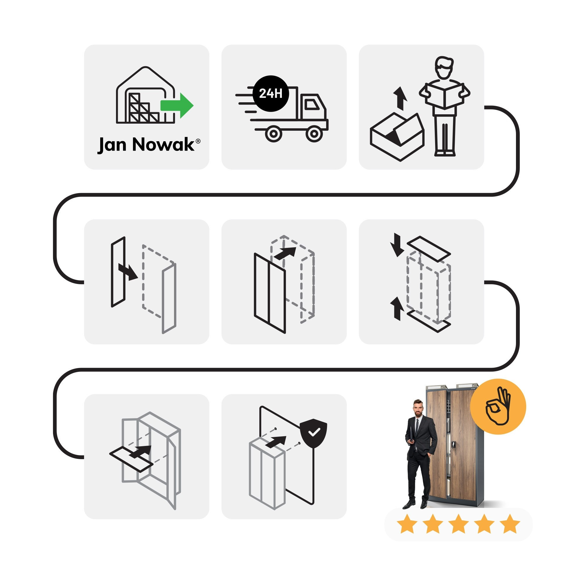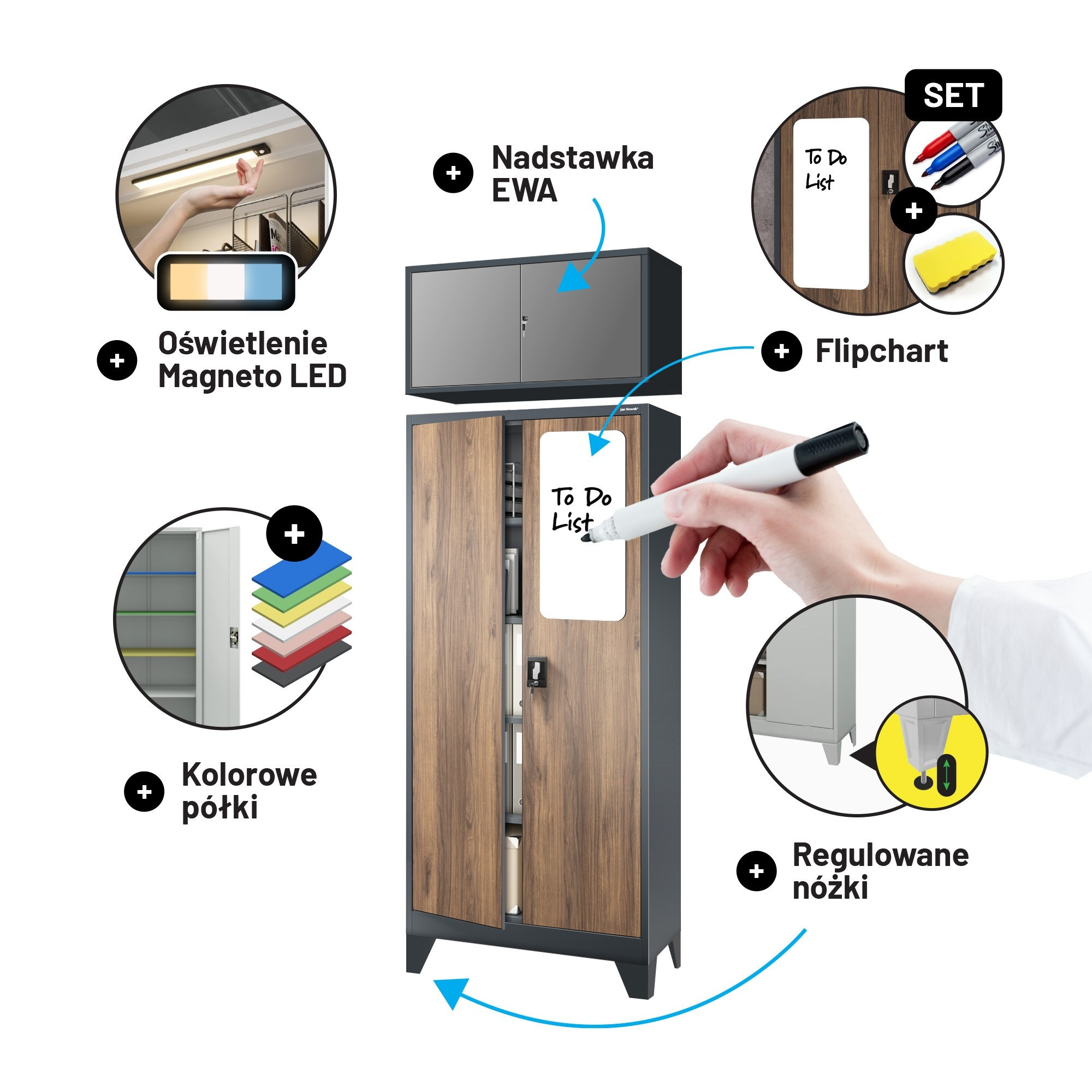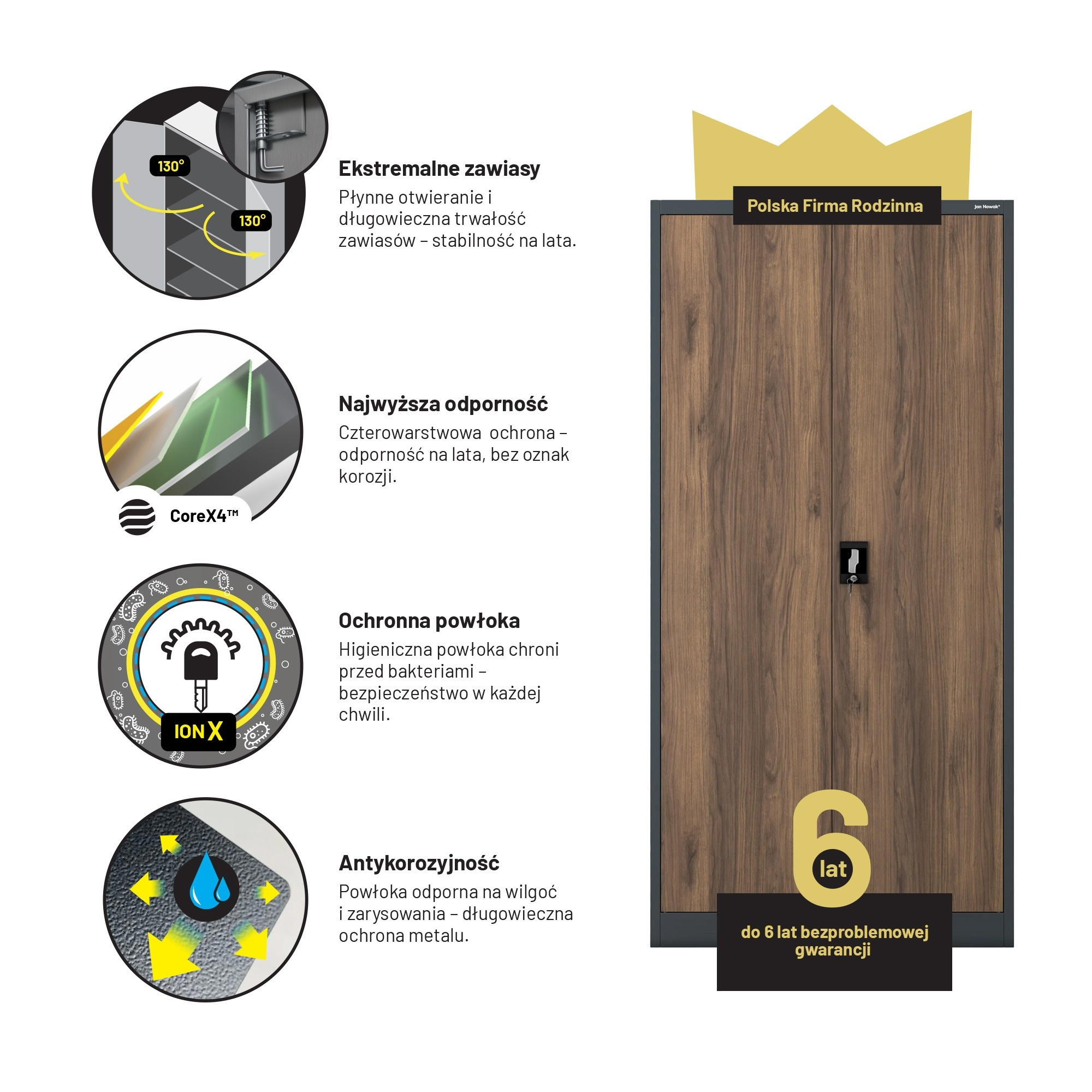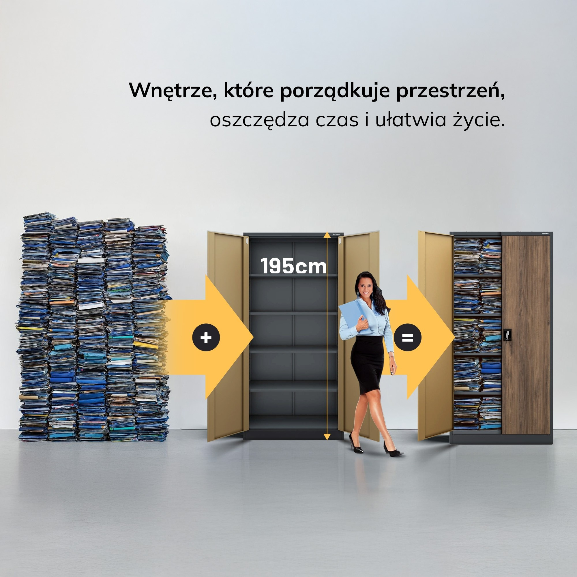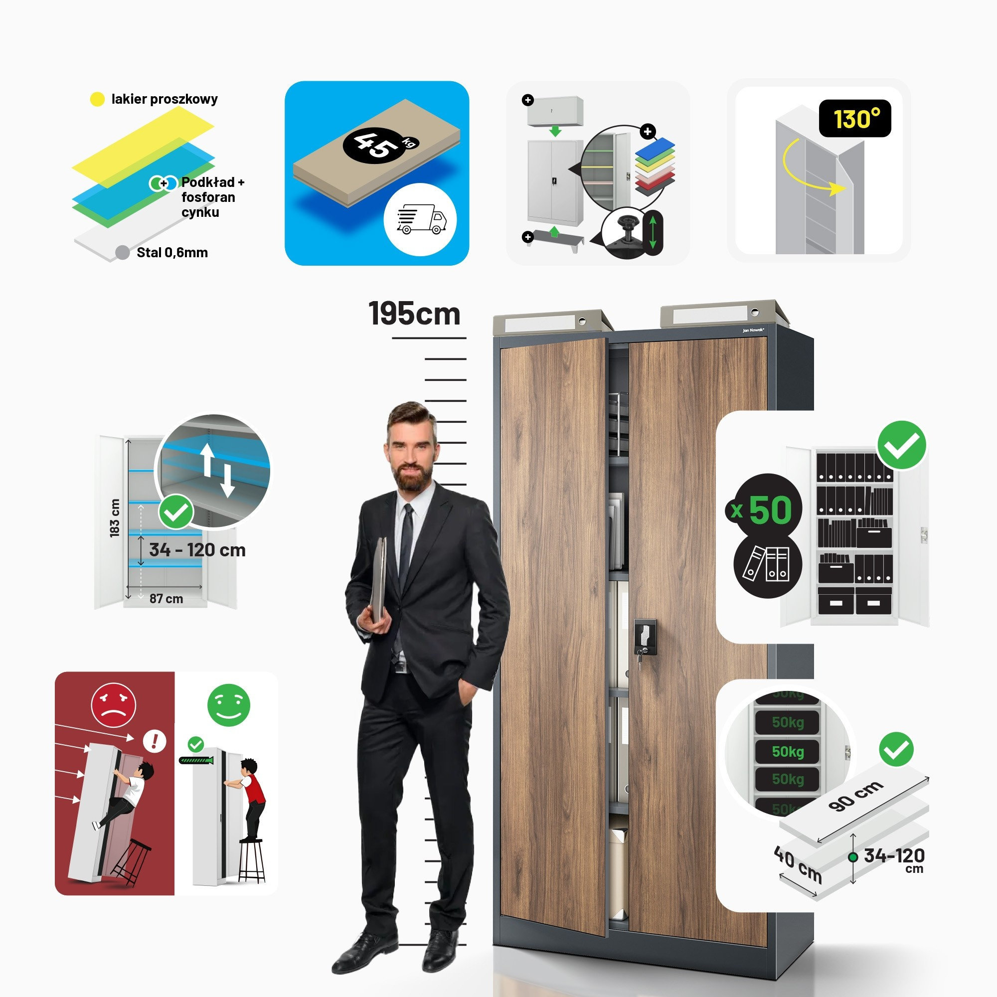 Uzamykatelná kovová skříň Eco Design model JAN H kancelářská skříň / na šanony / 195 cm ANTRACIT (RAL 7016) / OŘECH JAN H – ocelová skříň do kanceláře, do dílny, do pracovny Jan je jeden z nejvšestrannějších modelů ze všech v kolekci. Naše kancelářská skříň vybaví kanceláře, sekretariáty, úřady, soukromé firmy, dílny a dokonce i domácí prostory – její loftový charakter dodá místnosti výraz. JAN ze série Eco Design je neobyčejná kancelářská skříň. Jeho dvířka pokrývá speciální, odolná proti oděru ekologická barva, která připomíná ořechové dřevo. Tuto výjimečnou, přírodou inspirovanou kolekci jsme vytvořili pro ty, kteří v nábytku hledají neotřelá, a přitom elegantní řešení, aniž by se chtěli vzdát odolnosti, kterou se vyznačuje kovová skříň. Skříň na dokumenty JAN H – revoluce na každém místě Kovová skříň musí být prostorná a praktická – přesně taková, jako Jan H! Naše kancelářská skříň usnadní a zefektivní každodenní práci na každém místě. Regulovatelné police Jana H každých 25 mm lze snadno přizpůsobit individuálním potřebám. Nosnost každé z polic je až 50 kg a kapacita celé skříně je až 50 šanonů.Jan H umožňuje ukládat dokumenty v souladu s platnými předpisy GDPR. Model JAN H byl vybaven silným zámkem zajištěným ve 3 bodech (se dvěma klíči v sadě), takže dokonale zabezpečí uložený obsah. Konstrukce Jana H je vyrobena z práškově lakované oceli o tloušťce 0,6 mm. Díky tomu je odolná vůči mechanickému poškození a intenzivnímu používání. Solidně spojené prvky zajišťují, že naše kancelářská skříň zůstává stabilní i při maximálním zatížení. Jan H má otvory na zadní a boční stěně, které umožňují připevnění ke stěně místnosti. Díky tomu naše kovová skříň zaručuje nezbytnou bezpečnost při každodenním používání. Dodatečně otvory v horní části skříně umožňují připevnit nástavec. Skříň kovová JAN H - specifikace Výška: 195 cm Šířka: 90 cm Hloubka: 40 cm Hmotnost: 41 kg Barva: antracit (RAL 7016) / ořech Proč důvěřovat značce JAN NOWAK? Záruka kvality - nejlepší materiály a žádné kompromisy ve zpracování. JAN H má certifikát PZH. Naše kancelářská skříň bude bezpečná pro vaše klienty nebo zaměstnance. Dokumenty obsahující osobní údaje budeš uchovávat v souladu s platnými pravidly GDPR. Naše kancelářská skříň je dokonale zabezpečená. Důležité: Naše kovová skříň vyžaduje vlastní montáž.V sadě se nachází srozumitelný návod. Kolekce Značka je jedním z největších výrobců a dodavatelů kovových skříní v celé Evropě.
