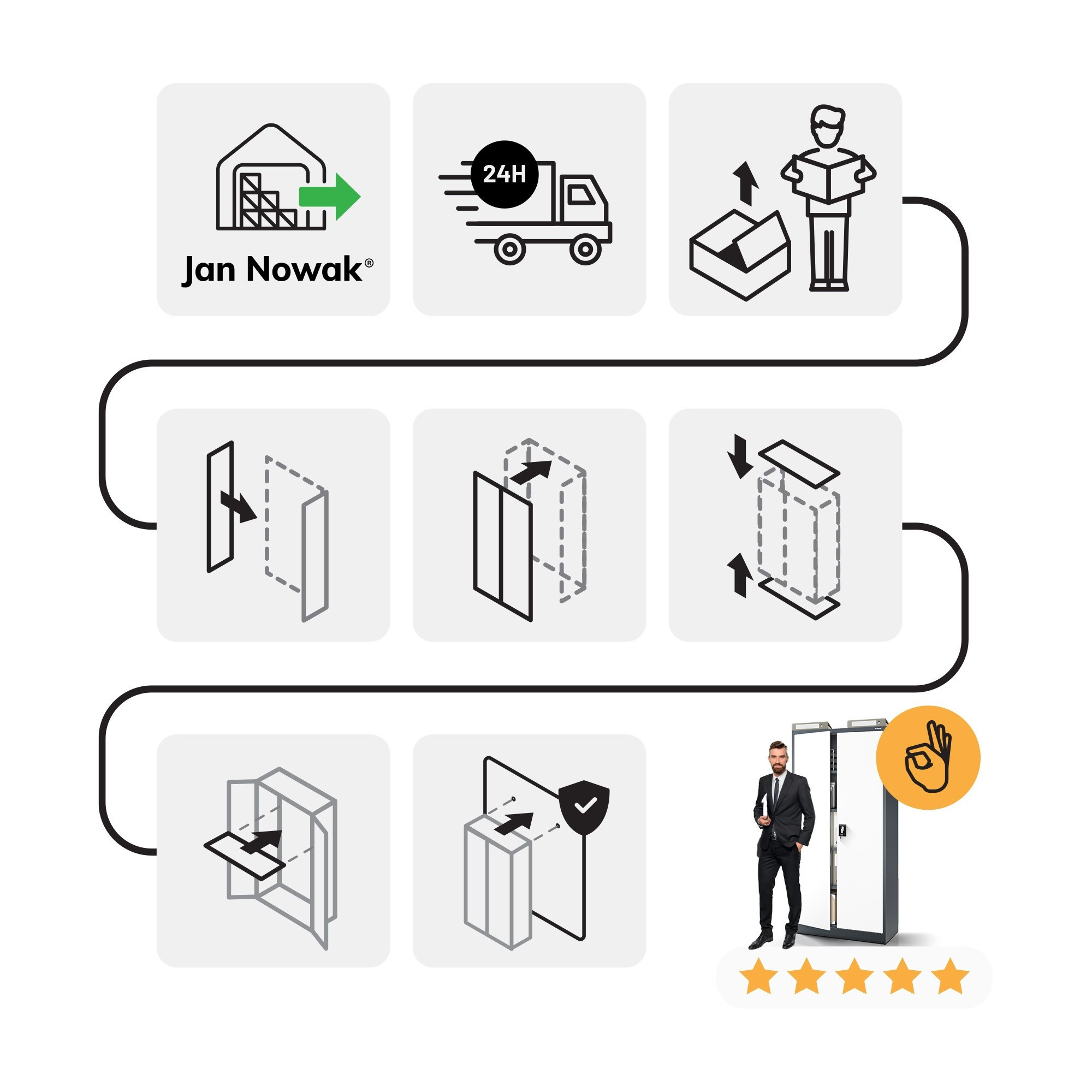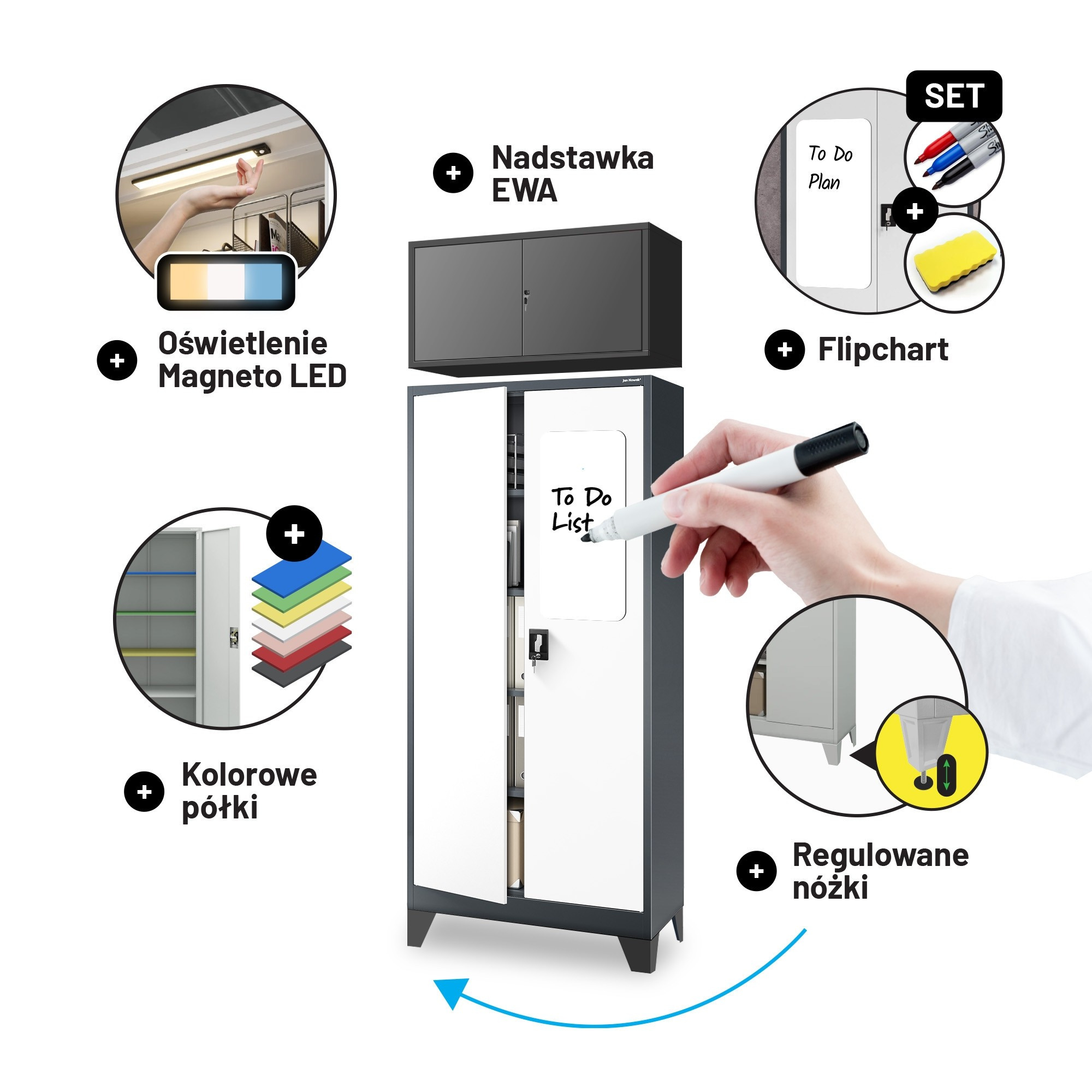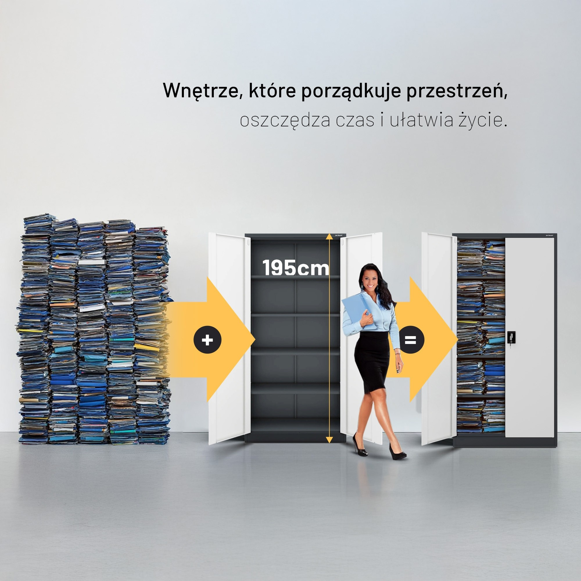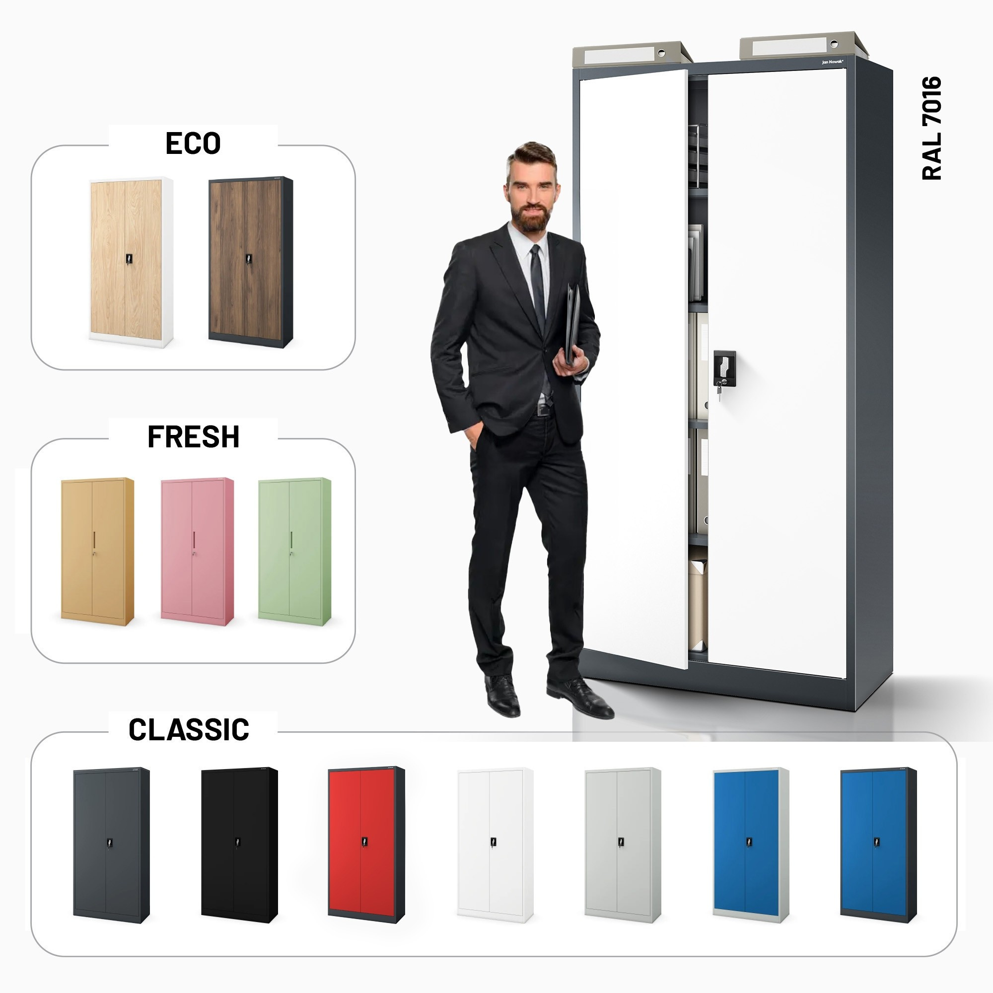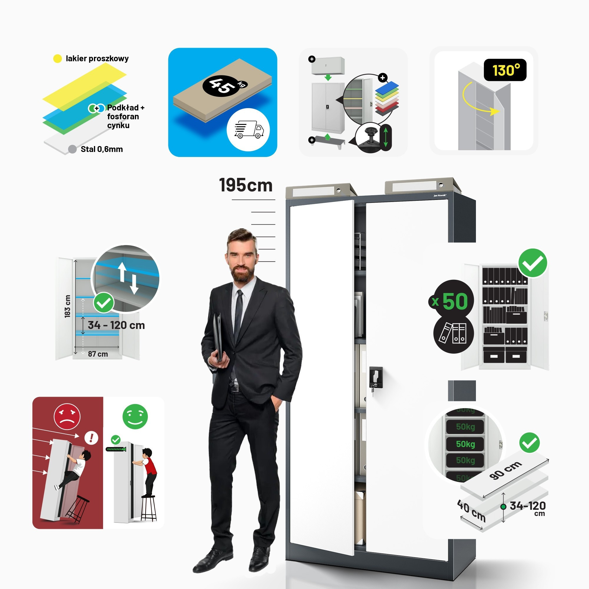 Skříň JAN H – antracitově-bílá Skříň model JAN H – kovová, antracitově-bílá, univerzální, na spisy, léky, nástroje Uzamykatelná skříň na spisy JAN H Uzamykatelná skříň na spisy JAN H je vynikající kancelářský nábytek na dokumenty – stylový, prostorný, funkční a přizpůsobený GDPR 2018. Pokud však potřebujete skříň na léky nebo nástroje, skříň JAN H bude také velmi dobrým výběrem. Skříň ideální pro: kanceláře, firmy a úřady zdravotnická zařízení dílny a průmyslový sektor domácnosti Kovová skříň JAN H – nejdůležitější vlastnosti Kovová skříň JAN H ve stylové antracitovo-bílé barvě se vyznačuje trvanlivostí provedení a spolehlivostí. Díky libovolné regulaci polic získáte takovou plochu k ukládání, jakou potřebujete. Naše kovová skříň byla vybavena otvory na zadní a boční stěně, které umožňují její připevnění ke stěně. Zvýší to bezpečnost každodenního používání. Otvor v horní části skříně umožňuje připevnit nástavec. kapacita – až 50 standardních pořadačů bezpečnost – dvoukřídlé dveře se zámkem uzamykatelným ve 3 bodech (2 klíče v sadě) odolnost – ocel o tloušťce 0,6 mm, odolná proti mechanickému poškození, práškově lakovaná funkčnost – 4 přestavitelné, nastavitelné police každých 25 mm (nosnost do 50 kg každá) Skříň kovová JAN H – parametry produktu výška 195 cm šířka 90 cm hloubka 40 cm hmotnost 44 kg barva antracitově-bílá RAL 7016 - RAL 9003 Výhody Záruka kvality - Zaměřujeme se na kvalitu produktů, proto dbáme na to, aby byly trvanlivé a spolehlivé. Atest PZH - naše kovové skříně vybavujeme příslušnými certifikáty, aby jejich používání bylo zcela bezpečné. GDPR 2018 - uzamykatelná, kovová skříň na dokumenty JAN H byla plně přizpůsobena nařízení GDPR 2018. Šatní skříň JAN H vyžaduje vlastní montáž (je dodávána v částech).Kolekce Nábytek zahrnutý v kolekci je zárukou nejvyšší kvality poskytované jedním z největších dodavatelů kovových skříní v Evropě.