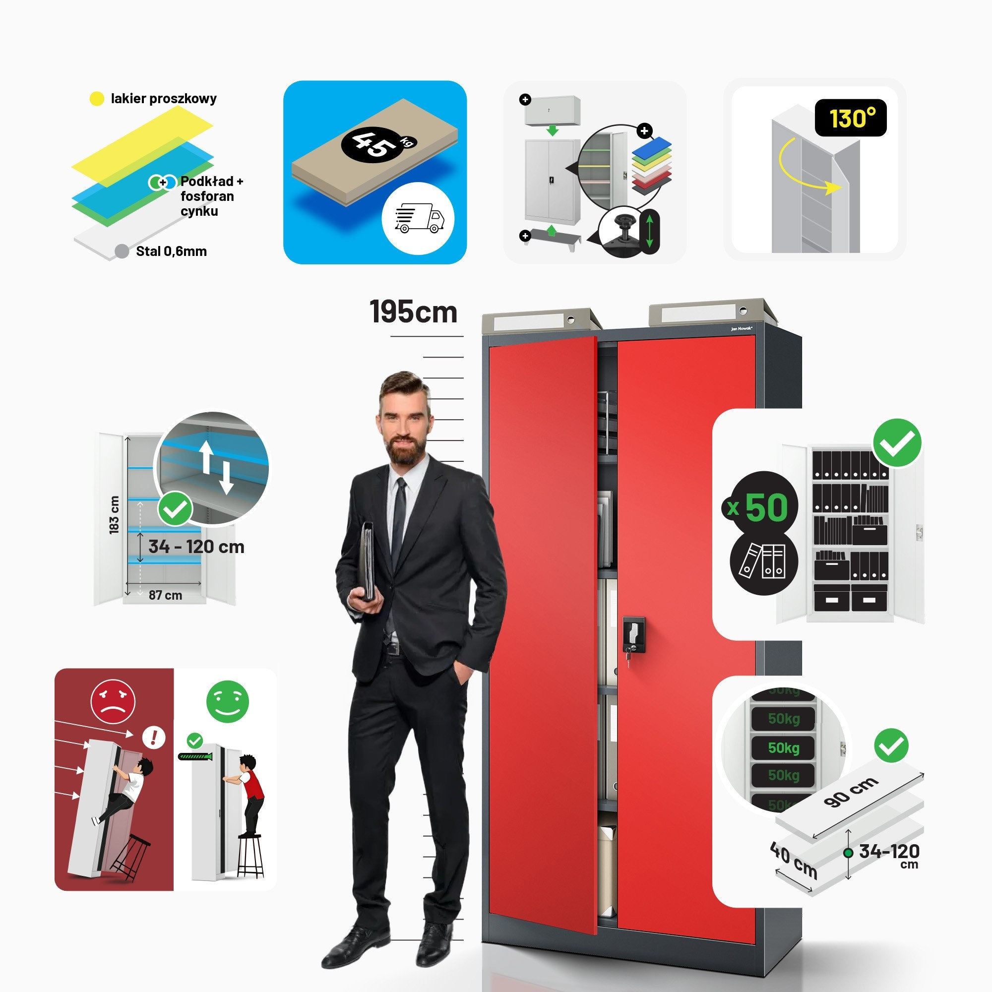 Skříň JAN H – antracitově-červená Skříň model JAN H – kovová, do kanceláře, dílny, na léky, antracitově-červená Ocelová uzamykatelná skříň JAN H Ocelová uzamykatelná skříň JAN H z kolekce je produkt 100% propracovaný z hlediska designu, trvanlivosti a spolehlivosti. Je také navržen tak, aby plnil mnoho různých funkcí, díky čemuž v něm lze uchovávat nejen dokumenty, ale i mnoho dalších věcí, včetně nástrojů či léků. skříň do kanceláře, úřadu, firmy skříň do zdravotnických zařízení skříň do dílen Individuální zákazníci také rádi objednávají kovovou skříň JAN H díky jejímu industriálnímu charakteru, který se skvěle hodí do módních, loftových interiérů. Skříň na dokumenty JAN H – čím se liší od ostatních produktů? Naše kovová skříň byla vybavena otvory na zadní a boční stěně, které umožňují její připevnění ke stěně. Zvýší to bezpečnost každodenního používání. Otvor v horní části skříně umožňuje připevnit nástavec. Skříň na dokumenty JAN H v výrazné barevné kombinaci antracitově-červené je spolehlivá konstrukce, která bude po mnoho let sloužit k pohodlnému ukládání. Díky nastavitelným policím si můžete přizpůsobit její vnitřek podle svých potřeb. Pojemná S lehkostí pojme až 50 šanonů. Zajišťující bezpečnost Zámek uzamykatelný ve 3 bodech (2 klíče v sadě). Odolná Vysoce kvalitní ocel odolná proti mechanickému poškození, o tloušťce 0,6 mm. Funkční 4 police nastavitelné každých 25 mm, každá s nosností do 50 kg. Kovová uzamykatelná skříň JAN H: výška 195 cm, šířka 90 cm, hloubka 40 cm, hmotnost 44 kg, antracitově-červená barva RAL 7016 – RAL 3020 Využijte! Záruka kvality - Pevné provedení a nejlepší materiály. To je hodnota, kterou je těžké najít jinde na trhu! Certifikát PZH, který potvrzuje bezpečnost každodenního používání. Z přizpůsobení GDPR 2018 Skříň je dodávána v částech (vyžaduje vlastní montáž). Kolekce kancelářského nábytku Jsme jedním z největších dodavatelů ocelových skříní v Evropě. Dokonalá reputace nás zavazuje k péči o nejvyšší standardy kvality produktů a zákaznického servisu.