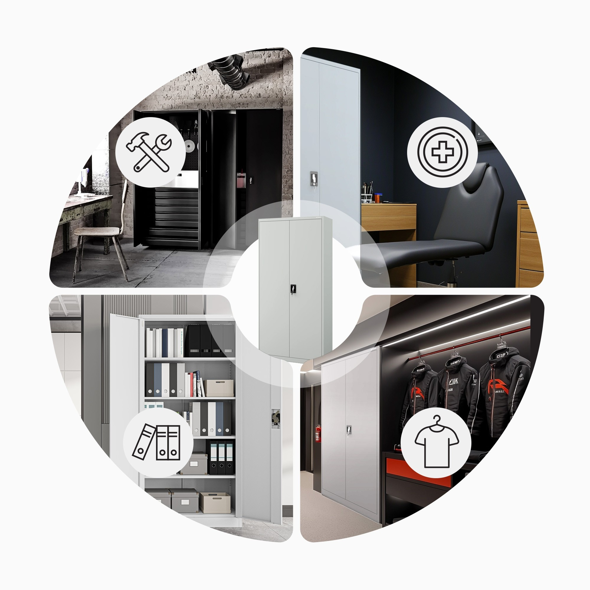 Kancelářská skříň JAN H – bílá Skříň model JAN H – kovová, bílá, na dokumenty, lékařská, na nářadí JAN H – kovová uzamykatelná skříň JAN H se nebojí žádné výzvy. Přiřaď mu takovou roli, jakou chceš, a on splní Tvá očekávání, ať už to bude ukládání dokumentů, nástrojů nebo léků. Nejčastější použití: kancelářská skříň lékařská skříň skříň na nářadí A možná byste ji chtěli využít doma? Nejsou žádné kontraindikace! Mnoho našich zákazníků si vybírá ocelovou skříň JAN H právě do svých domovů. Zejména model v bílé barvě se hodí do minimalistických, industriálních nebo skandinávských interiérů. Skříň na dokumenty JAN – vlastnosti produktu Skříň na dokumenty JAN je esteticky zpracovaná a bílá barva se dokonale hodí do každého prostředí. Pokud vám záleží na tom, aby byl nábytek maximálně odolný a spolehlivý, tento produkt je nejlepší volbou. Při jeho navrhování jsme se snažili, aby byl co nejvíce funkční. Proto můžete libovolně tvarovat vnitřek skříně – přizpůsobte vzdálenosti mezi policemi podle svých potřeb.Naše kovová skříň byla vybavena otvory na zadní a boční stěně, které umožňují její připevnění ke stěně. Zvýší to bezpečnost každodenního používání. Otvor v horní části skříně umožňuje připevnit nástavec. prostorná – pojme až 50 standardních pořadačů, poskytuje pocit bezpečí – dvoukřídlé dveře se zámkem uzamykatelným ve 3 bodech (k produktu přikládáme 2 klíče) odolná – silná ocel o tloušťce 0,6 mm, odolná proti mechanickému poškození, práškově lakovaná přizpůsobující se vašim potřebám – 4 nastavitelné police, nastavitelné po 25 mm, každá s nosností až 50 kg Parametry produktu – uzamykatelná ocelová skříň JAN výška 195 cm šířka 90 cm hloubka 40 cm hmotnost 44 kg barva bílá RAL 9003 Kancelářská skříň JAN H – proč stojí za to? Záruka kvality – Pevné provedení a nejlepší materiály. To je hodnota, kterou je těžké najít jinde na trhu! Odpovídající certifikáty – vybírejte certifikované produkty, univerzální uzamykatelná skříň JAN H má certifikát PZH Shoda s GDPR 2018 – pokud uchováváte dokumenty, pořiďte si kancelářský nábytek splňující stanovené požadavky Standardně dodáváme ocelovou uzamykatelnou skříň v částech, takže vyžaduje vlastní montáž. Kolekce Kancelářský nábytek – kvalita a renomé jednoho z největších dodavatelů kovových skříní v Evropě.